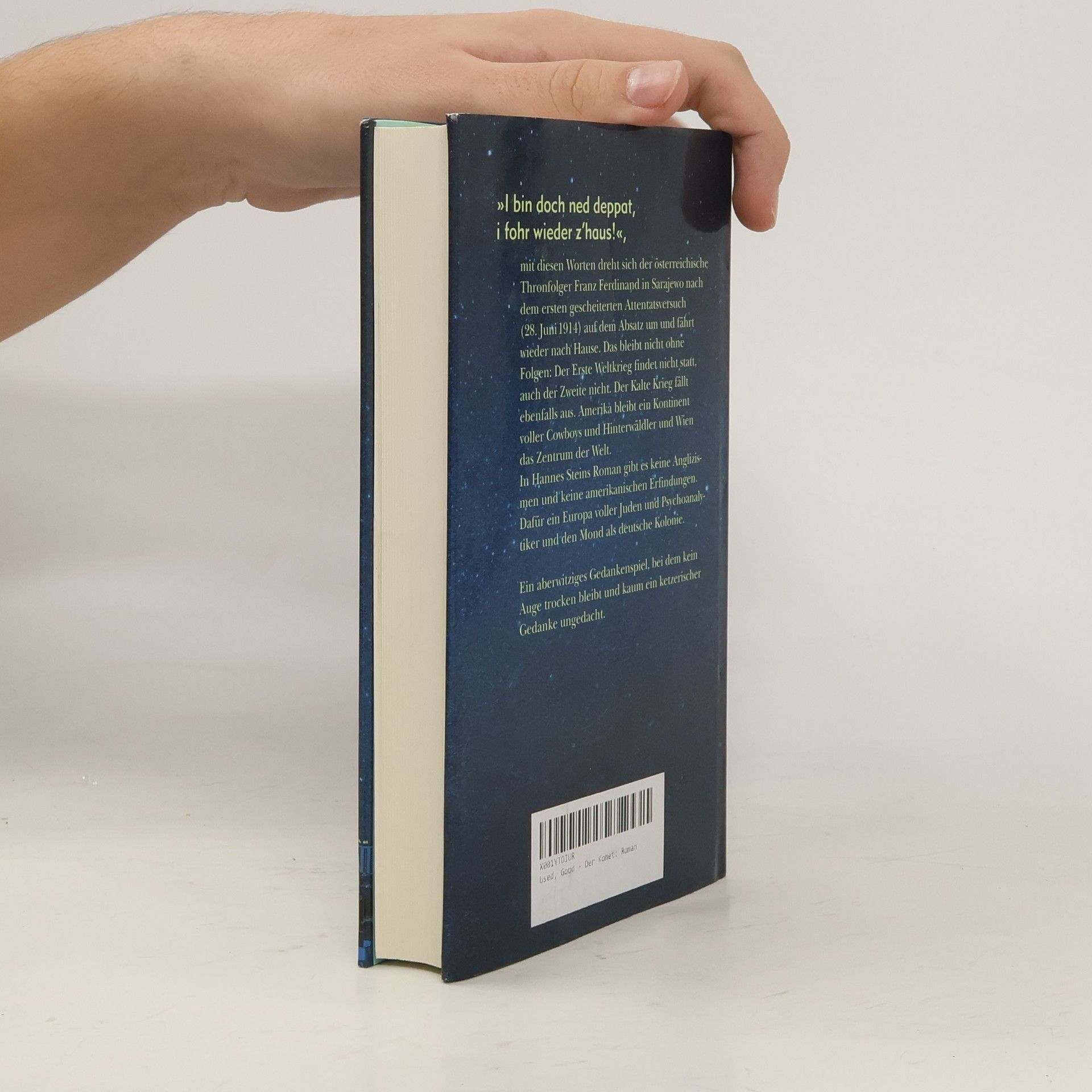 Der Erste Weltkrieg hat nicht stattgefunden, Amerika ist Kontinent der Hinterwäldler: In diesem Roman gibt es keine Anglizismen, keine amerikanischen Erfindungen und keinen Krieg. Dafür ein Europa voller Juden, den Mond als deutsche Kolonie und Wien als Zentrum der Welt. »I bin doch ned deppat, i fohr wieder z'haus« lautet der Schlüsselsatz dieses Buches – denn damit fällt in Hannes Steins Roman der Erste Weltkrieg aus. Gesprochen wird der Satz vom österreichischen Thronfolger Franz Ferdinand am 28. Juni 1914 in Sarajewo, wo gerade jemand versucht hat, eine Bombe auf ihn zu werfen. Das hat natürlich Folgen: denn ohne den Ersten Weltkrieg gibt es auch keinen Zweiten und keinen Kalten Krieg, keine Entkolonialisierung und keine Kollision mit dem Islam. Die europäischen Staaten versuchen ihre komplizierte Machtbalance zu erhalten – augusteischer Frieden herrscht auf der Welt. Amerika ist ein zurückgebliebener Kontinent voller Cowboys, Goldgräber und Hinterwäldler; Europa bleibt das vorherrschend von Monarchen regierte Maß aller Dinge. Vor allem: Das liebenswerte, etwas bräsige k.u.k.-Reich mit seiner Hauptstadt Wien ist und bleibt der Nabel der Welt. Hier, in der Hauptstadt des Vielvölkerreichs, dieser Stadt voller Juden, Psychoanalytiker und Wiener Schmäh, spielt Hannes Steins erster Roman. In dieser Szenerie lässt er seinen jungen und etwas tumben Protagonisten Alexej eine Liaison mit einer Gesellschaftsdame eingehen, deren Mann gerade auf dem Mond weilt (eine deutsche Kolonie, wo der Österreicher in seiner Eigenschaft als k.u.k.-Hofastronom aber arbeiten darf). Die Nachrichten allerdings, die er von dort sendet, sind dramatisch. Ein Komet rast auf Kollisionskurs auf die Erde zu und soll in wenigen Monaten dort einschlagen.