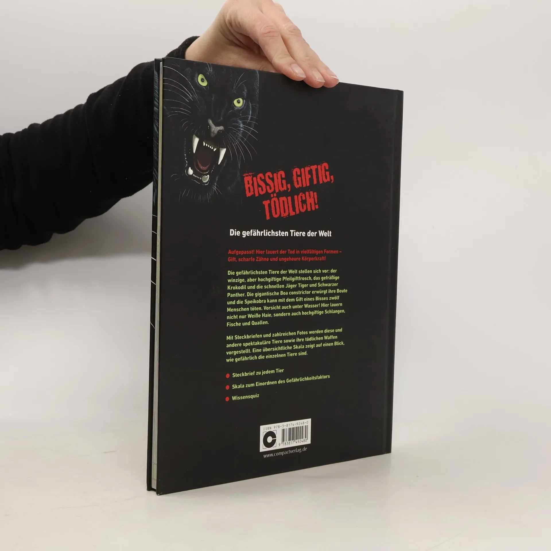 Anhand zahlreicher Farbfotos und gut verständlicher Textabschnitte werden 26 äusserst giftige und gefährliche Tiere vorgestellt, die rund um unseren Globus zu Hause sind, z.B. Speikobra, Schwarzer Panther, Anophelesmücke, Seeschlange, Nashorn, Krokodil, Stachelrochen. Ab 8.