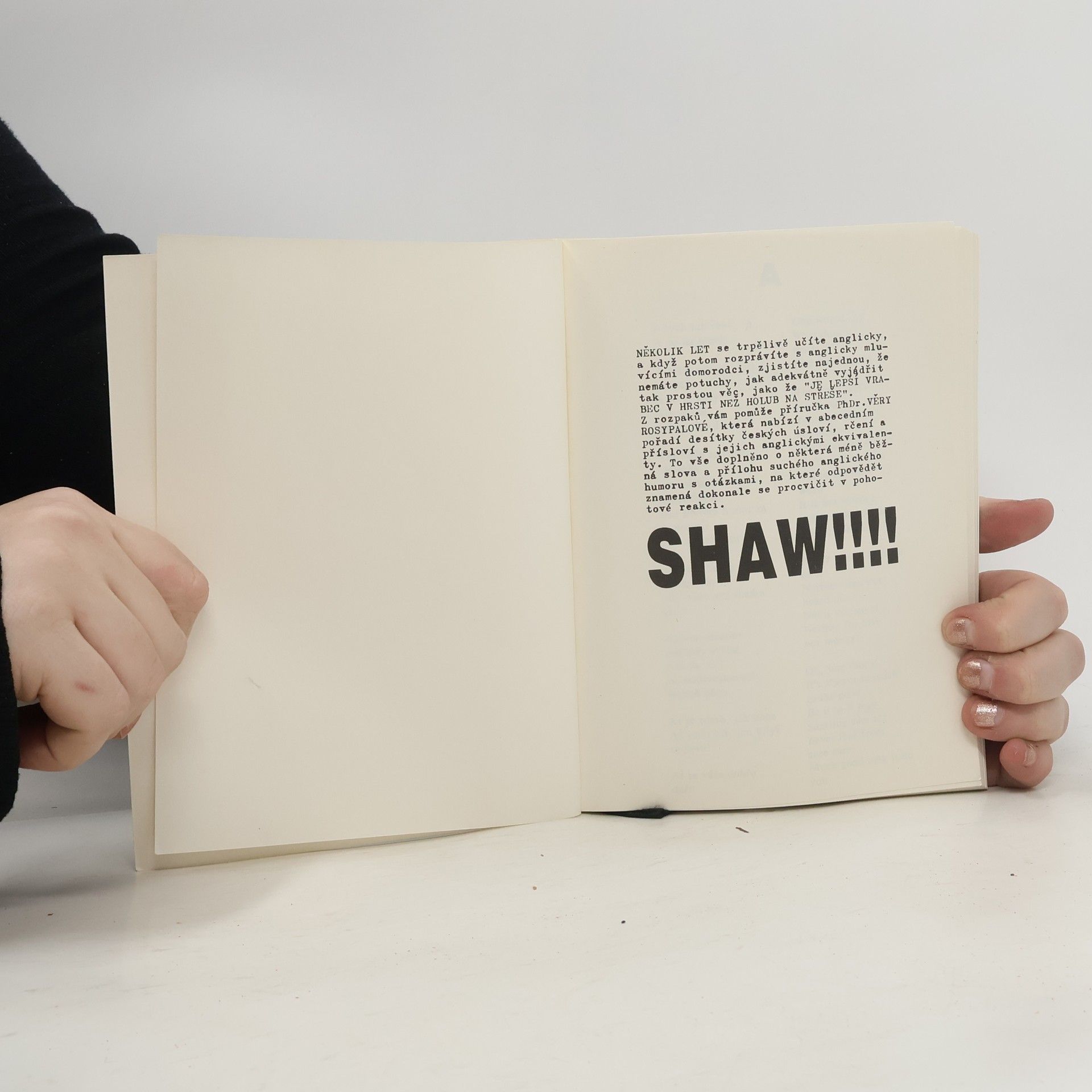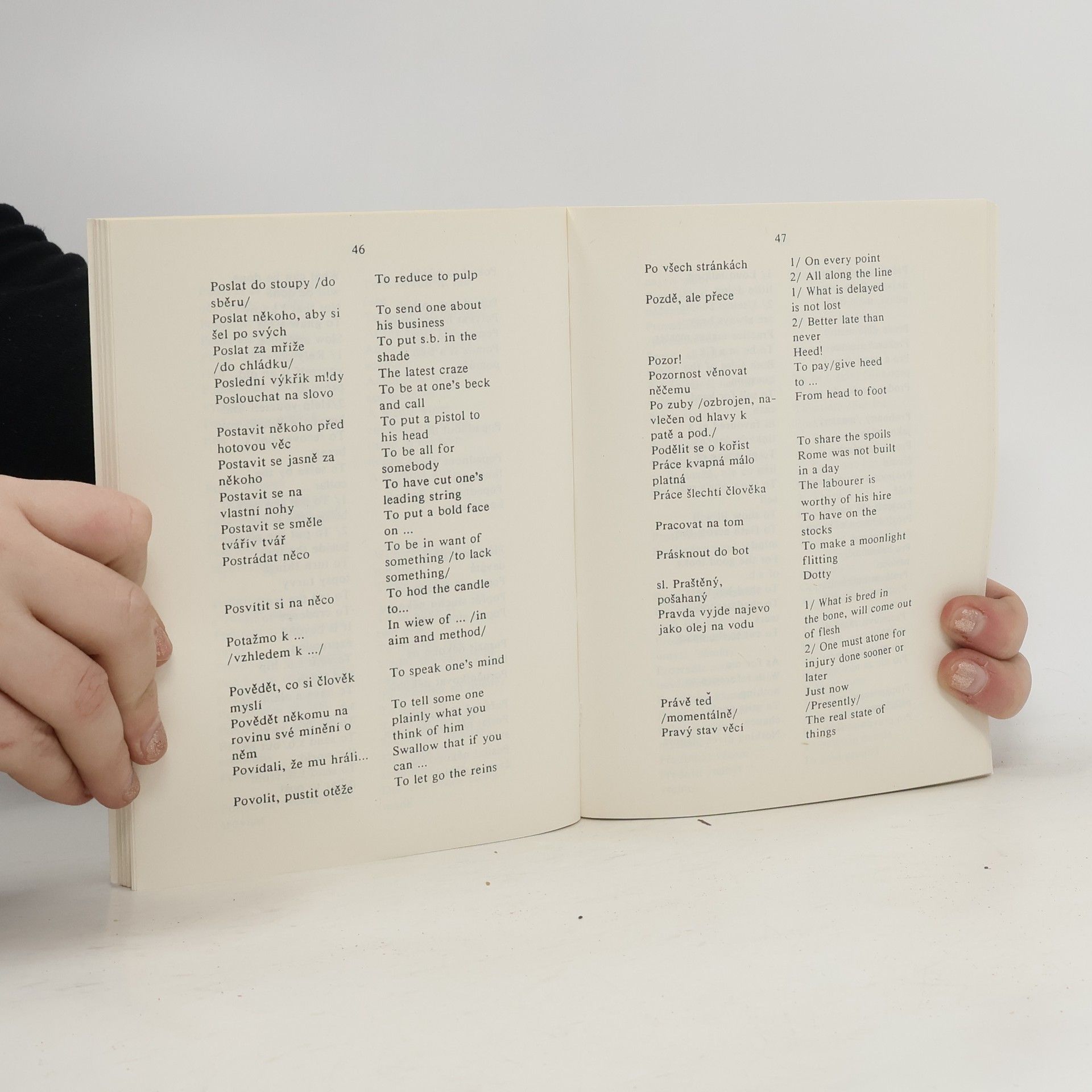 Několik let se trpělivě učíte anglicky, a když potom rozprávíte s anglicky mluvícími domorodci, zjistíte najednou, že nemáte potuchy, jak adekvátně vyjádřit tak prostou věc, jako že „Je lepší vrabec v hrsti než holub na střeše“. Z rozpaků vám pomůže příručka PhDr. Věry Rosypalové CSc., která nabízí v abecedním pořadí desítky českých úsloví, rčení a přísloví a jejich anglickými ekvivalenty. To vše doplněno o některá méně běžná slova a přílohu suchého anglického humoru s otázkami, na které odpovědět znamená dokonale se procvičit v pohotové reakci.