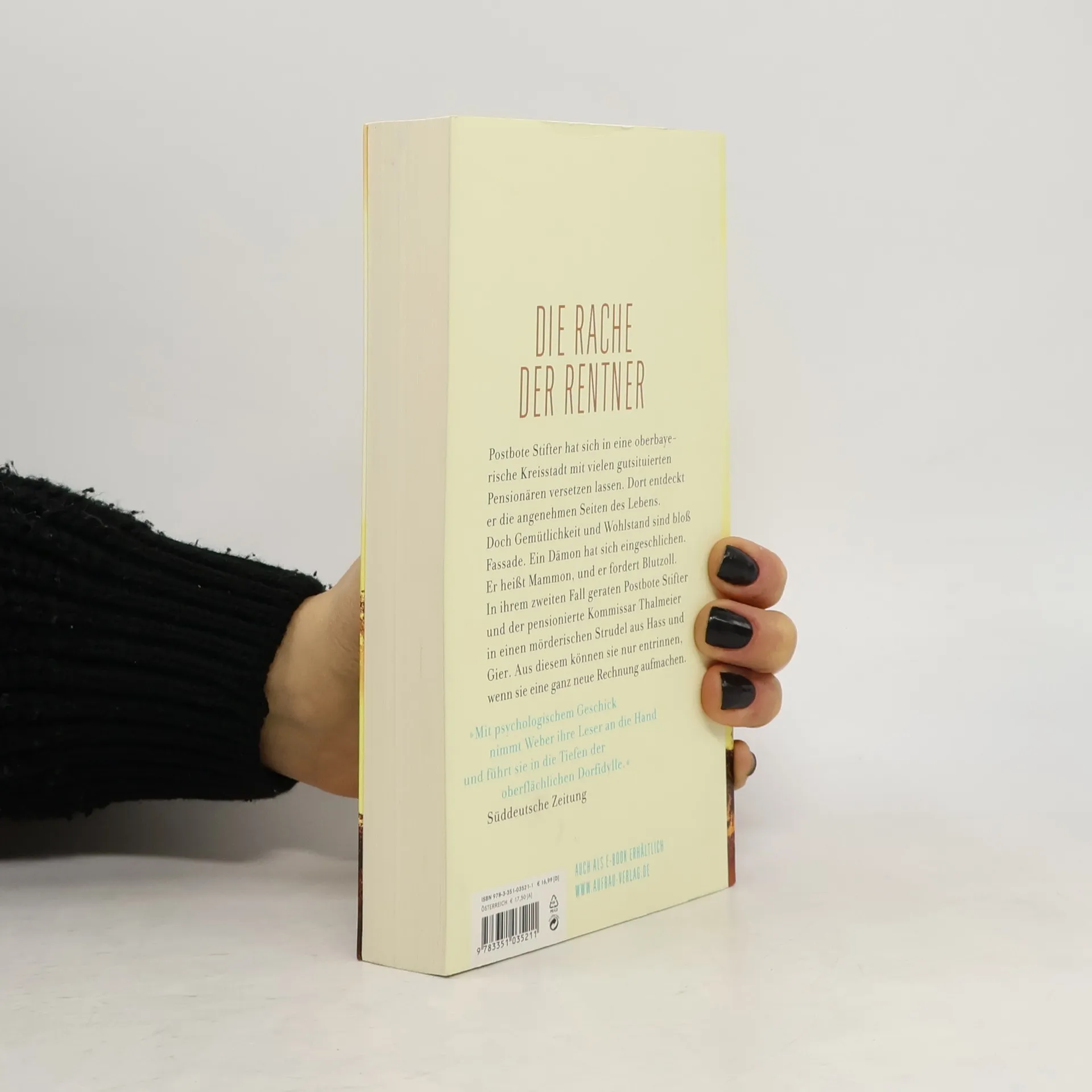 Die Rache der Rentner Das gute Essen, die schöne Natur, die zufriedenen Menschen - Johannes Stifter fühlt sich wohl in seiner neuen Heimat. Als Postbote zieht er seine Kreise. Doch allmählich schwant ihm, dass hier etwas nicht stimmt. Hinter den hohen Hecken verwildern die Gärten, und der Putz bröckelt von den Villen. Die Bewohner meiden Stifter, allen voran Gudrun von Rechlin. Würde man es einer Dame von Welt zutrauen, eine Geisel in ihrem Keller gefangen zu halten? Würde man von einem Zahnarzt erwarten, dass er einen betrügerischen Finanzberater kidnappt? Würde man denken, dass der Tod mit scharfer Sense durchs Oberland geht? - Ein packender Krimi, der erzählt, wie Menschen nicht nur ihr Geld, sondern ihre Werte verlieren. Und ein Fall, den Stifter nur mit Hilfe des alten Kommissars Thalmeier lösen kann. „Mit psychologischem Geschick nimmt Weber ihre Leser an die Hand und führt sie in die Tiefen der oberflächlichen Dorfidylle.“ Süddeutsche Zeitung