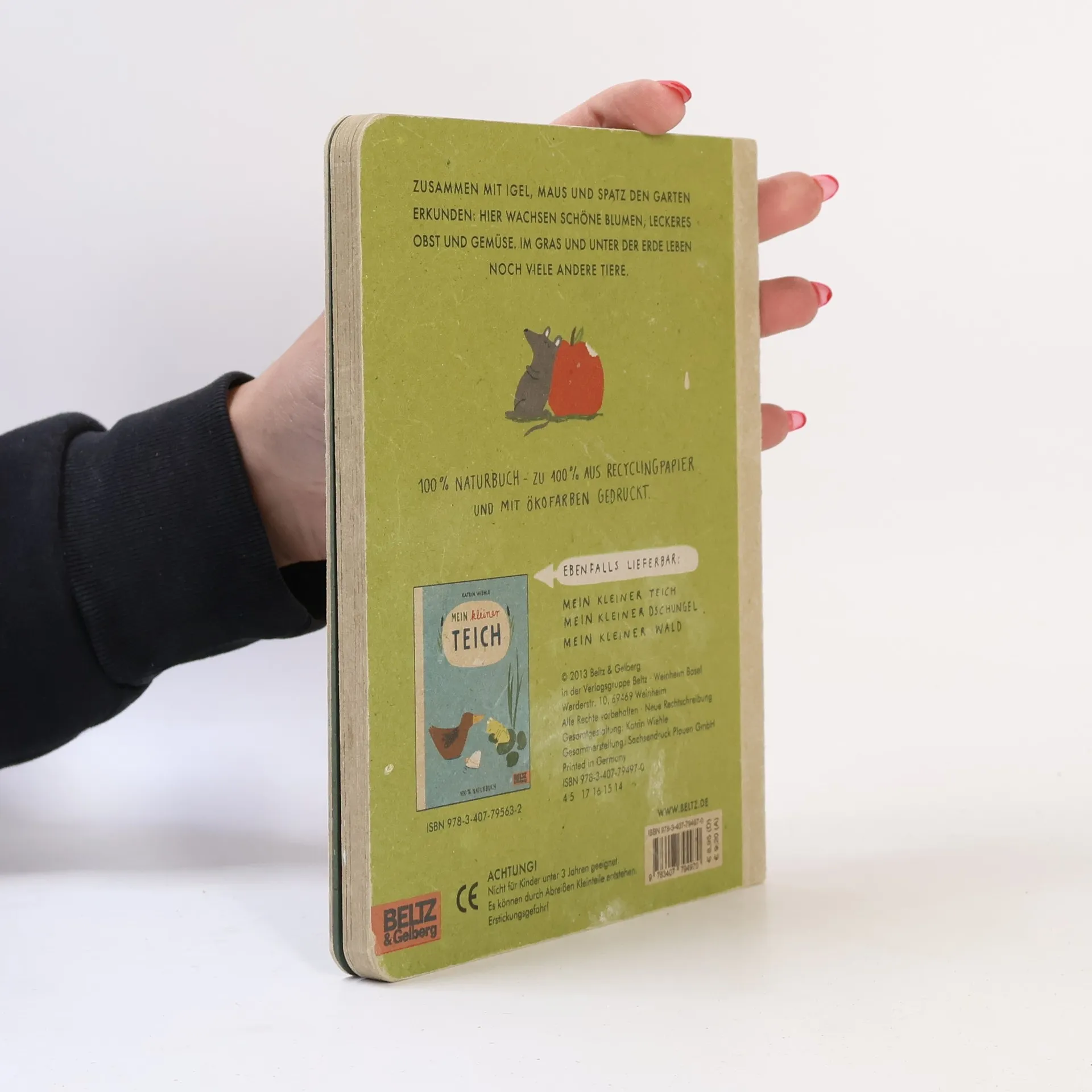 Igel, Maus und Spatz zeigen uns ihren Lebensraum vor unserer Haustür: Im Garten wachsen schöne Blumen, leckeres Obst und viel Gemüse. Und unter der Erde leben noch viele andere Tiere. Pointierte, klare Bilder und einfache Texte wecken erstes Interesse an Natur und Tieren – auch schon bei den Allerkleinsten. Im Bewusstsein für Umweltschutz und Nachhaltigkeit, mit Ökofarben auf Recyclingpapier gedruckt: das ist unser 100% Naturbuch.