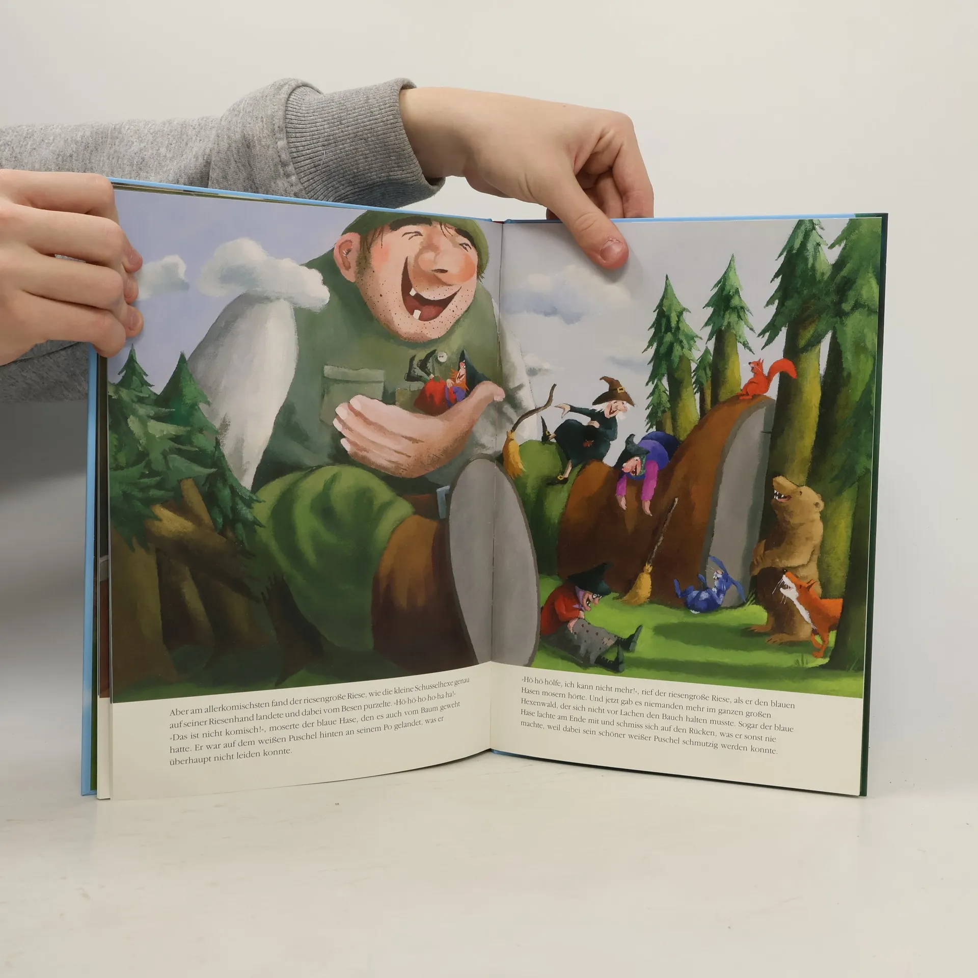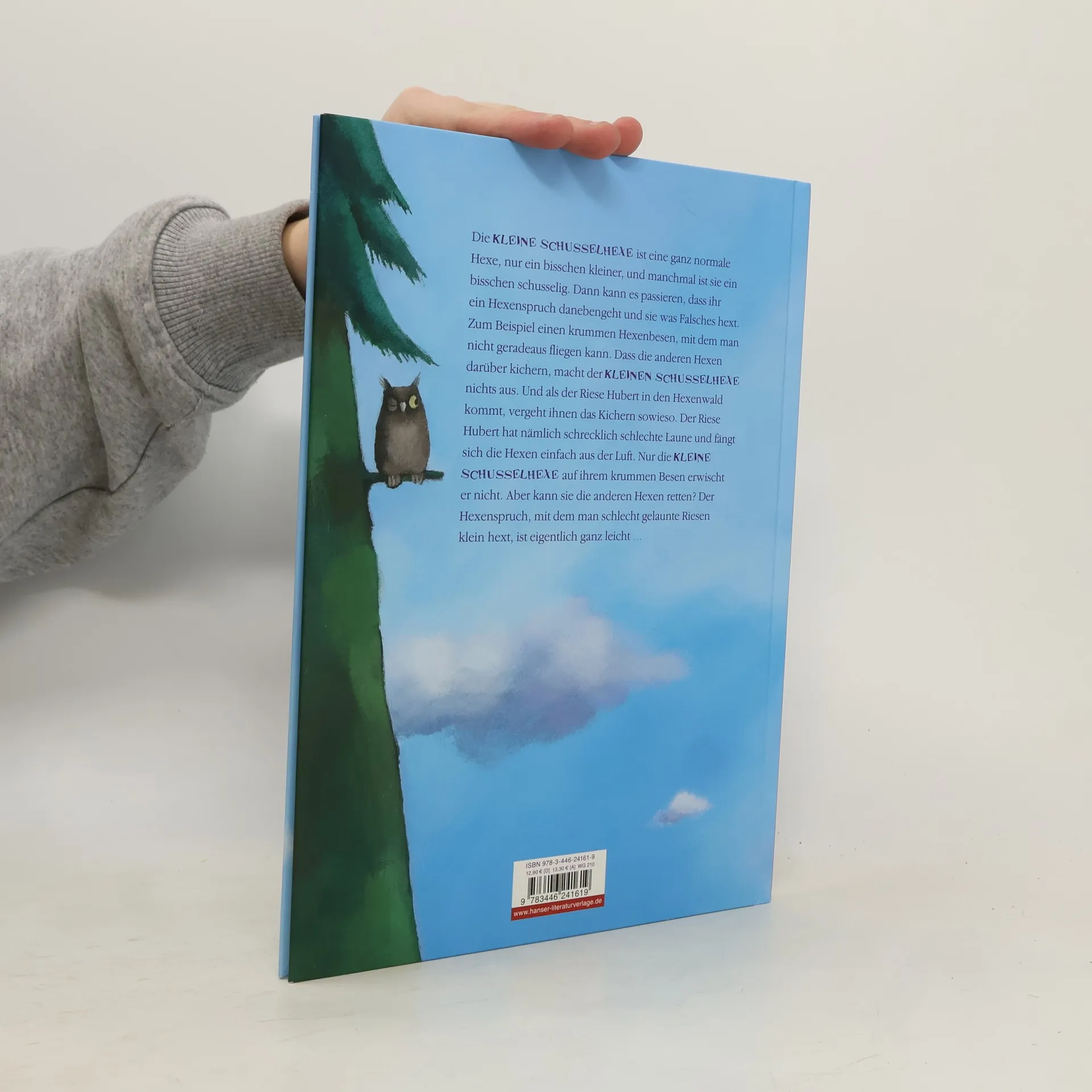 Die kleine Schusselhexe ist eigentlich eine ganz normale Hexe. Nur ein bisschen kleiner als die anderen. Und ein bisschen schusseliger. Wenn ihr bei den Hexensprüchen ein Wort nicht mehr einfällt, sagt sie eben ein anderes. Deshalb hat sie einen krummen Besen und statt eines schwarzen Raben einen blauen Hasen auf der Schulter. Ihr macht das überhaupt nichts aus – nur die großen Hexen kichern. Aber als einmal der Riese Hubert in den Wald kommt, vergeht ihnen das Lachen. Er schnappt sich eine Hexe nach der anderen, nur die kleine Schusselhexe mit ihrem krummen Besen erwischt er nicht. Und da ist klar: Nur sie kann die großen Hexen retten. Ein turbulentes Bilderbuch des Erfolgsduos.