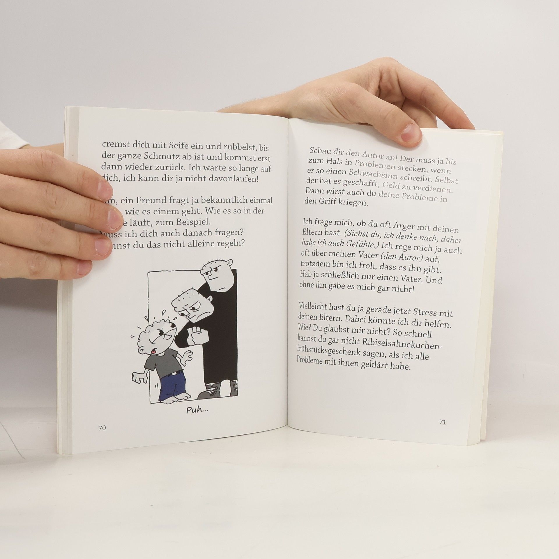 Ich begreife es nicht! Warum hast du mich gekauft? Hab ich dich nicht eindringlich am Buchrücken vor mir gewarnt!? Nichts, aber auch rein gar nichts Interessantes steht hier drinnen. Völlig egal, wie lange du durchhalten wirst (und ich glaube nicht, dass das sehr lange sein wird), da wird nichts vorkommen, das dir gefallen wird. Vielleicht denkst du jetzt: Ja, Moment! Das kann doch nicht stimmen! Ich halte doch ein Buch in der Hand, irgendwann muss es ja mal spannend werden! Du hoffst darauf, dass hier eine Geschichte erzählt wird? Oder dass du über ein paar Witze lachen kannst? Tja, wie soll ich dir das schonend beibringen… Du wirst enttäuscht sein! Das Buch ist langweilig, manchmal sogar gemein, meistens aber einfach nur dämlich.