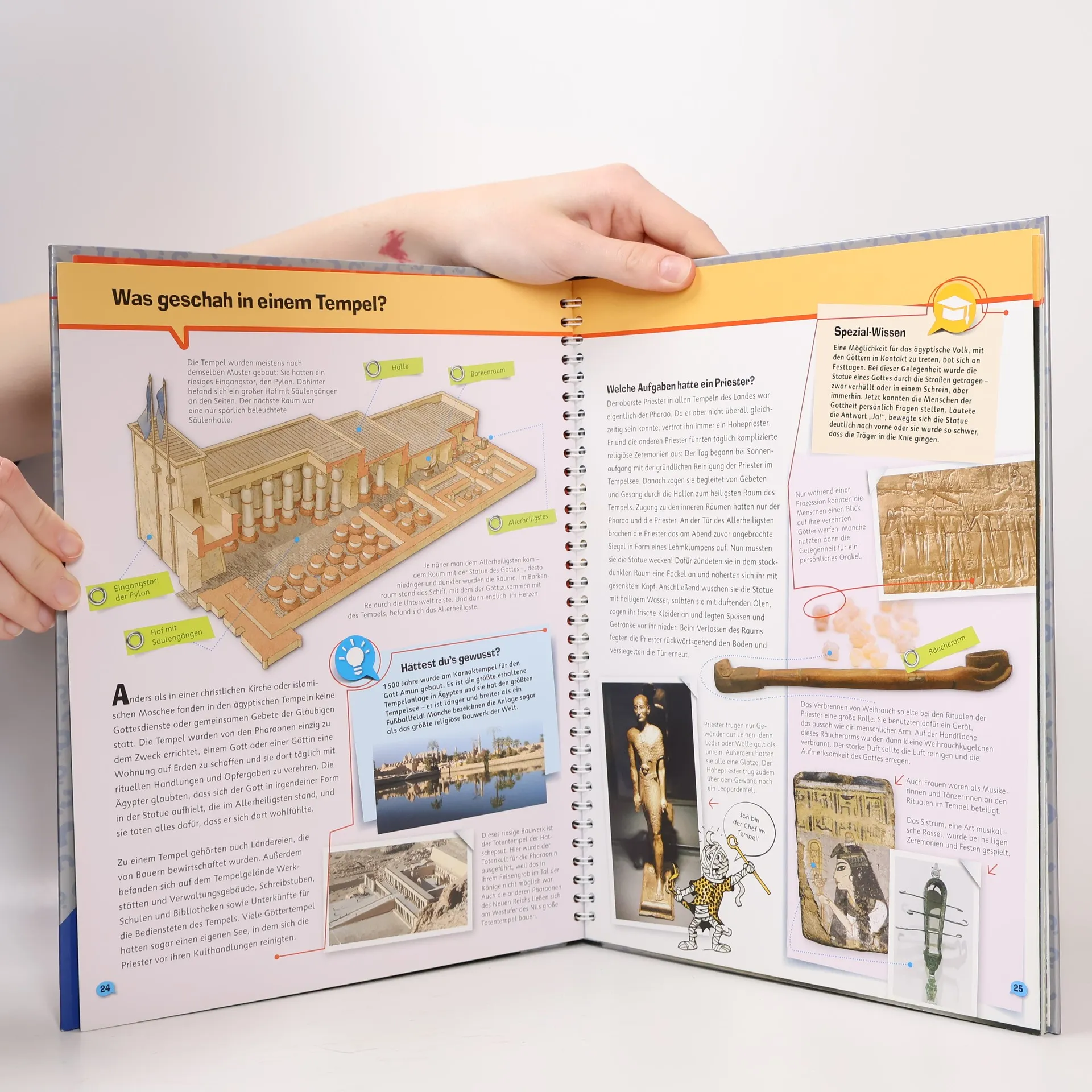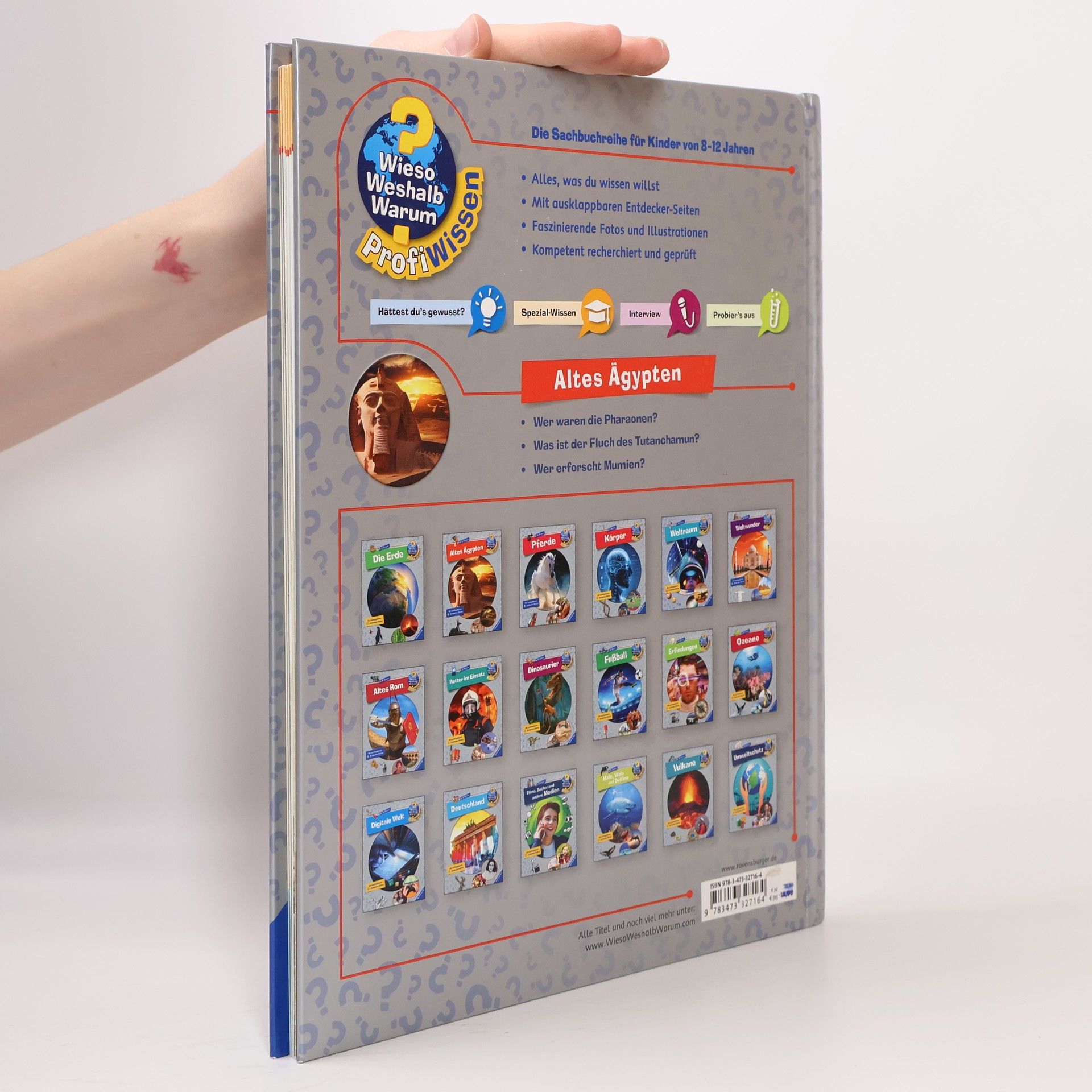 Wie wurden die kolossalen Pyramiden erbaut? Wer waren die Pharaonen? Diesen und vielen anderen Fragen rund um die geheimnisvolle Hochkultur am Nil geht das Buch auf den Grund. Die Kinder lernen die Götter der Alten Ägypter kennen ebenso wie das Alltagsleben und schauen bei einer modernen Ausgrabung zu. Ausklappbare Entdecker-Seiten gewähren spektakuläre Einblicke, zum Beispiel in die Grabkammer von Tutanchamun, und in einem spannenden Experiment können Kinder selbst ausprobieren, wie man einen Apfel mumifiziert. Wieso? Weshalb? Warum? ProfiWissen Die Sachbuchreihe für Kinder von 8–12 Jahren Abtauchen ins Lieblingsthema: Wann lebten die Dinos? Wie sieht es unter der Motorhaube eines Rennwagens aus? Was passiert im Weltall? Wer das ganz genau wissen möchte, ist bei Wieso? Weshalb? Warum? ProfiWissen richtig. Mit modernem Look, starken Bildern, verblüffenden Fakten und einer großen Portion Extra-Wissen! Die Texte vermitteln Sachwissen lebendig und verständlich. Witzige Comics lockern die Seiten auf. Experten lassen sich in Interviews über ihre Schulter schauen. Spezial-Wissen-Kästen bieten tiefere Einblicke. Doch hier wird nicht nur gelesen, sondern auch ausprobiert: mit vielen Anleitungen für Experimente. Und auf ausklappbaren Entdeckerseiten in jedem Band gibt es noch mehr zum Schauen und Staunen. Ein unterhaltsamer Begleiter durch die verschiedensten Wissenswelten.