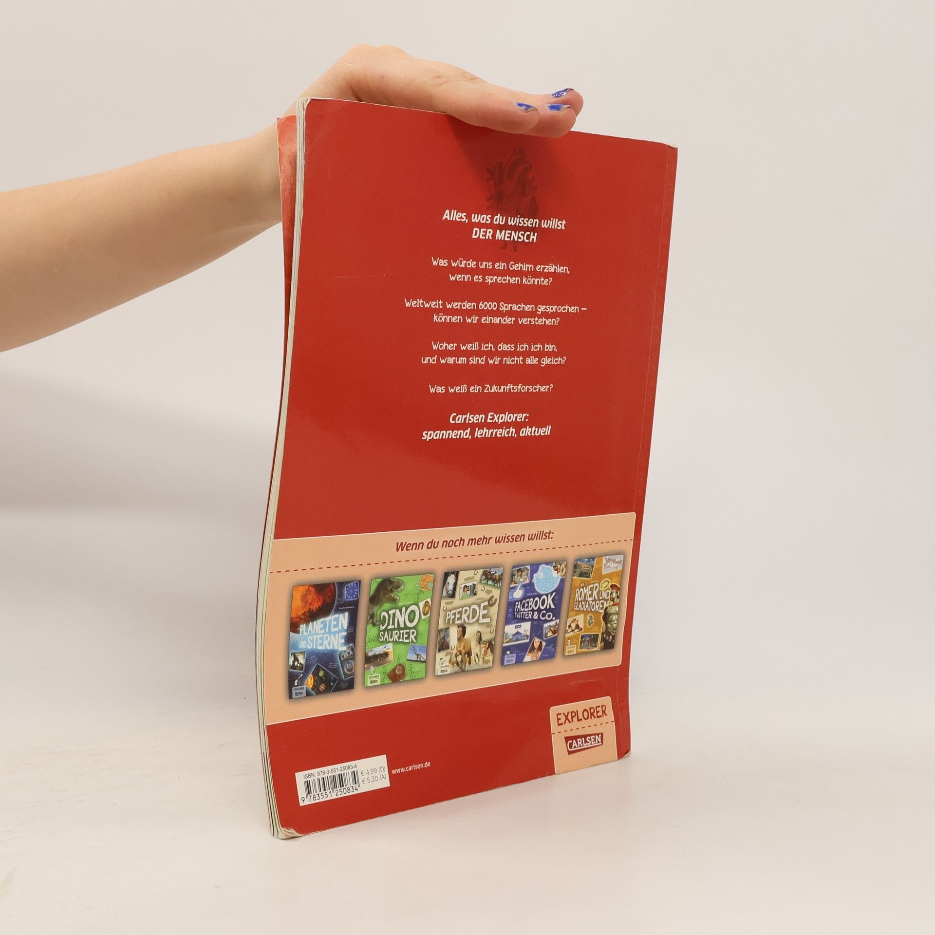 Echt menschlich Was würde uns ein Skelett erzählen, wenn es sprechen könnte? Weltweit werden 6000 Sprachen gesprochen - können wir einander verstehen? Woher weiß ich, das ich ich bin und warum sind wir nicht alle gleich? Was weiß ein Zukunftsforscher? Carlsen Explorer: Alles, was du wissen willst. Reportagen, Interviews und unterhaltsame Sachtexte gemixt mit Fotos und Illustrationen. Vielfältig und kurzweilig. Der neue Blick auf tolle Themen.
