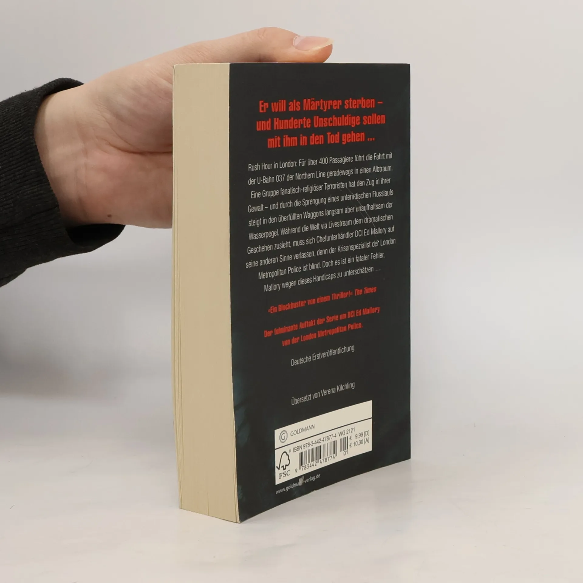 Rush Hour in London: Er will als Märtyrer sterben – und Hunderte Unschuldige sollen mit ihm in den Tod gehen. Rush Hour in London: Für über 400 Passagiere führt die Fahrt mit der U-Bahn 037 der Northern Line geradewegs in einen Albtraum. Eine Gruppe fanatisch-religiöser Terroristen hat den Zug in ihrer Gewalt – und durch die Sprengung eines unterirdischen Flusslaufs steigt in den überfüllten Waggons langsam aber unaufhaltsam der Wasserpegel. Während die Welt via Livestream dem dramatischen Geschehen zusieht, muss sich Chefunterhändler DCI Ed Mallory auf seine anderen Sinne und seine Erfahrung verlassen, denn der Krisenspezialist der London Metropolitan Police ist blind. Doch es ist ein fataler Fehler, Mallory wegen dieses Handicaps zu unterschätzen …