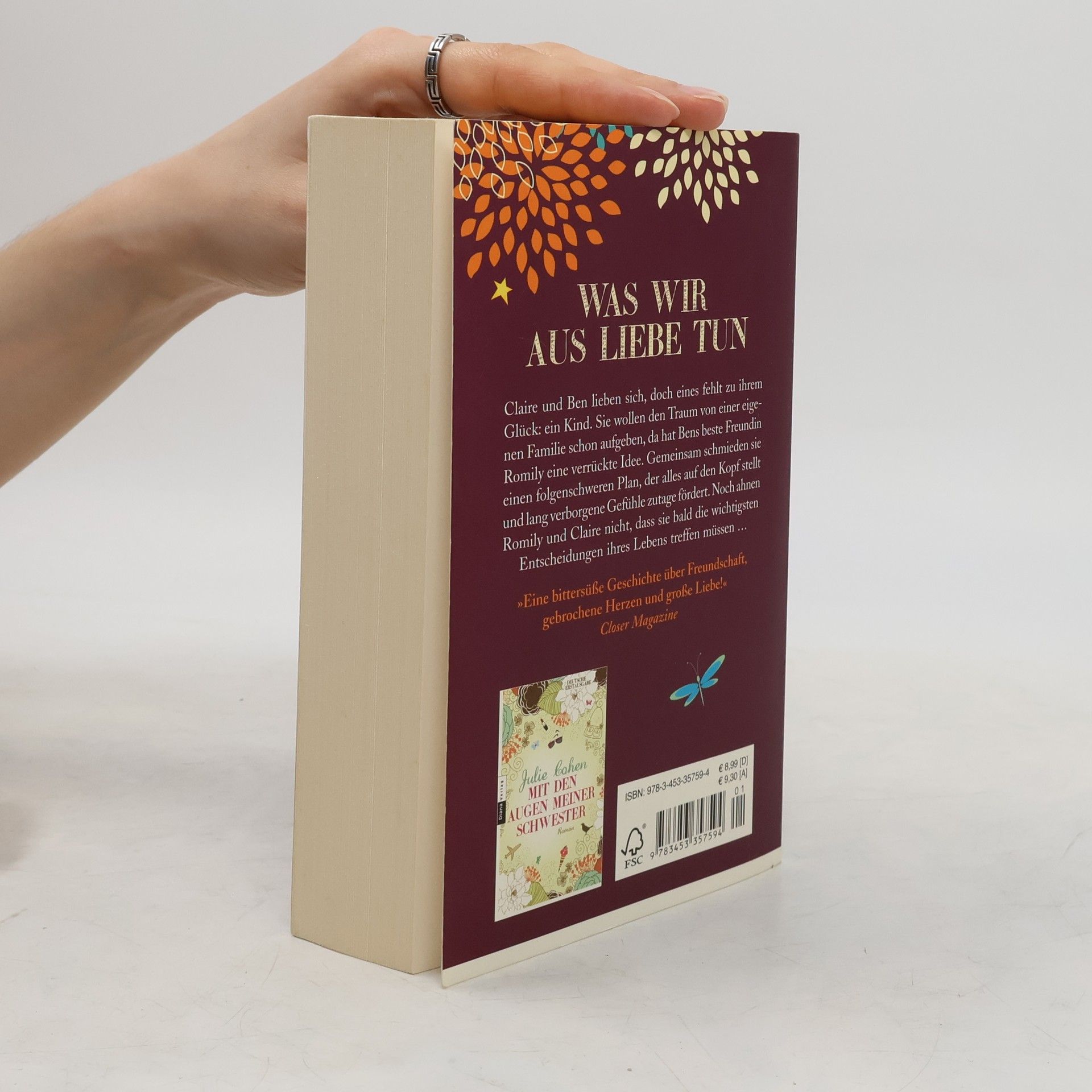Was wir aus Liebe tunClaire und Ben lieben sich, doch eines fehlt zu ihrem Glück: ein Kind. Sie wollen den Traum von einer eigenen Familie schon aufgeben, da hat Bens beste Freundin Romily eine verrückte Idee. Gemeinsam schmieden sie einen folgenschweren Plan, der alles auf den Kopf stellt und lang verborgene Gefühle zutage fördert. Noch ahnen Romily und Claire nicht, dass sie bald die wichtigsten Entscheidungen ihres Lebens treffen müssen …