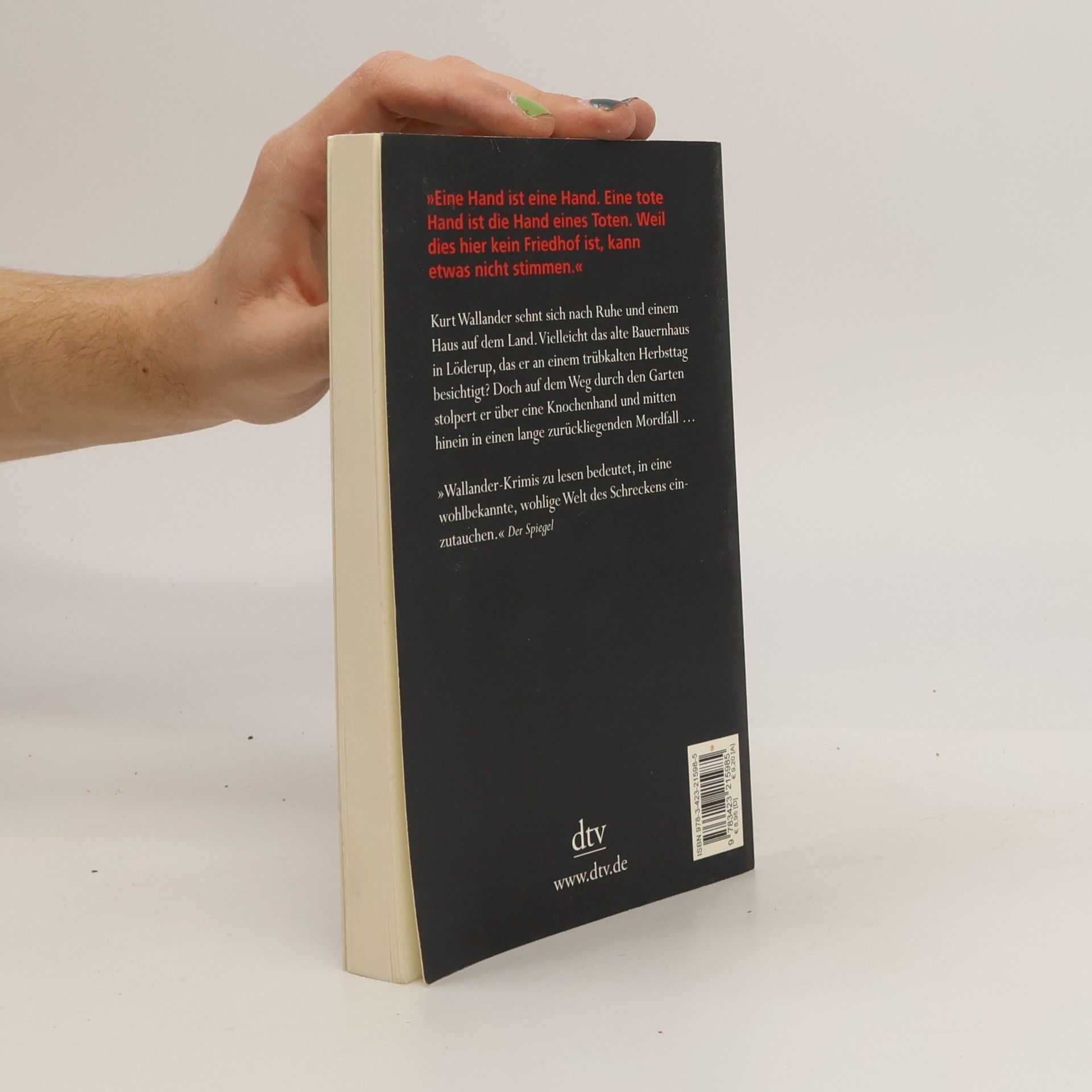 Jetzt im Taschenbuch Kurt Wallander sehnt sich nach Ruhe und einem Haus auf dem Land. Vielleicht das alte Bauernhaus in Löderup, das er an einem trübkalten Herbsttag besichtigt? Doch mit dem Frieden ist es schnell vorbei, als er auf dem Weg durch den Garten stolpert: über eine Knochenhand – und mitten hinein in einen Mordfall, der eigentlich längst verjährt ist. Wallander stellt Recherchen an und lässt nicht locker. Bis er dem Mörder Auge in Auge gegenübersitzt.