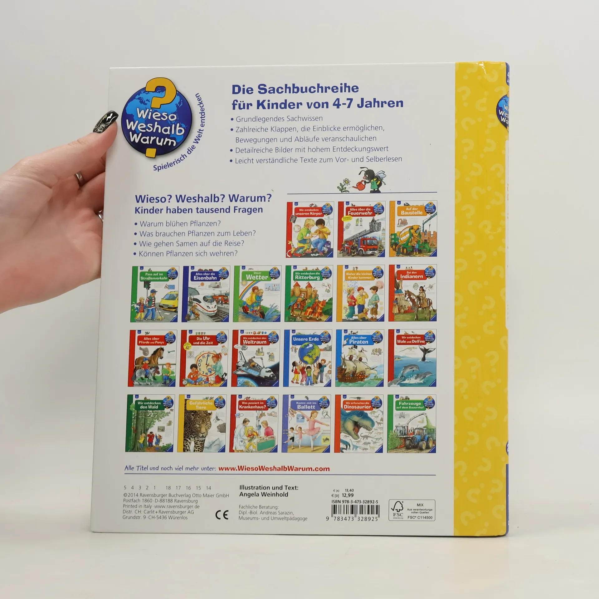 Grün, grün, grün wird der Daumen aller Kinder, die mit diesem prall gefüllten Sachbuch heimische Pflanzenwelt erforschen! Was brauchen Kaktus, Ahorn und Hyazinthe zum Leben? Wie tief reichen Wurzeln? Vom Samen bis zur Blüte können kleine Gärtnerinnen und Gärtner ab 4 Jahren Schritt für Schritt verfolgen, wie Pflanzen wachsen und sich vermehren. Außerdem zeigen naturgetreue Illustrationen mit vielen Klappen, was Pflanzen alles können. Wieso? Weshalb? Warum? Die Sachbuchreihe für Kinder von 4–7 Jahren Jeden Tag entdecken Kinder etwas Neues – da kommen viele Fragen auf. Warum sind die Dinosaurier ausgestorben? Wo ist die Sonne in der Nacht? Wozu brauchen wir das Blut? Die beliebte Sachbuchreihe Wieso? Weshalb? Warum? gibt Kindern Antworten auf Augenhöhe. Dabei werden die unterschiedlichsten Themen aus der Alltags- und Interessenswelt der Kinder altersgerecht und mit viel Liebe zum Detail unter die Lupe genommen. Detailreiche Bilder, verständliche Sachtexte und überraschende Klappen, die Bewegungen oder Abläufe veranschaulichen und hinter die Dinge blicken lassen, ermöglichen Kindern, sich ihre Themen selbst zu erschließen. Der Spaß am eigenhändigen Entdecken, die liebevolle Umsetzung und die qualitativ hochwertige Ausstattung garantieren langanhaltende Freude an jedem einzelnen Buch.
