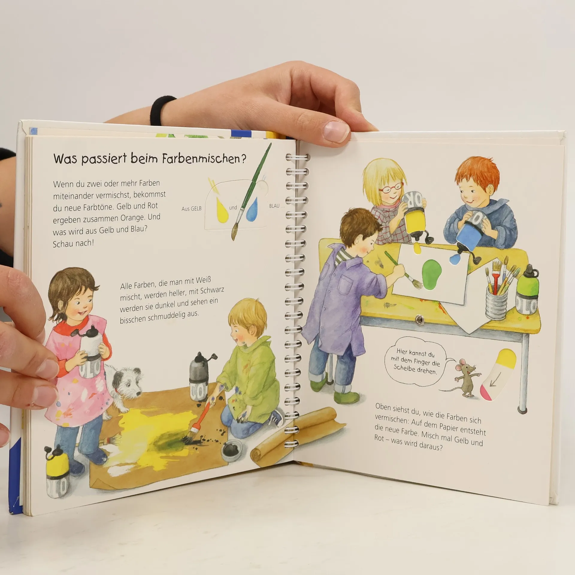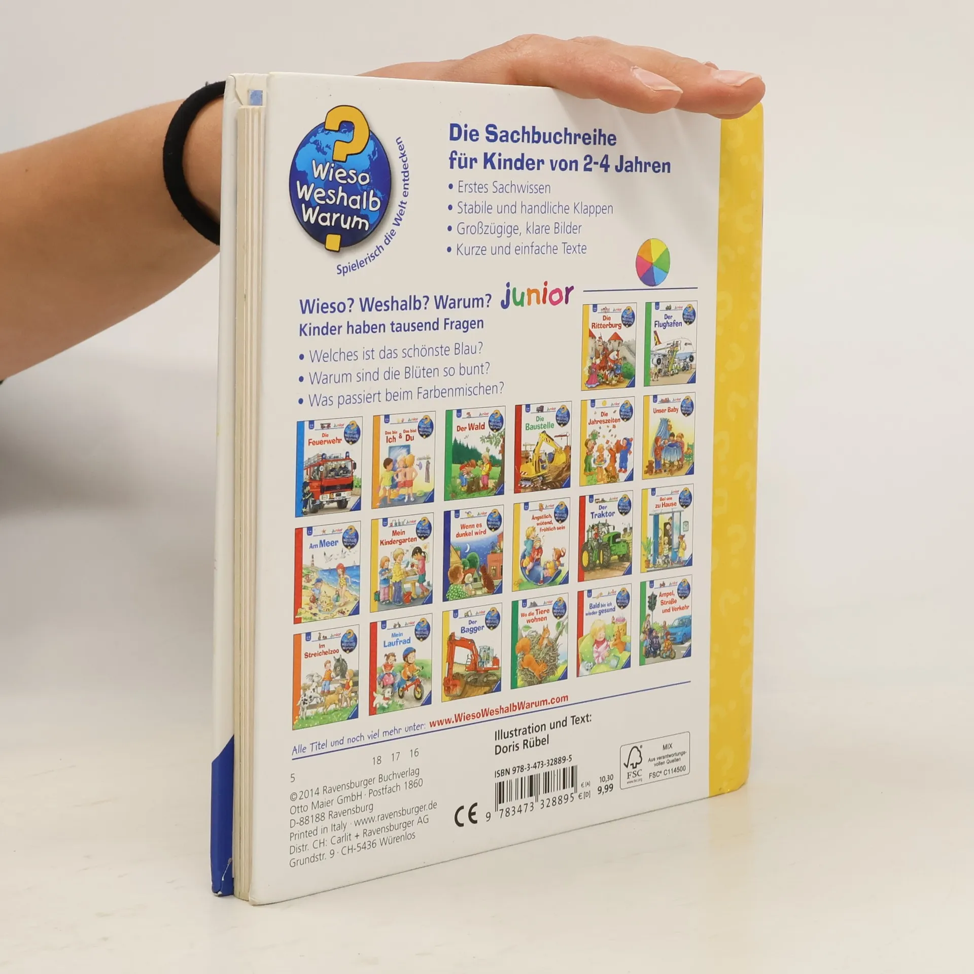 Welche Farbe hat der Himmel? Welche Früchte sind rot? In diesem Buch lernen Kinder die Farben kennen und werden dazu ermuntert, sie in ihrem Alltag wiederzufinden. Auch hinter Klappen gibt es Spannendes zu entdecken: Der Himmel ist nicht immer blau, rote Früchte sind anfangs oft grün, und wenn Blumen ihre Kelche öffnen, wird die grüne Wiese bunt. Für interaktiven Spielspaß sorgen zahlreiche Zuordnungs- und Ratespiele sowie eine Drehscheibe, mit der Farben gemischt werden können. Wieso? Weshalb? Warum? junior Die Sachbuchreihe für Kinder von 2-4 Jahren Jeden Tag entdecken Kinder etwas Neues – und haben viele Fragen. Wann kommt die Feuerwehr? Was machen die Tiere im Winter? Warum muss ich Zähne putzen? Die beliebte Sachbuchreihe Wieso? Weshalb? Warum? junior beantwortet die Fragen der Kinder auf Augenhöhe. Sie beleuchtet unterschiedlichste Themen aus ihrer Alltags- und Interessenswelt altersgerecht und mit viel Liebe zum Detail. Die Reihe ist speziell auf kleine Hände und die Bedürfnisse der Kleinsten angepasst. Klare und liebevolle Bilder, kurze Sachtexte sowie handliche Klappen, die Bewegungen veranschaulichen und überraschende und lustige Einblicke gewähren, ermöglichen Kindern, sich ihre Themen selbst zu erschließen. Der Spaß am eigenhändigen Entdecken, die liebevolle Umsetzung und die hochwertige Ausstattung garantieren langanhaltende Freude an jedem Buch.