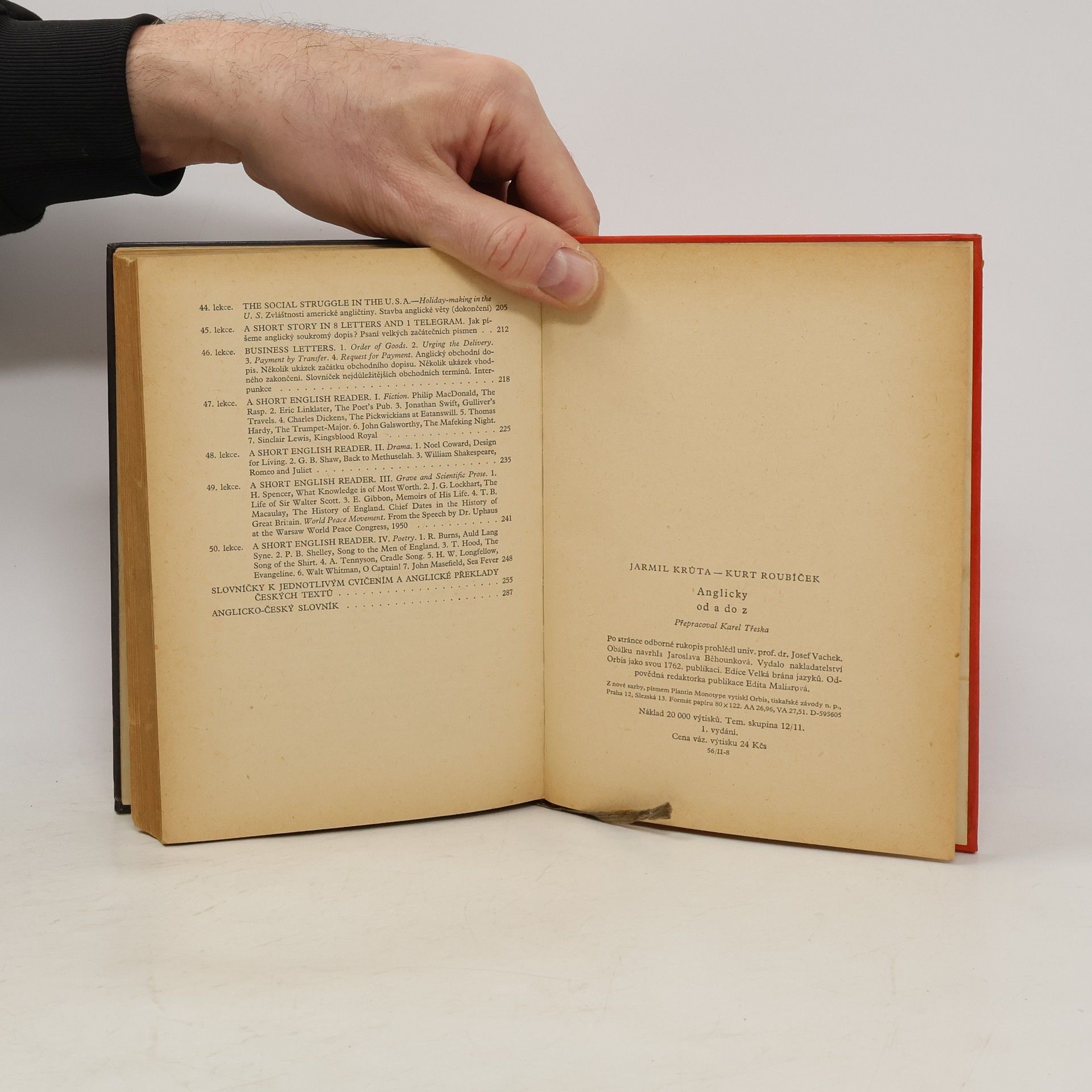 Učebnice angličtiny v padesáti lekcích. Soustavná učebnice probírá v prvých lekcích základy anglické gramatiky a správné výslovnosti, postupně rozšiřuje základní slovní fond, v krátkých i delších konverzacích a ukázkách seznamuje se zvláštnostmi živého,literárního, novinářského i obchodního jazyka a s nejdůležitějším odborným názvoslovím. Je doplněna stručným anglicko-českým slovníkem.