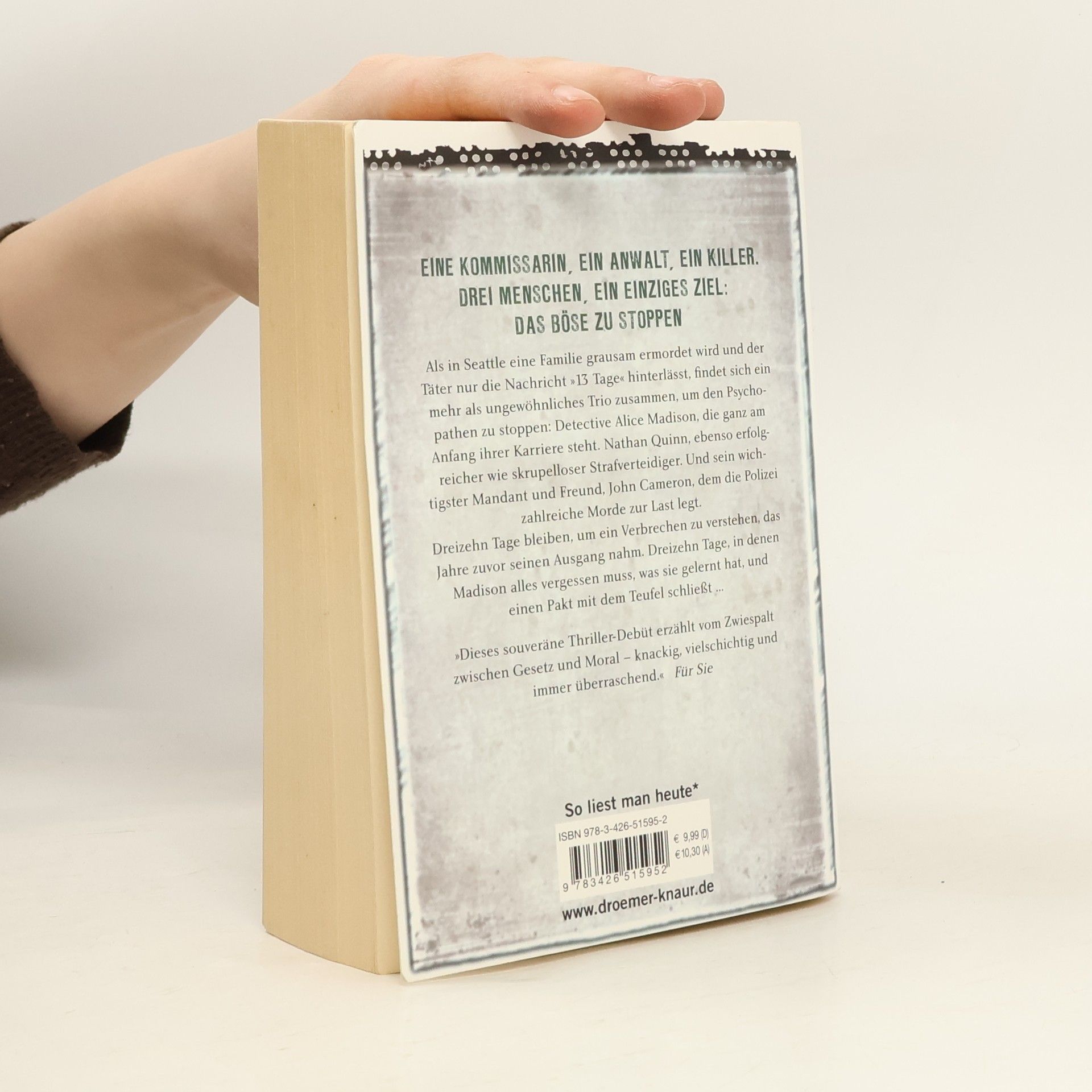 Als in Seattle eine ganze Familie grausam ermordet wird und der Täter am Türrahmen die Nachricht "13 Tage" hinterlässt, findet sich ein mehr als ungewöhnliches Trio zusammen, um einen Wahnsinnigen zu stoppen: Detective Alice Madison, die ganz am Anfang ihrer Karriere steht. Nathan Quinn, ebenso erfolgreicher wie skrupelloser Strafverteidiger. Und sein wichtigster Mandant und Freund, John Cameron, dem die Polizei zahlreiche Morde zur Last legt, aber noch keinen einzigen nachweisen konnte. Dreizehn Tage bleiben, um ein Verbrechen zu verstehen, das Jahre zuvor mit einer Entführung seinen Ausgang nahm. Dreizehn Tage, in denen Madison alles vergessen muss, was sie gelernt hat, und einen Pakt mit dem Teufel schließt ...