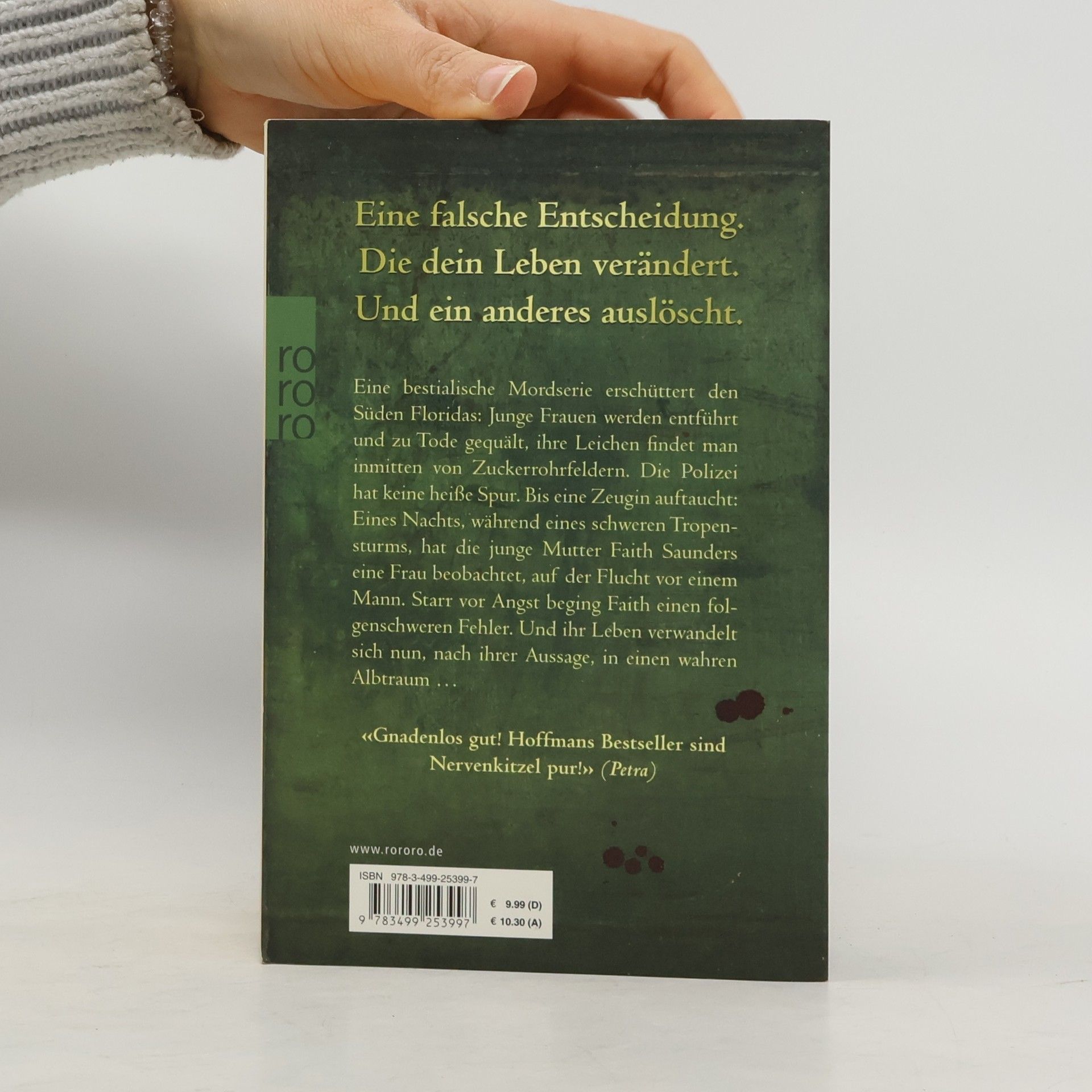 Eine falsche Entscheidung.Die dein Leben verändert.Und ein anderes auslöscht.Eine bestialische Mordserie erschüttert den Süden Floridas: Junge Frauen werden entführt und zu Tode gequält, ihre Leichen findet man inmitten von Zuckerrohrfeldern. Die Polizei hat keine heiße Spur. Bis eine Zeugin auftaucht: Eines Nachts, während eines schweren Tropensturms, hat die junge Mutter Faith Saunders eine Frau beobachtet, auf der Flucht vor einem Mann. Starr vor Angst beging Faith einen folgenschweren Fehler. Und ihr Leben verwandelt sich nun, nach ihrer Aussage, in einen wahren Albtraum …