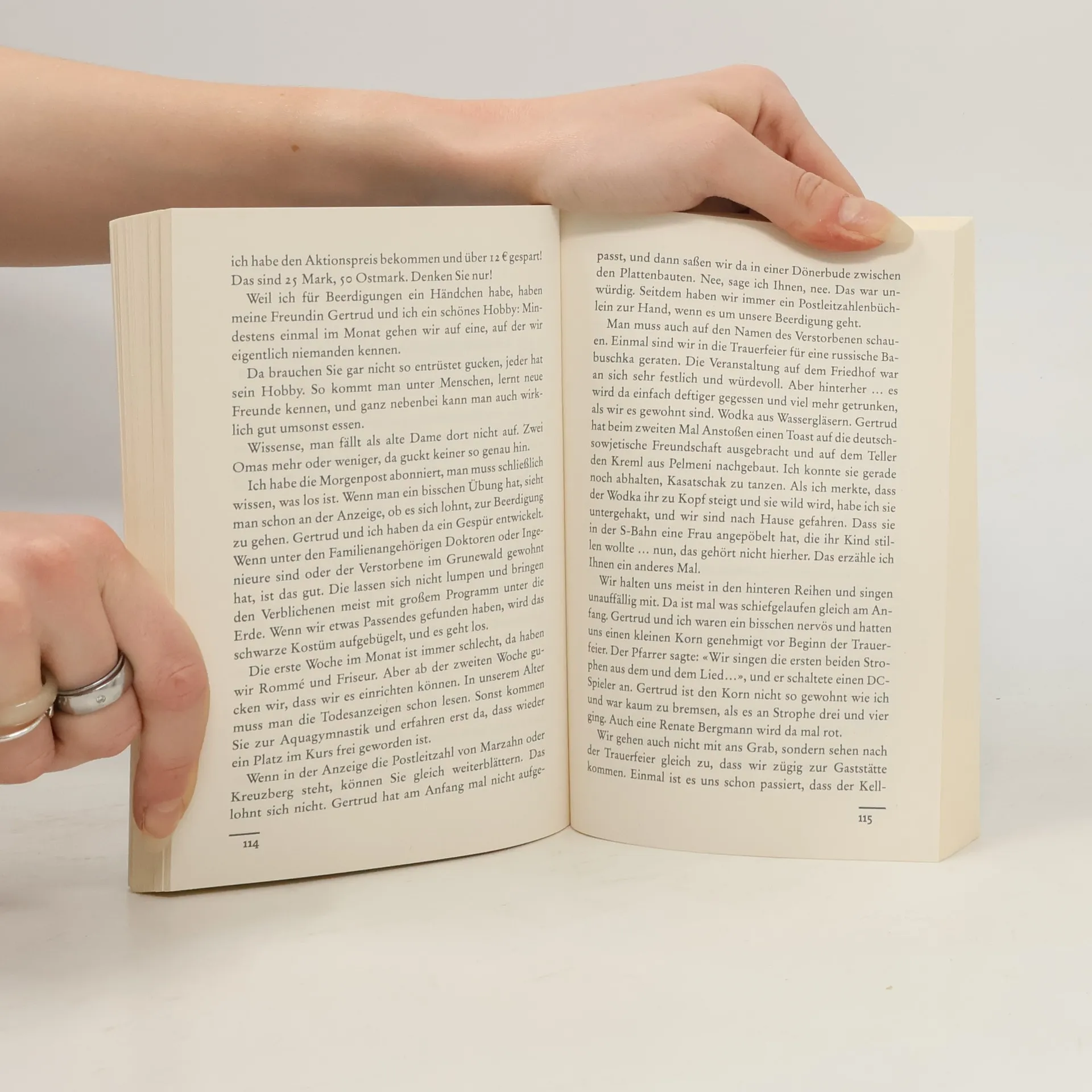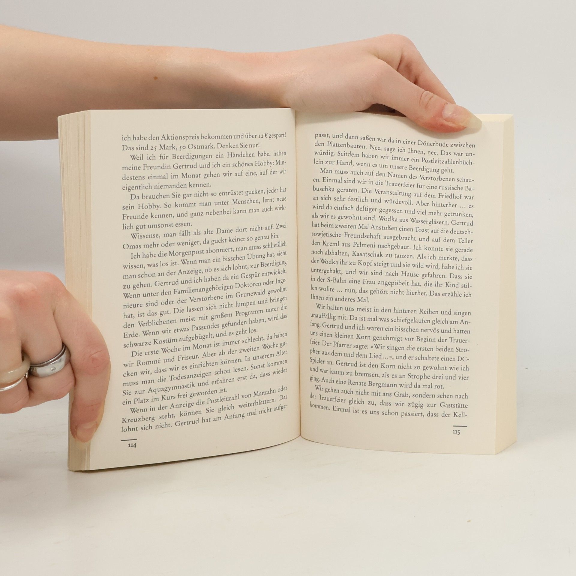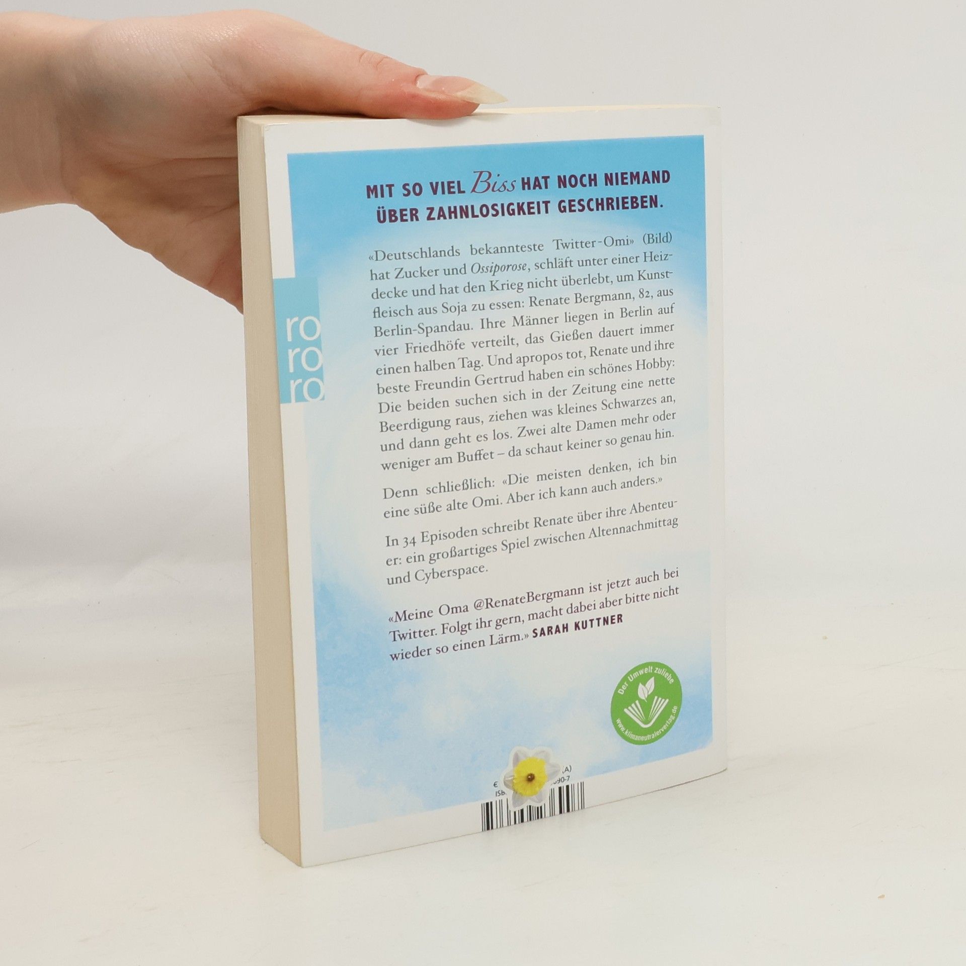 Mit so viel Biss hat noch niemand über Zahnlosigkeit geschrieben. «Deutschlands bekannteste Twitter-Omi.» (Bild) hat Zucker und «Ossiporose», schläft unter einer Heizdecke und hat «den Krieg nicht überlebt, um Kunstfleisch aus Soja zu essen.»: Renate Bergmann 82, aus Berlin. Ihre Männer liegen in Berlin auf vier Friedhöfe verteilt, das Gießen dauert immer einen halben Tag. Und apropos tot, Renate und ihre beste Freundin Gertrud haben ein schönes Hobby: Die beiden suchen sich in der Zeitung eine nette Beerdigung raus, ziehen was Schwarzes an, und dann geht es los. Zwei alte Damen mehr oder weniger am Buffet – da schaut keiner so genau hin. Denn schließlich: «Die meisten denken ich bin eine süße alte Omi. Aber ich kann auch anders.» In Episoden schreibt Renate über ihre Abenteuer: Ein großartiges Spiel zwischen Rentnerdasein und digitaler Welt.