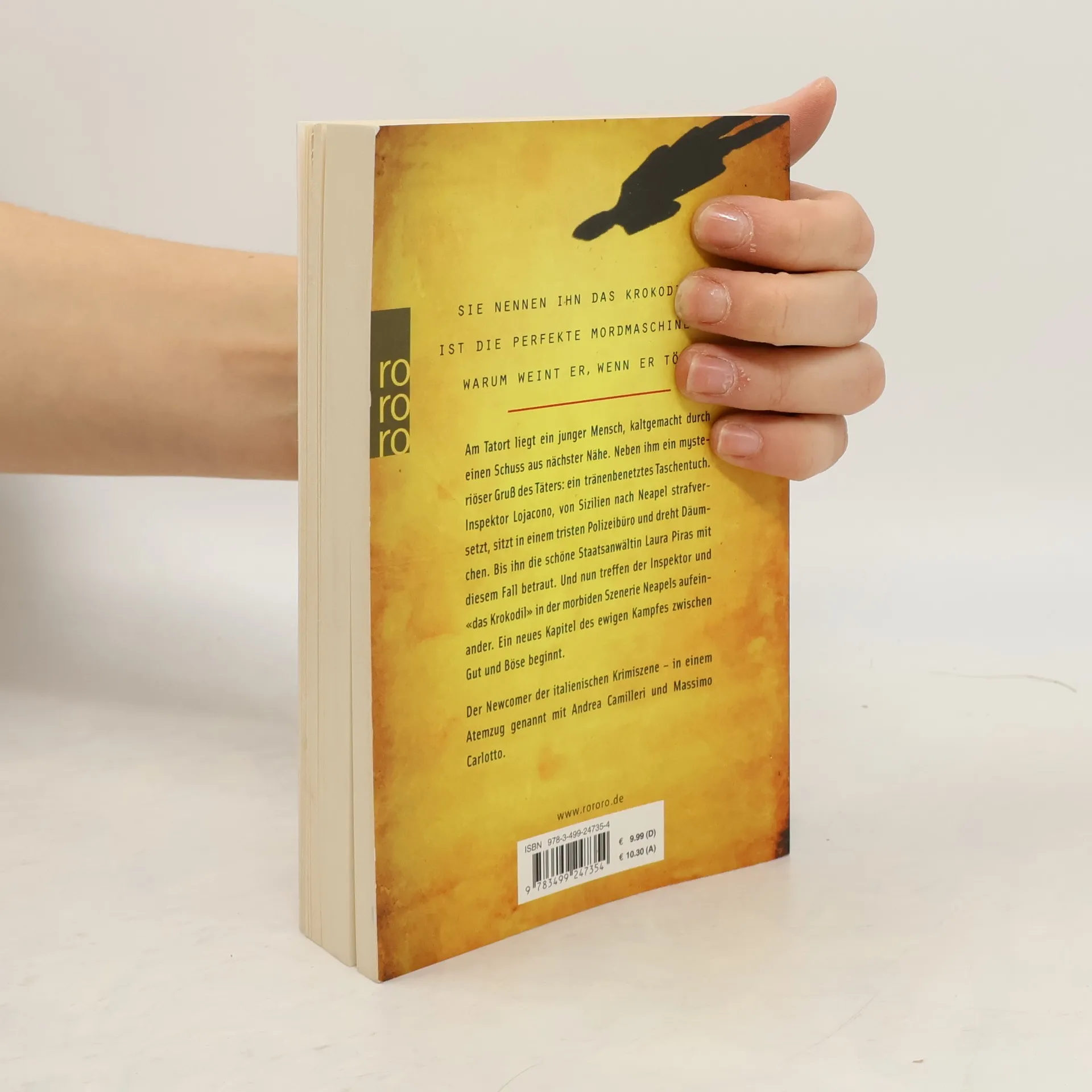 Sie nennen ihn das Krokodil. Er ist die perfekte Mordmaschine. Aber warum weint er, wenn er tötet? Am Tatort liegt ein junger Mensch, kaltgemacht durch einen Schuss aus nächster Nähe. Neben ihm ein mysteriöser Gruß des Täters : ein tränenbenetztes Taschentuch. Inspektor Lojacono, von Sizilien nach Neapel strafversetzt, sitzt in einem tristen Polizeibüro und dreht Däumchen. Bis ihn die schöne Staatsanwältin Laura Piras mit diesem Fall betraut. Und nun treffen der Inspektor und «das Krokodil» in der morbiden Szenerie Neapels aufeinander. Ein neues Kapitel des ewigen Kampfes zwischen Gut und Böse beginnt. Der Newcomer der italienischen Krimiszene – in einem Atemzug genannt mit Andrea Camilleri und Massimo Carlotto.