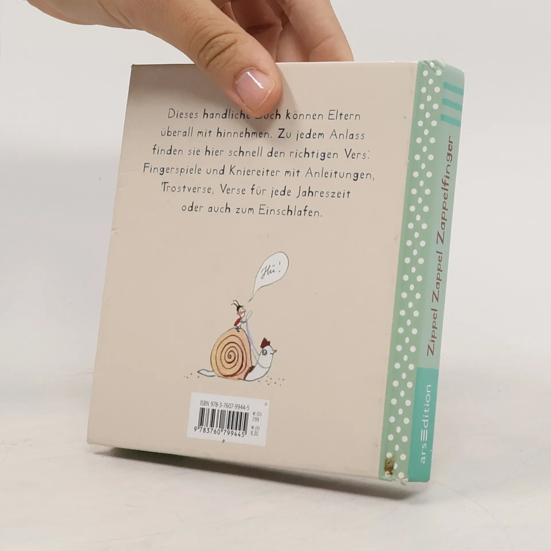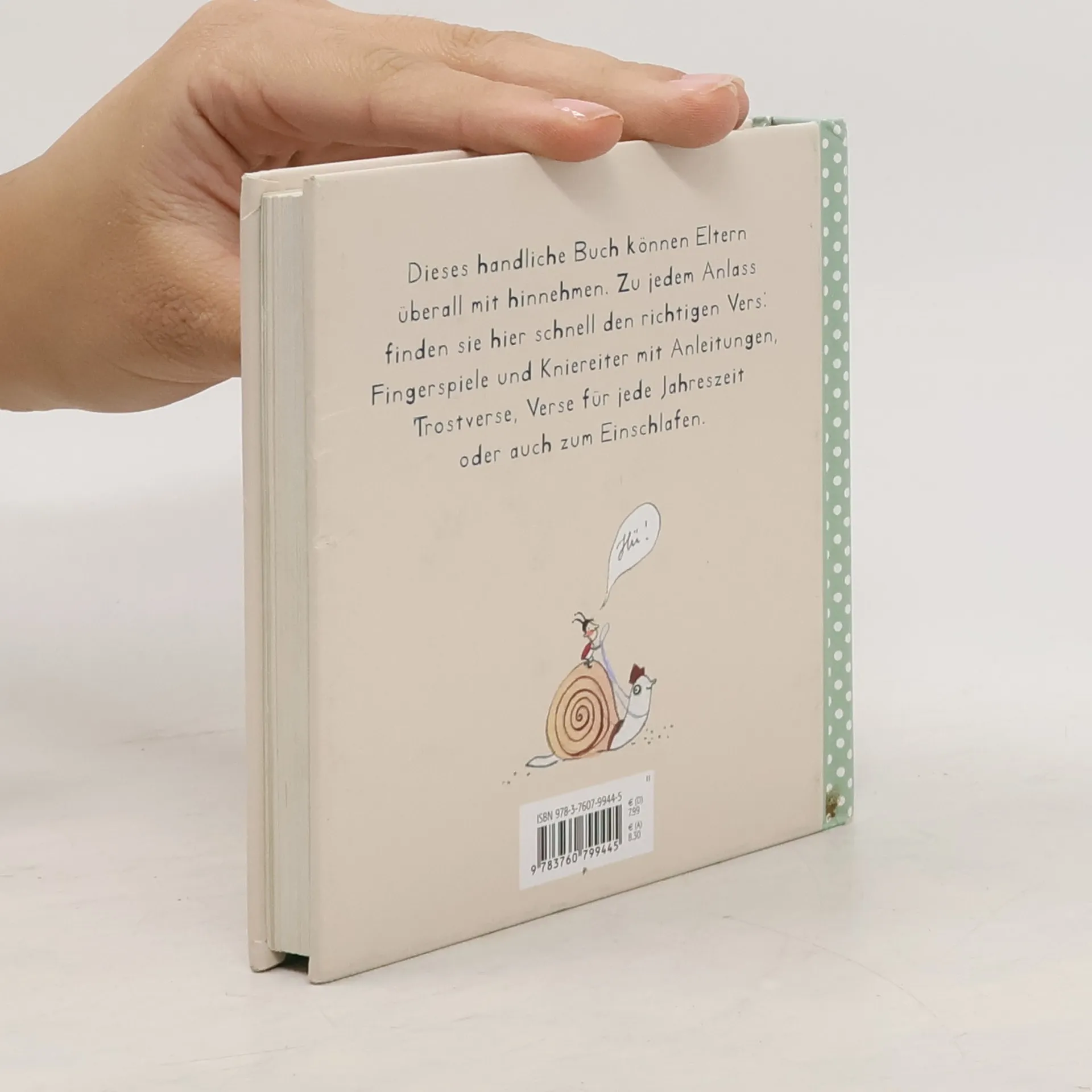 Dieses handliche Buch können Eltern überall mithinnehmen und finden zu jedem Anlass schnell den richtigen Vers: Fingerspiele und Kniereiter mit Anleitungen, Trostverse, Reime für jede Jahreszeit oder auch zum Einschlafen. So müssen die Eltern nicht alle Verse auswendig lernen, sondern können sie je nach Anlass vorlesen und mit dem Kind nachspielen.