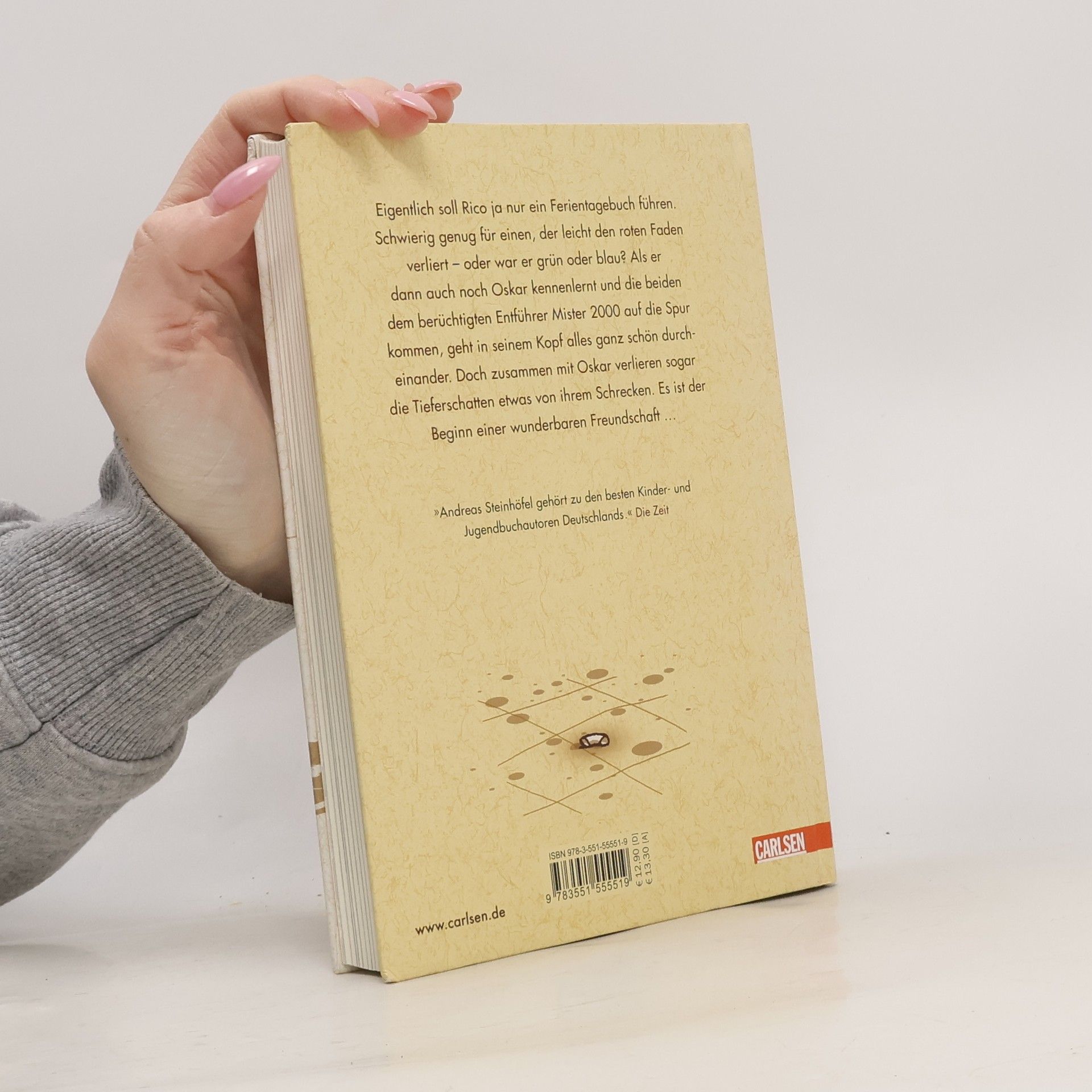 Eigentlich soll Rico ja nur ein Ferientagebuch führen. Schwierig genug für einen, der leicht den roten oder den grünen oder auch den blauen Faden verliert. Aber als er dann auch noch Oskar mit dem blauen Helm kennen lernt und die beiden dem berüchtigten ALDI-Kidnapper auf die Spur kommen, geht es in seinem Kopf ganz schön durcheinander. Doch zusammen mit Oskar verlieren sogar die Tieferschatten etwas von ihrem Schrecken. Es ist der Beginn einer wunderbaren Freundschaft ... Alle Bücher über Rico und Oskar:Rico, Oskar und der Diebstahlstein Rico, Oskar und das Herzgebreche Rico, Oskar und die TieferschattenRico, Oskar und das Vomhimmelhoch Kindercomics:Rico & Oskar – Fische aus Silber Rico & Oskar – Die Regenhütte