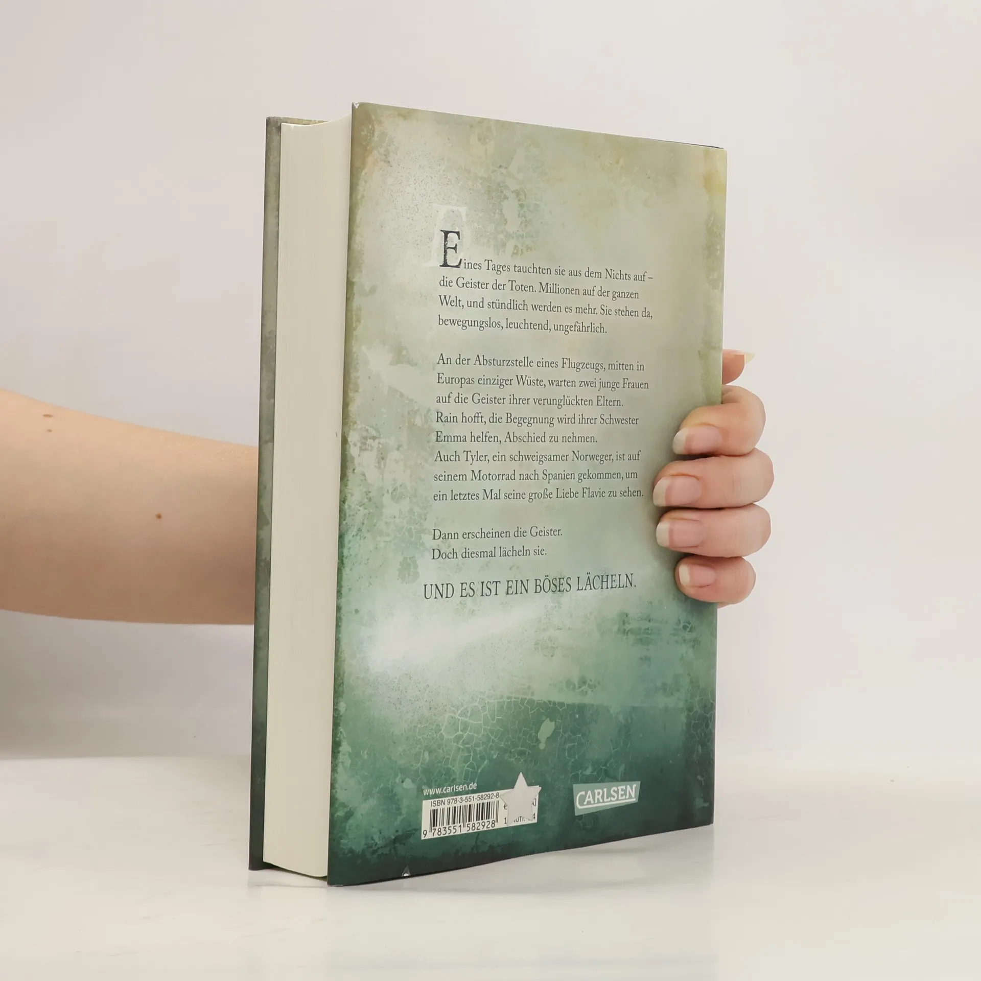 Eines Tages tauchten sie aus dem Nichts auf - die Geister der Toten. Millionen auf der ganzen Welt, und stündlich werden es mehr. Sie stehen da, bewegungslos, leuchtend, ungefährlich. An der Absturzstelle eines Flugzeugs, mitten in Europas einziger Wüste, warten zwei junge Frauen auf die Geister ihrer verunglückten Eltern. Rain hofft, die Begegnung wird ihrer jüngeren Schwester Emma helfen, Abschied zu nehmen. Auch Tyler, ein schweigsamer Norweger, ist auf seinem Motorrad nach Spanien gekommen, um ein letztes Mal seine große Liebe Flavie zu sehen. Dann erscheinen die Geister. Doch diesmal lächeln sie. Und es ist ein böses Lächeln.