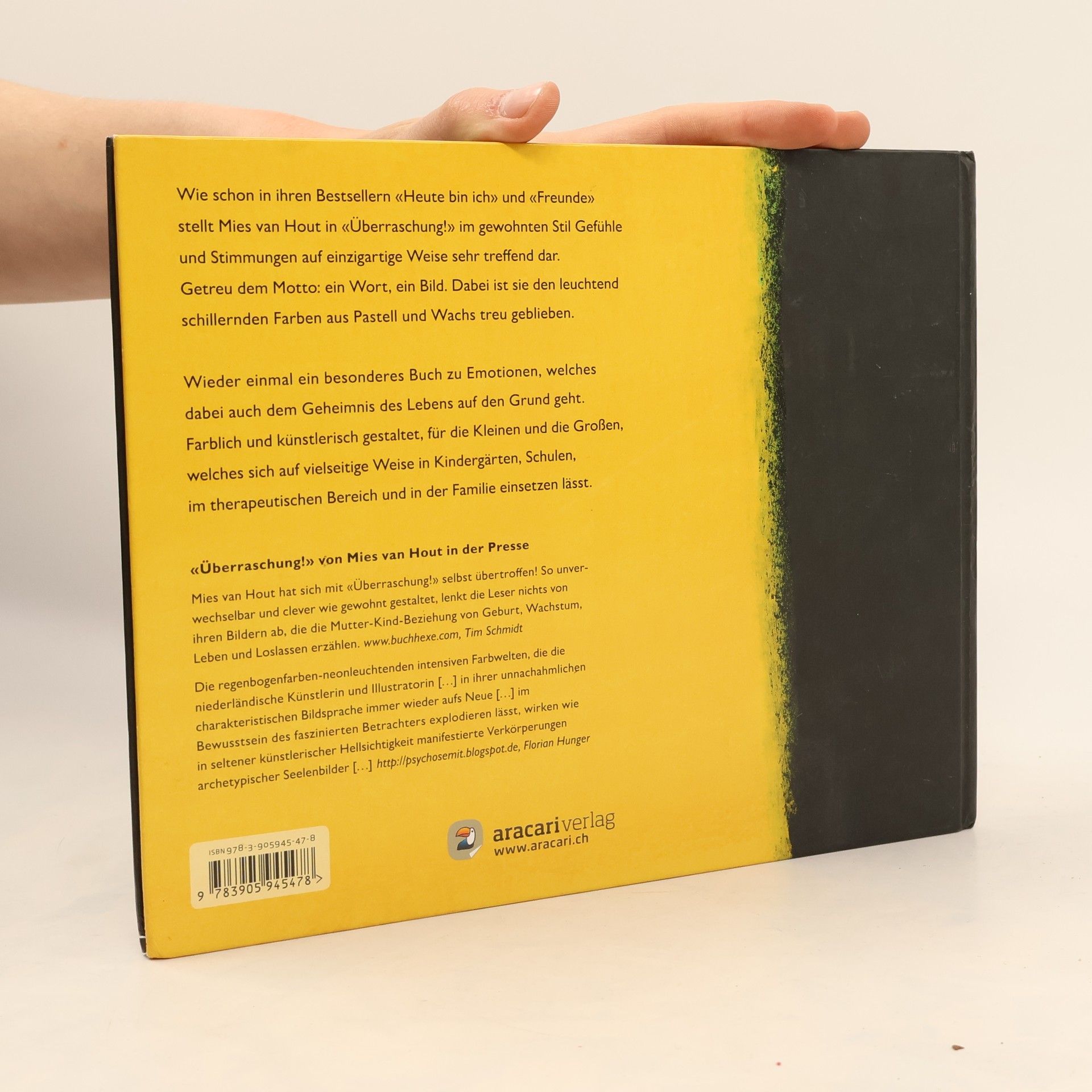 Nach den Bestsellern 'Heute bin ich' und 'Freunde' hat Mies von Hout ein neues Glanzwerk gezeichnet: 'Überraschung!'. Auch hier werden im gewohnten Stil Gefühle und Stimmungen auf einzigartige Weise sehr treffend dargestellt. Getreu dem Motto ein Wort, ein Bild. Dabei ist sie den leuchtend schillernden Farben aus Pastell und Wachs treu geblieben. Wieder einmal ein besonderes Buch zu Emotionen, welches dabei auch dem Geheimnis des Lebens auf den Grund geht. Farblich und künstlerisch gestaltet, für die Kleinen und die Großen, welches sich auf vielseitige Weise in Kindergärten, Schulen, im therapeutischen Bereich und in der Familie einsetzen lässt.