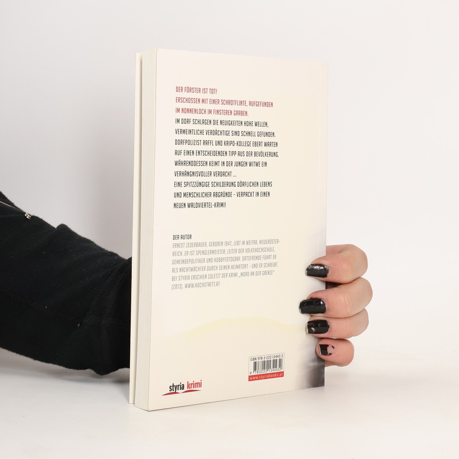 Der Förster ist tot! E rschossen mit einer Schrotflinte, aufgefunden im Nonnenloch im Finsteren Graben. Im Waldviertler Dorf schlagen die Neuigkeiten hohe Wellen, vermeintliche Verdächtige sind schnell gefunden. Dorfpolizist Raffl und Kripo-Kollege Ebert haben alle Hände voll zu tun und warten auf einen entscheidenden Tipp aus der Bevölkerung. Währenddessen keimt in der jungen Witwe ein verhängnisvoller Verdacht und die perfekte Fassade ihres bisherigen Lebens beginnt zu bröckeln … Ein neuer packender Waldviertel- Krimi von Ernest Zederbauer. Jenseits bekannter Forsthausund Jägerklischees sorgen vor dem Lokalkolorit des Waldviertels die Abgründe menschlicher Beziehungen für Spannung bis zur letzten Seite.