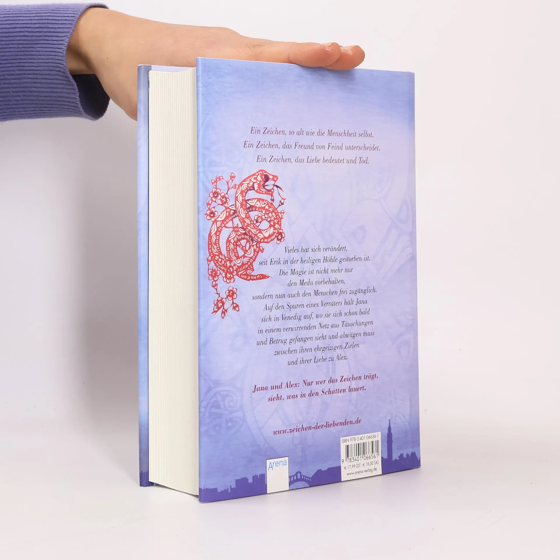 Vieles hat sich verändert, seit Erik in der heiligen Höhle gestorben ist. Die Magie ist nicht mehr nur den Medu vorbehalten, sondern nun auch den Menschen frei zugänglich. Auf den Spuren eines Verräters hält Jana sich in Venedig auf, wo sie sich schon bald in einem verwirrenden Netz aus Täuschungen und Betrug gefangen sieht und abwägen muss zwischen ihren ehrgeizigen Zielen und ihrer Liebe zu Alex. (Quelle: Schutzumschlag verso).