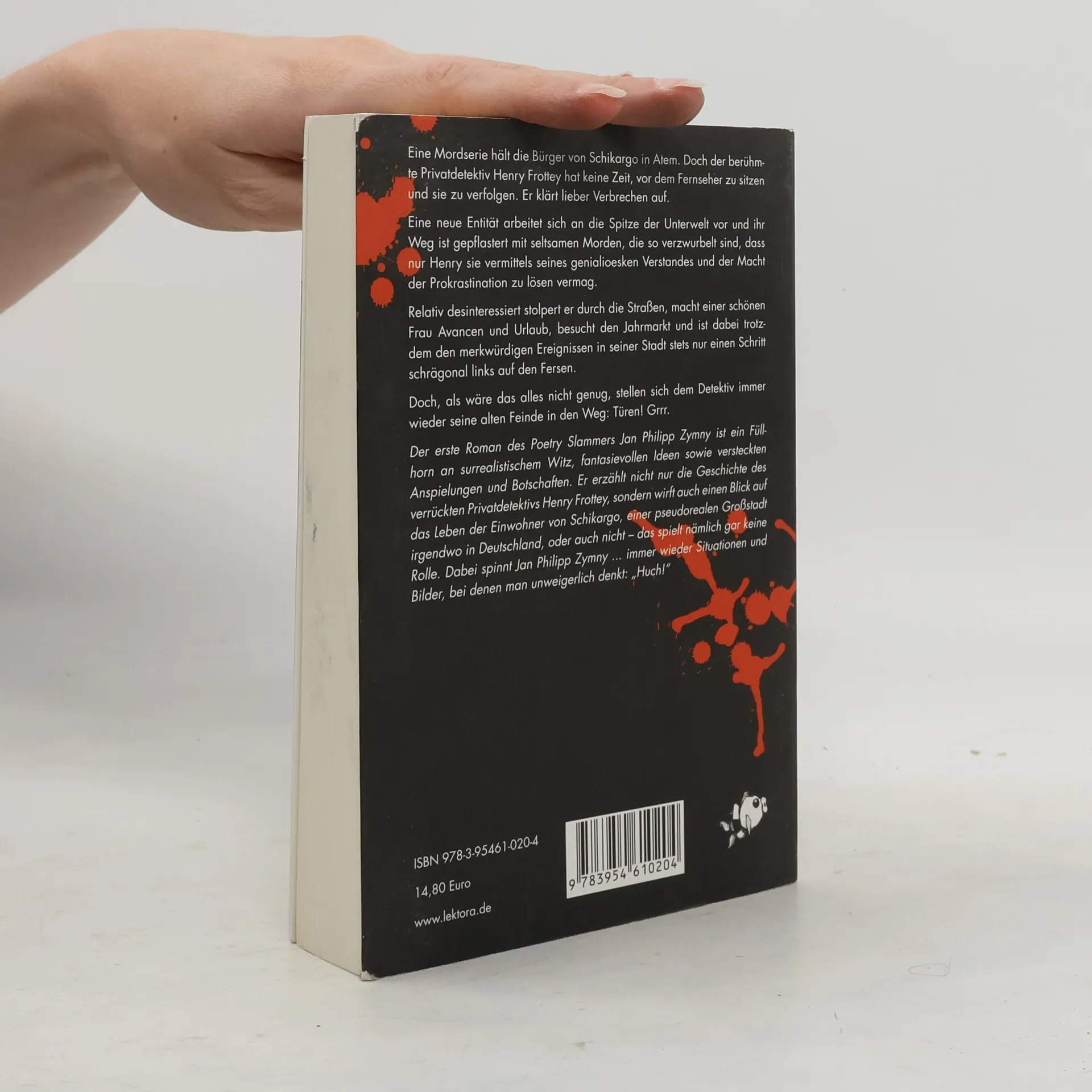 Eine Mordserie hält die Bürger von Schikargo in Atem, doch der berühmte Privatdetektiv Henry Frottey hat keine Zeit für den Fernseher. Er zieht es vor, Verbrechen aufzuklären. Eine neue Entität drängt in die Unterwelt, und ihr Weg ist gespickt mit seltsamen Morden, die nur Henry mit seinem genialen Verstand und der Macht der Prokrastination lösen kann. Relativ desinteressiert schlendert er durch die Straßen, macht einer schönen Frau Avancen, genießt seinen Urlaub und besucht den Jahrmarkt, während er den merkwürdigen Ereignissen in seiner Stadt stets einen Schritt schrägonal links folgt. Doch als wäre das nicht genug, stehen ihm immer wieder alte Feinde im Weg: Türen! Der erste Roman des amtierenden deutschsprachigen Meisters im Poetry Slam, Jan Philipp Zymny, ist ein Füllhorn an surrealistischem Witz und fantasievollen Ideen. Er erzählt nicht nur die Geschichte des verrückten Privatdetektivs, sondern wirft auch einen Blick auf das Leben der Einwohner von Schikargo, einer pseudorealen Großstadt in Deutschland. Neben „Mord in der Jugendherberge“ integriert Zymny einige seiner bekannten Poetry-Slam-Texte wie „Awesome“, „Bärenkatapult“ und „Ein chinesisches Märchen“ kunstvoll in die Erzählung.