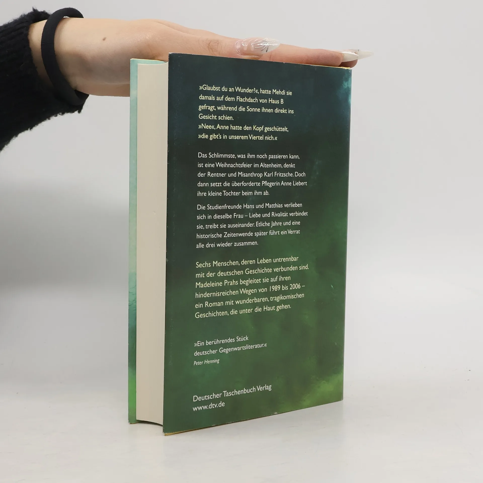 »Ein berührendes Stück deutscher Gegenwartsliteratur.« Peter Henning Als Kind flieht Anne Liebert kurz vor dem Mauerfall in den Westen. Später, zurück in Berlin, schlägt sie sich als Altenpflegerin durch, allein mit ihrer kleinen Tochter Marie. Das Glück, scheint es, ist nach unbekannt verzogen, und dann spült ihr das Schicksal auch noch den Rentner Karl Fritzsche vor die Füße. Der Misanthrop und Diabetiker sitzt auf seinem Balkon und wartet auf das Ende – bis eines Tages Marie in seinem Wohnzimmer steht, und nichts ist mehr, wie es einmal war. Hans, Hanna und Matthias haben sich während des Studiums kennengelernt – eine Freundschaft, eine Liebe, eine Rivalität. Die deutsche Geschichte treibt ihre Lebenswege auseinander, ein Verrat schließlich führt sie wieder zusammen. Vom kleinen Mädchen über den Kunsthistoriker, der aus der Republik flüchtete, bis zum alten, verwitweten Mann – tief taucht der Leser in die Leben von sechs Figuren ein und begleitet sie von 1989 bis 2006 auf dem hindernisreichen und oft überraschenden Parcours durch die eigene Biographie. Ein Roman mit wunderbaren, tragikomischen Geschichten von der Verlorenheit im Leben und der Sehnsucht nach einem anderen.