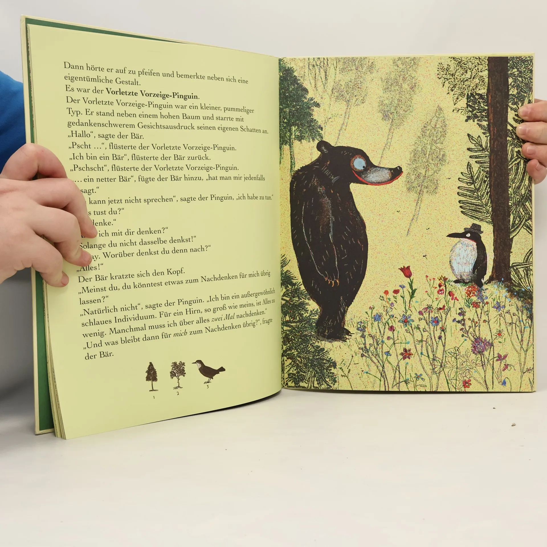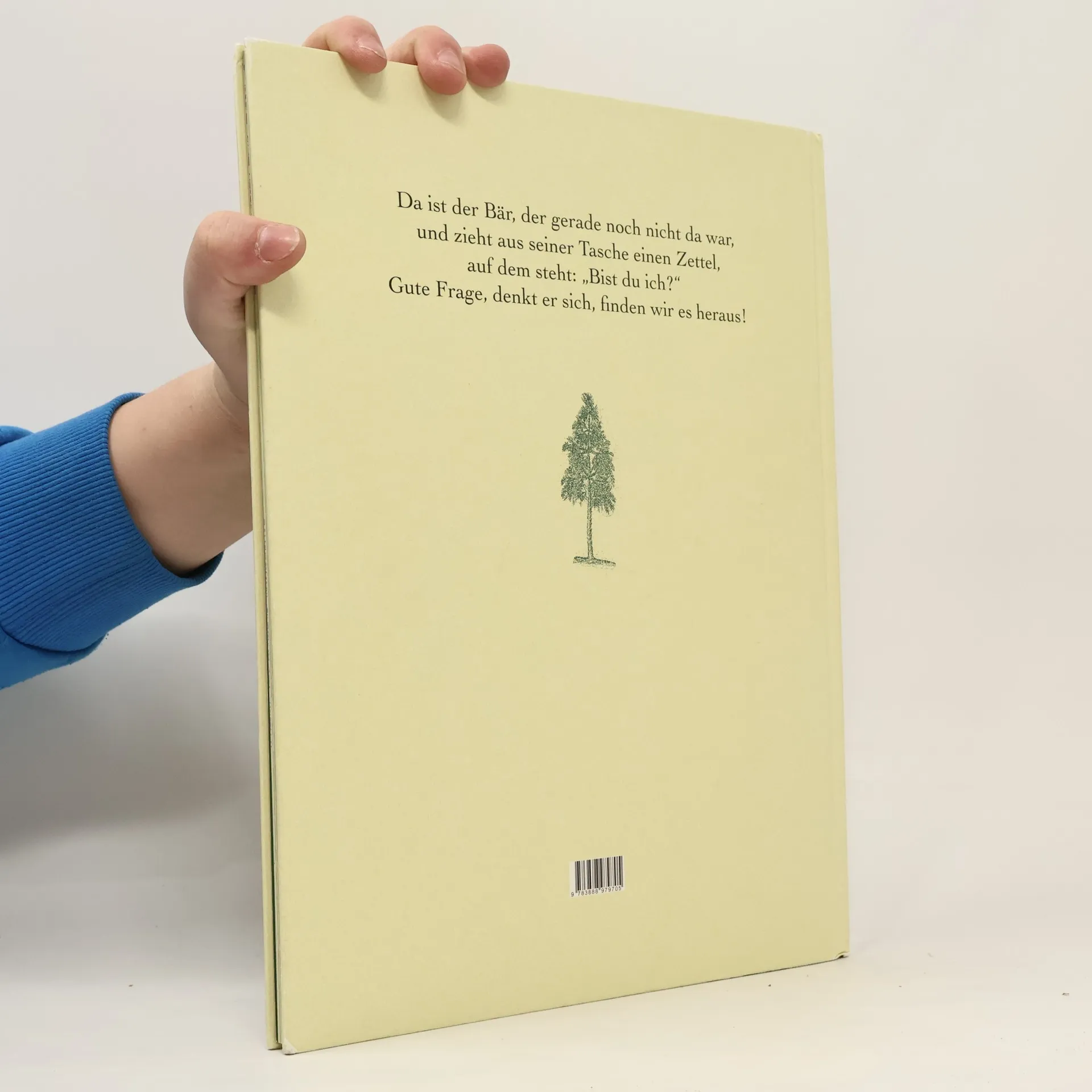 Da ist er, der Bär, der gerade noch nicht da war, und zieht aus seiner Tasche einen Zettel, auf dem steht: „Bist du ich?“ Gute Frage, denkt er sich, finden wir es heraus! Sofort macht er sich auf und wandert in den wundersamen Wald. Dort trifft er das Bequeme Bergrind und den Saumseligen Salamander, die ihm versichern, er sei ein sehr netter Bär! Glücklich wandert er weiter. Bis zum Kompass-Baum. Von da aus geht es in acht Richtungen: Norden, Süden, Osten, Westen, Falsch, Richtig, Mittagessen und Frühstück. Welche sollte er einschlagen: Frühstück? Mittagessen? Und wäre nicht das Träge-Schildkröten-Taxi gekommen, würde der Bär immer noch überlegen. Wir aber wissen jetzt schon: Dieser Bär ist sehr nett, und er ist glücklich. Er könnte ein entfernter Verwandter von „Pu, der Bär“ sein, so wie er auf die Welt schaut. Und weil jeder gerne wissen will, wer er ist, werden Kinder und Erwachsene diesen Bären und diese zauberhafte, philosophische Geschichte mit den unvergesslichen Bildern von Wolf Erlbruch lieben.