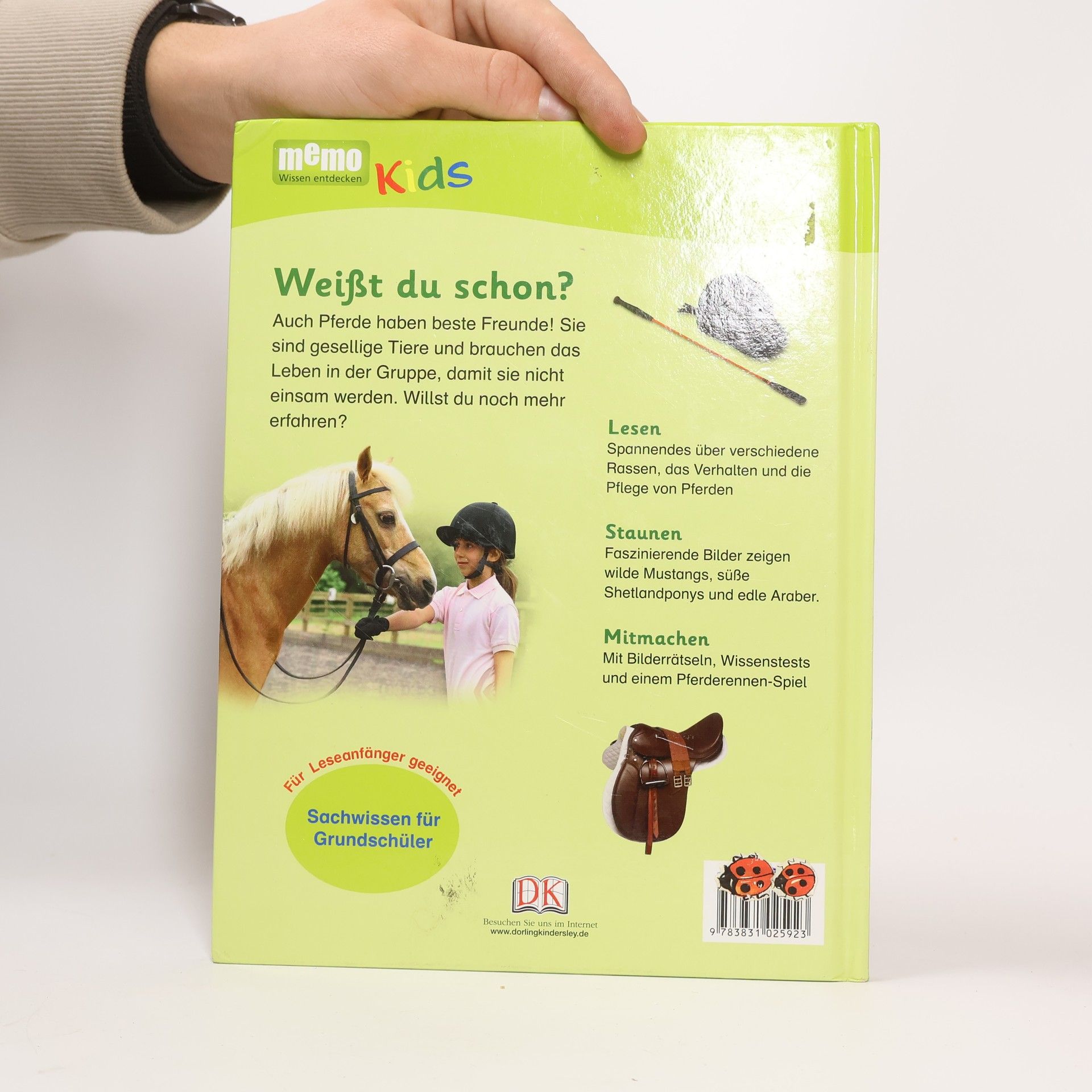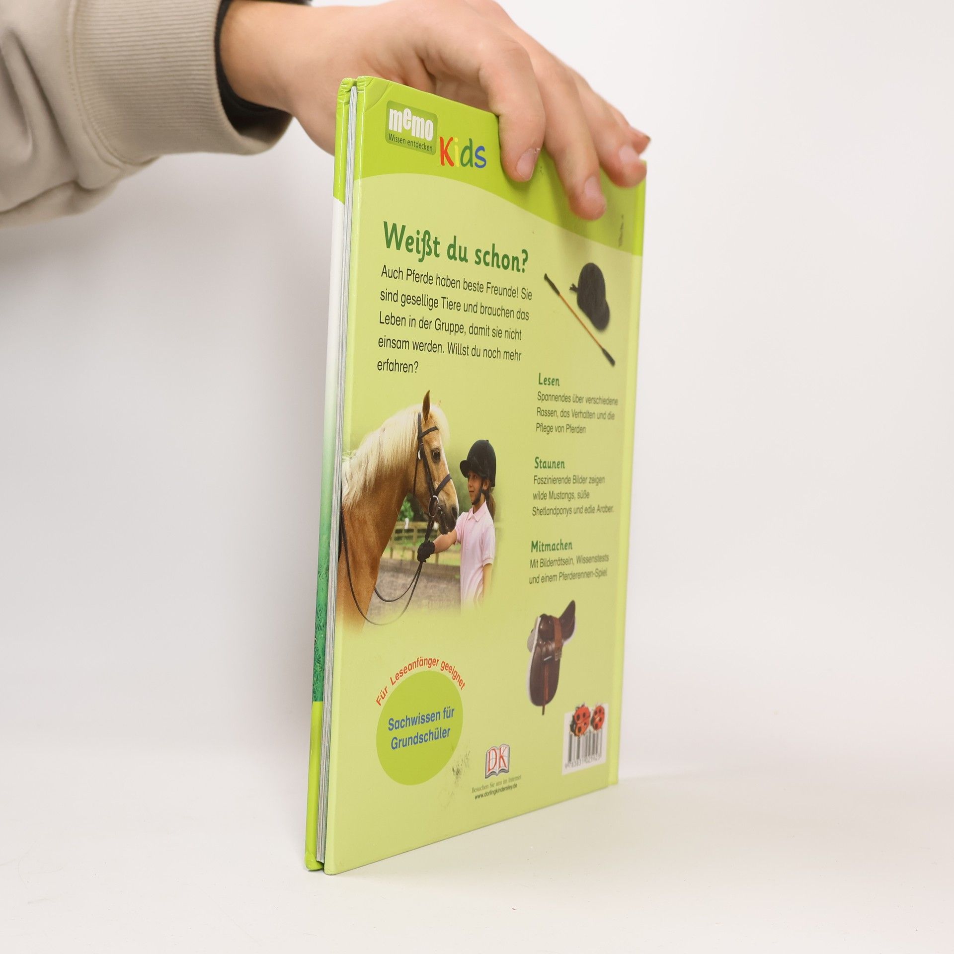 Lesen, staunen, mitmachen – das ist das Motto von memo Kids! Wo leben heute noch Wildpferde? Welche Reitstile gibt es? In Band 5 der Wissensreihe für Erstleser dreht sich alles um Pferde und Ponys. Kurze, lebendige Texte erzählen Spannendes über verschiedene Rassen, das Verhalten und die Pflege von Pferden. Faszinierende Bilder zum Staunen zeigen wilde Mustangs, süße Shetlandponys und edle Araber. Die altersgerecht aufbereiteten Informationen sind für Leseanfänger einfach verständlich, so dass auch schwierige Zusammenhänge deutlich werden. Viele bunte Fotografien und Illustrationen veranschaulichen das Thema und helfen, das Gelesene zu begreifen. Wissenstests, Bilderrätsel und ein Pferderennen-Spiel regen zum Mitmachen an und vertiefen spielerisch das Gelernte. Ein Glossar am Ende des Buches erklärt schwierige Wörter und »Weißt du das?«-Kästen heben besonders interessante Fakten hervor. Durch die optimale Ausgewogenheit von Bild und Text ist »memo Kids – Pferde und Ponys« ideal zum Vor- oder Selberlesen geeignet. Wissen zum Sammeln: Alle memo Kids Bände sind nummeriert und sind mit einem durchgängigen Rückendesign gestaltet – so wächst mit jedem neuen Band im Bücherregal ein cooles Motiv mit! Dieses Buch ist bei Antolin. de verfügbar.