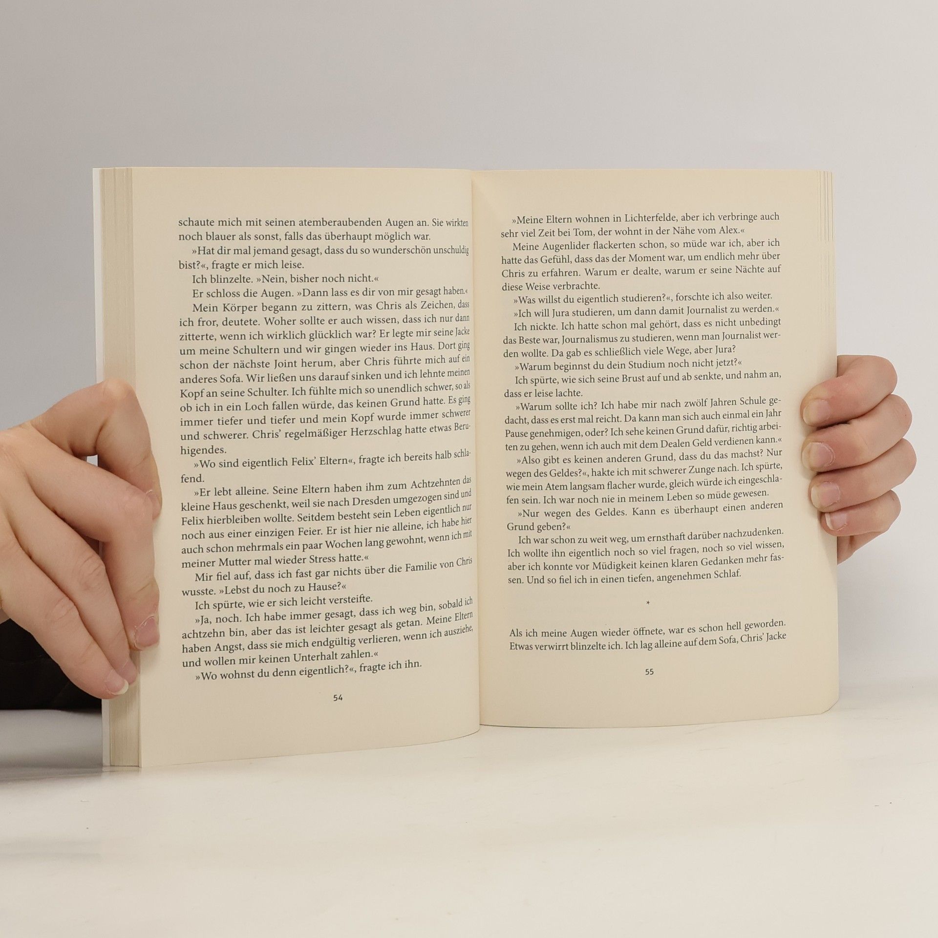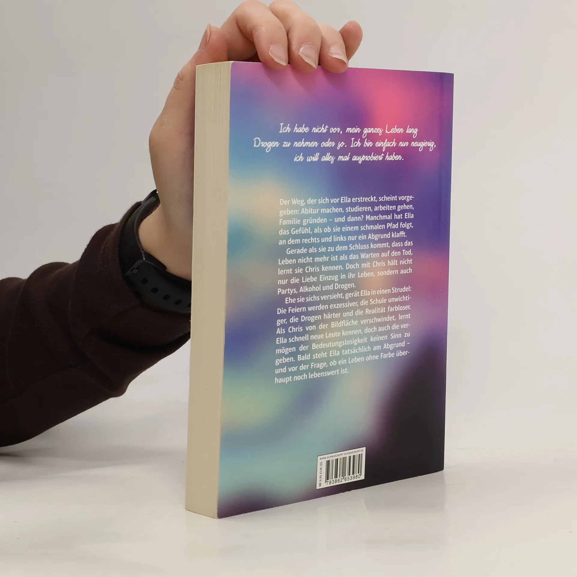 Ella, 16 Jahre alt, wächst in einem geschützten Berliner Stadtteil auf. Ihre intakte Familie, gute Noten und Freundinnen lassen sie nach außen zufrieden erscheinen. Doch innerlich fühlt sie sich durchschnittlich und gelangweilt von ihrem vorbestimmten Leben. Auf einer Feier lernt sie den 18-jährigen Chris kennen und verliebt sich in ihn. Chris führt Ella in eine Welt ein, die sie zunächst skeptisch betrachtet: Partys, Alkohol und Drogen. Anfangs widerwillig lässt sie sich darauf ein und entdeckt die Freude am Moment. Doch bald gerät sie in eine Abwärtsspirale, vernachlässigt die Schule, isst kaum noch und kauft sich eigenes Gras, während sie auch härtere Drogen ausprobiert. Die Nachricht von der schweren Krebserkrankung ihres Vaters erreicht sie nicht mehr wirklich; sie hat sich zu weit von ihrer Familie entfernt. Als Chris schließlich aus ihrem Leben verschwindet, bricht ihre kleine Welt zusammen. Ella steht vor einem ausweglosen Kampf, in dem sie nicht einmal mehr weiß, wofür sie kämpfen soll. In ihrem Debütroman reflektiert die junge Autorin die Herausforderungen ihrer Generation und die Suche nach einem sinnvollen Weg in einer Zeit voller Möglichkeiten, die jedoch oft unerreichbar erscheinen. Eindringlich und poetisch.