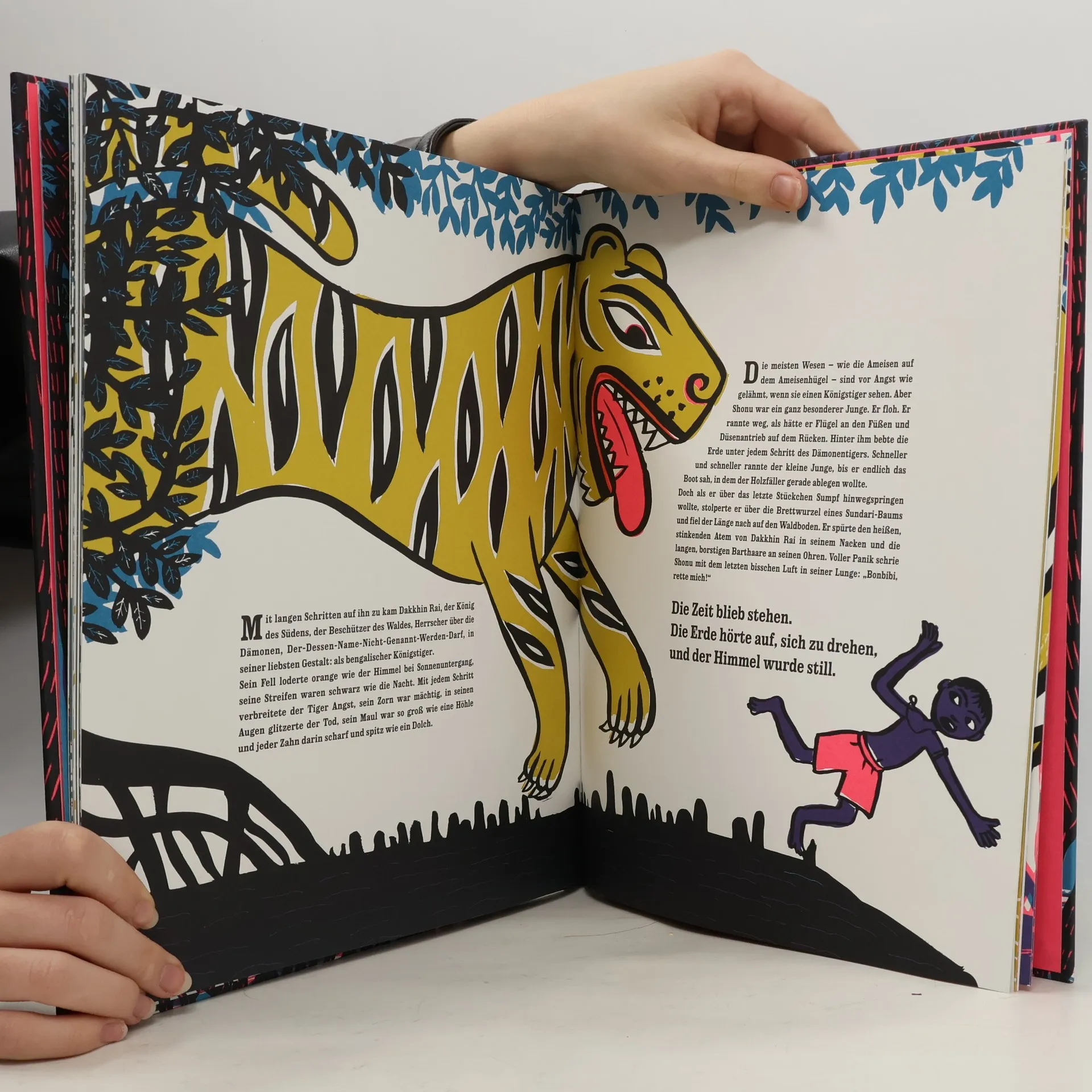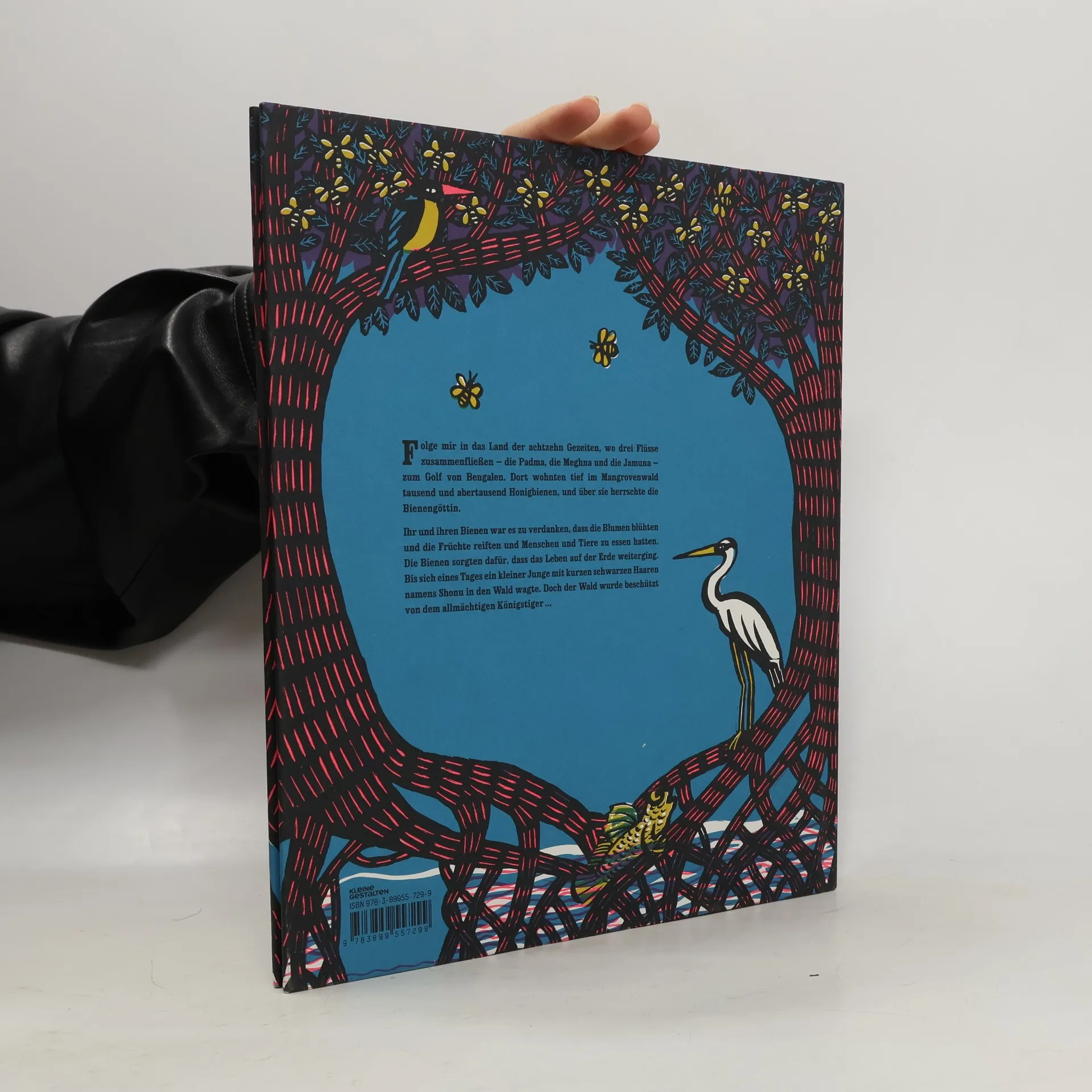 Im Sundarban mit seinen achtzehn Gezeiten und sechs Jahreszeiten, hier, wo sich drei Flüsse in einem großen Mangrovenwald treffen, beginnt die Geschichte des Honigdiebs. Zunächst ist eigentlich alles friedlich: Unweit der bengalischen Bucht leben Tausende und Abertausende Honigbienen. Sie fliegen von Blume zu Blume, sammeln Nektar und versorgen die Menschen und Tiere des Landes mit dem süßen, flüssigen Gold. Alle Bewohner des Sundarbans lieben den Honig, doch einer liebt den Honig am allermeisten: ein kleiner, schwarzhaariger Junge namens Shonu. Als in einem Jahr die Jahreszeiten durcheinandergeraten, wird der Sundarban von schweren Wirbelstürmen, Dürre und Hunger heimgesucht. Von seinem unfassbaren Hunger gequält, zieht Shonu also heimlich in den Wald und bricht die goldene Regel: Er macht sich über die Bienenstöcke her, obwohl es noch gar nicht Erntezeit ist. Dass er dadurch riesige Schwierigkeiten mit Dem-Dessen-Name-Nicht-Genannt-Werden-Darf bekommen würde, hatte Shonu nicht bedacht. Die Erzählung vom Honigdieb zeigt, was passiert, wenn jemand in den Rhythmus der Natur eingreift und lehrt Kinder, die Natur zu respektieren und zu schätzen. Inspiriert von muslimischen und hinduistischen Mythen, haben die Autorin Karthika Naïr und die Illustratorin Joëlle Jolivet eine ganz besondere Erzählweise und Bildsprache gefunden.