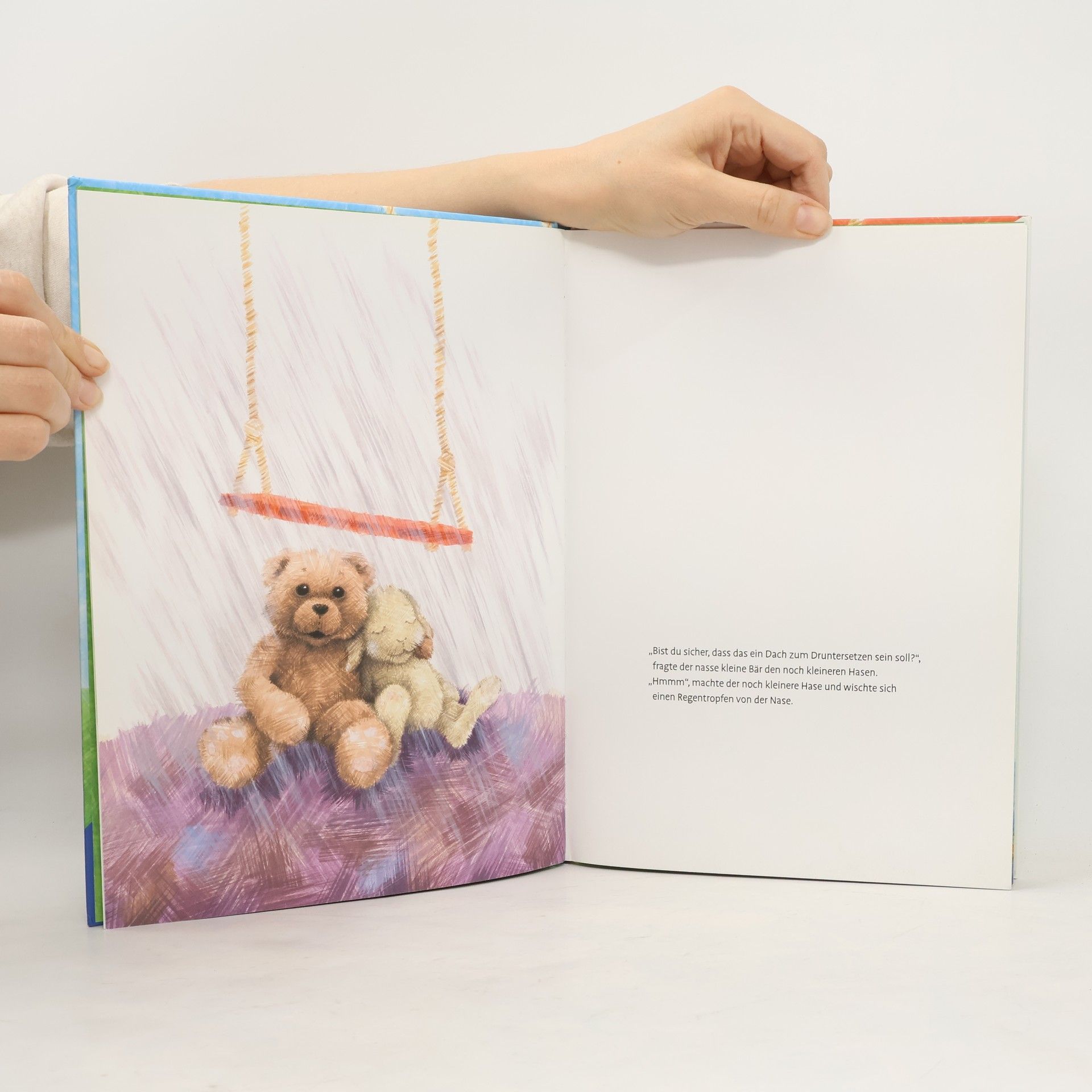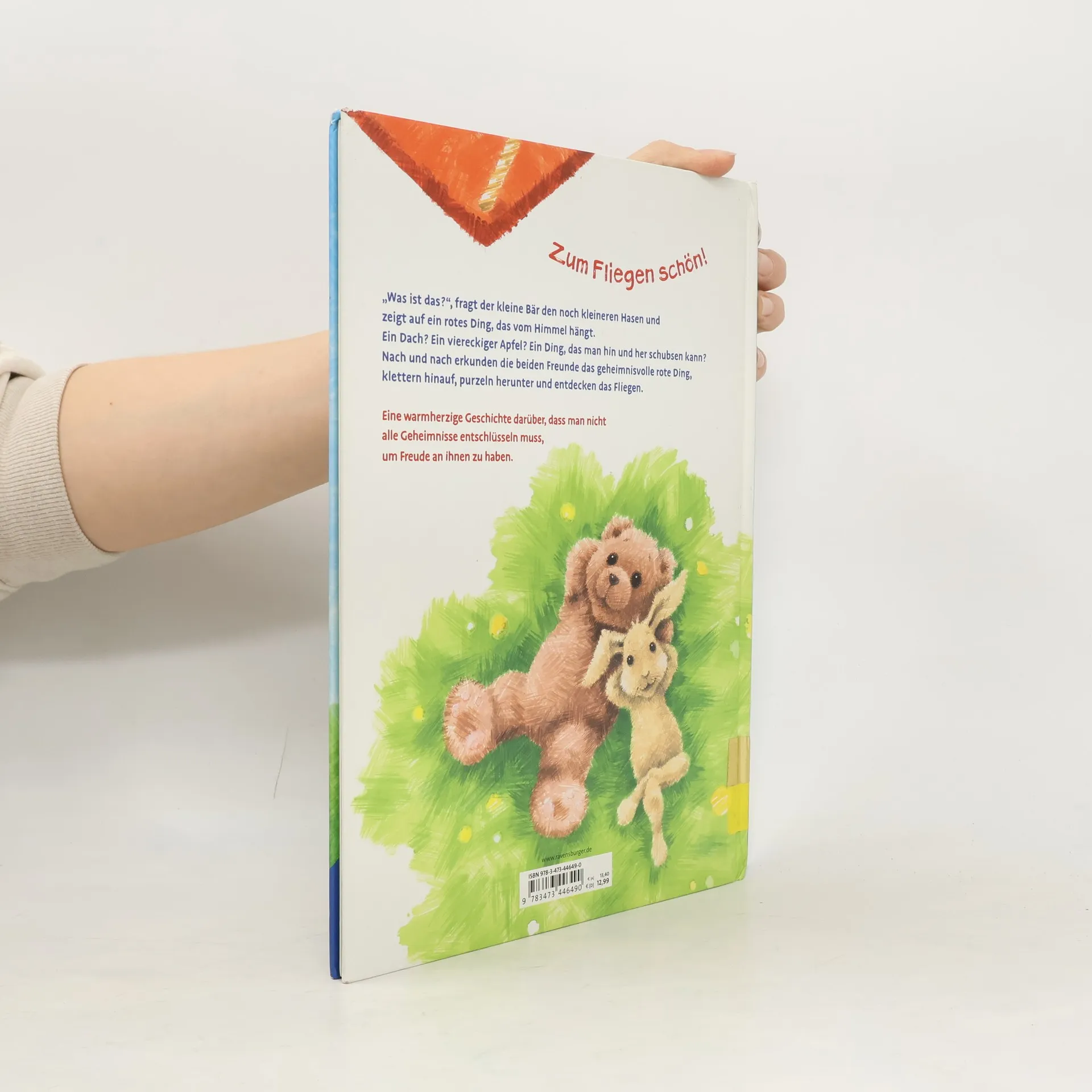 Der kleine Bär und der noch kleinere Hase finden ein seltsames rotes Ding. Es sieht aus wie ein viereckiger Apfel. Oder wie ein Regendach? Was kann das bloß sein? Hase und Bär wollen unbedingt herausfinden, was es mit dem roten Ding auf sich hat. Doch selbst als sie darauf rumklettern und gemeinsam schaukeln, werden sie nicht schlauer. Aber schließlich ist es ihnen egal, ob sie wissen, was das Ding eigentlich ist, Hauptsache das Schaukeln darauf macht Spaß. Eine warmherzige Geschichte darüber, dass man nicht alle Geheimnisse entschlüsseln muss, um Freude an ihnen zu haben.