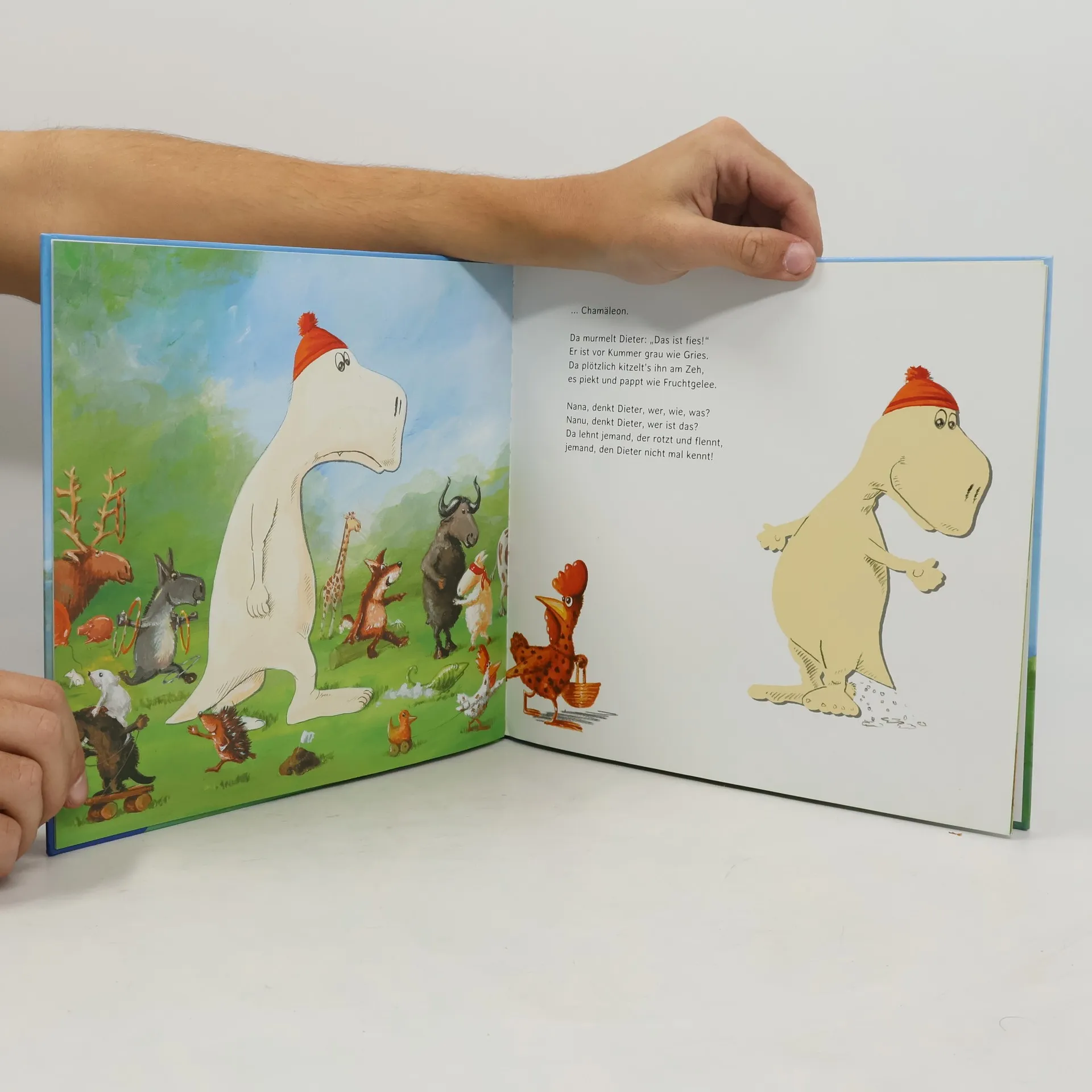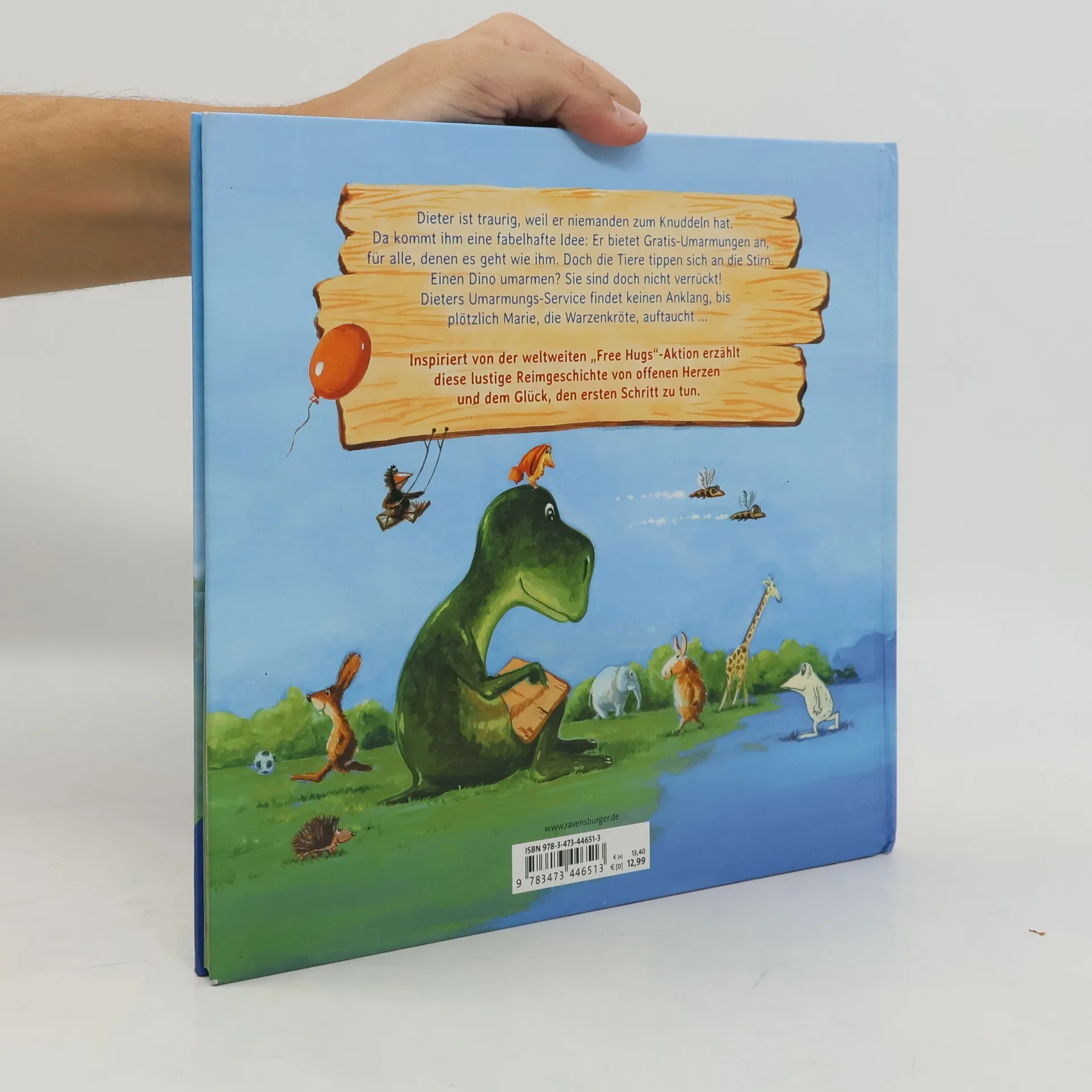 Dino Dieter sitzt traurig im Park. Alle anderen haben Freunde, nur er ist allein. Aber dann tröstet er ein trauriges Küken mit einer dicken Umarmung und stellt fest, das tut ihm selbst auch gut! Und da kommt ihm eine Idee: Er bietet Gratis-Umarmungen an für alle, die sich einsam fühlen. Aber wer will schon einen Dino umarmen? Dieters Idee findet keinen Anklang, bis eine Warzenkröte und eine Wabbel-Qualle kommen. Und wie es so ist, will einer, wollen plötzlich alle ... Ein warmherziges Bilderbuch, das zum Knuddeln vor dem Einschlafen einlädt und die Frage stellt: „Und wen umarmst du?“