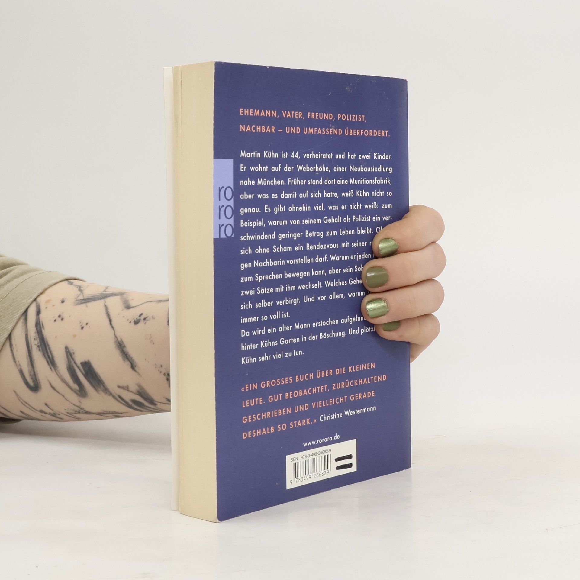 Ehemann, Vater, Freund, Polizist, Nachbar – und umfassend überfordert. Martin Kühn ist 44, verheiratet und hat zwei Kinder. Er wohnt auf der Weberhöhe, einer Neubausiedlung nahe München. Früher stand dort eine Munitionsfabrik, aber was es damit auf sich hatte, weiß Kühn nicht so genau. Es gibt ohnehin viel, was er nicht weiß: Zum Beispiel, warum von seinem Gehalt als Polizist ein verschwindend geringer Betrag zum Leben bleibt. Ob er sich ohne Scham ein Rendezvous mit seiner rothaarigen Nachbarin vorstellen darf. Warum er jeden Mörder zum Sprechen bewegen kann, aber sein Sohn nicht mal zwei Sätze mit ihm wechselt. Welches Geheimnis er vor sich selber verbirgt. Und vor allem, warum sein Kopf immer so voll ist. Da wird ein alter Mann erstochen aufgefunden, gleich hinter Kühns Garten in der Böschung. Und plötzlich hat Kühn sehr viel zu tun.