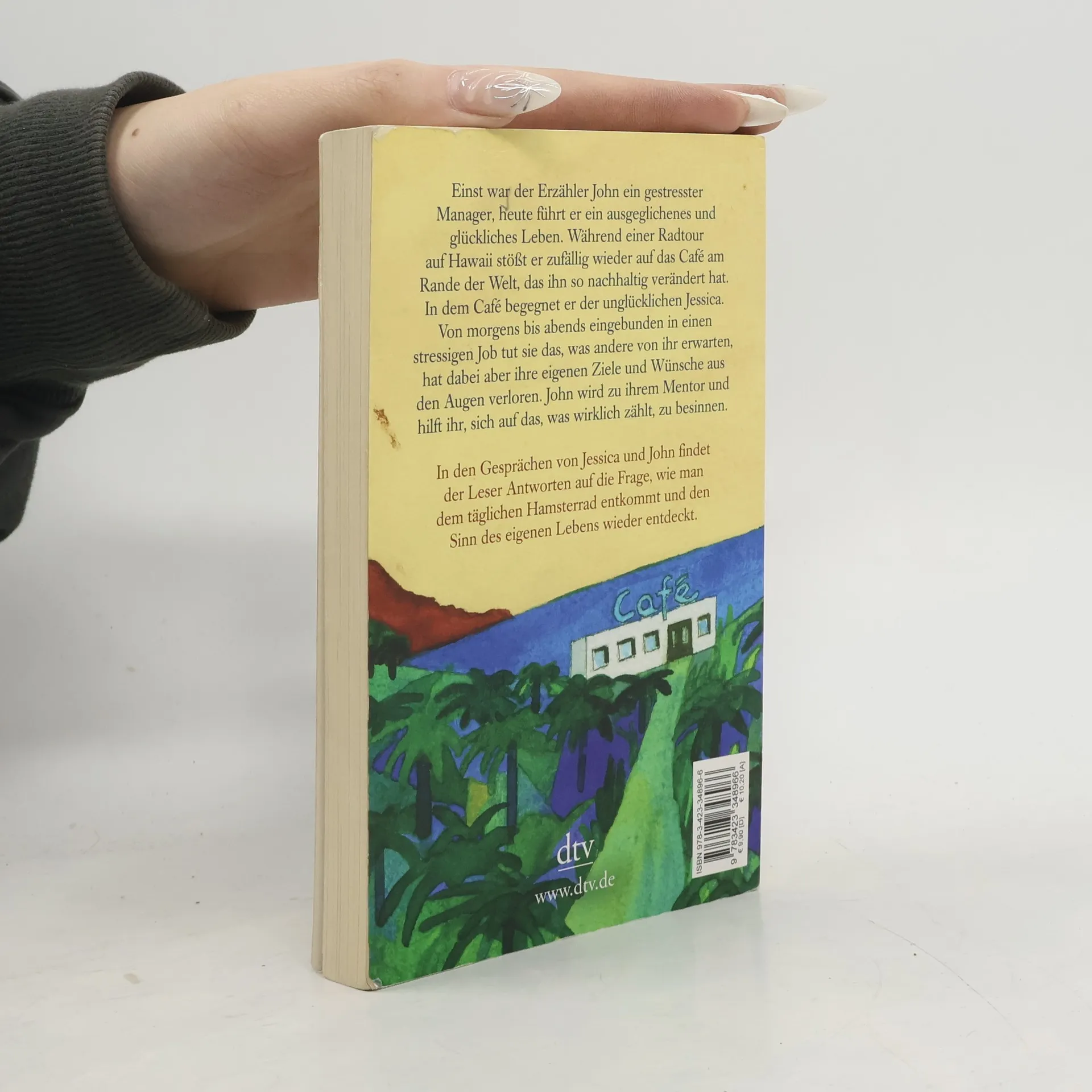 Inspirationen fürs eigene Leben Einst war der Erzähler John ein gestresster Manager, heute führt er ein ausgeglichenes und glückliches Leben. Während einer Radtour auf Hawaii erinnert sich John an den Tag vor zehn Jahren, der sein Leben radikal verändert hat. Damals war er zufällig auf das Café am Rande der Welt gestoßen. Und obwohl er sich an einem völlig anderen Ort befindet, Tausende Kilometer entfernt, sieht er es plötzlich wieder. In dem Café begegnet er Jessica, die unglücklich mit ihrem Leben ist. Eingebunden in ein stressiges Arbeitsleben, tut sie das, was andere von ihr erwarten, hat dabei aber ihre eigenen Ziele und Wünsche aus den Augen verloren. John wird zu ihrem Mentor und hilft ihr, sich auf den Sinn ihres Lebens zu besinnen. In den Gesprächen von Jessica und John findet der Leser Antworten auf die Frage, wie man dem täglichen Hamsterrad entkommt und den Sinn des eigenen Lebens wieder entdeckt. Wunderbar vierfarbig illustriert von Root Leeb.