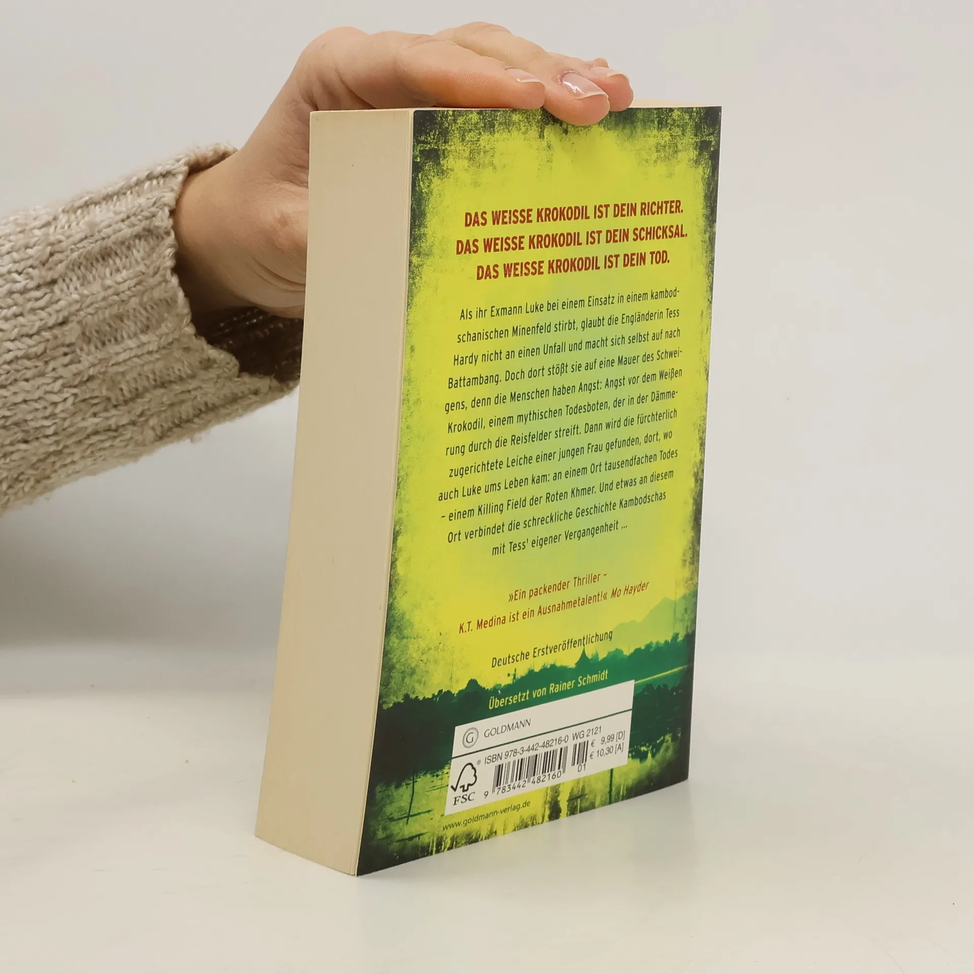 Als ihr Exmann Luke bei einem Einsatz in einem kambodschanischen Minenfeld stirbt, glaubt die Engländerin Tess Hardy nicht an einen Unfall und macht sich selbst auf nach Battambang. Doch dort stößt sie auf eine Mauer des Schweigens, denn die Menschen haben Angst: Angst vor dem Weißen Krokodil, einem mythischen Todesboten, der in der Dämmerung durch die Reisfelder streift. Dann wird die fürchterlich zugerichtete Leiche einer jungen Frau gefunden, dort, wo auch Luke ums Leben kam: an einem Ort tausendfachen Todes – einem der Killing Fields der Roten Khmer. Und etwas an diesem Ort verbindet die schreckliche Geschichte Kambodschas mit Tess' eigener Vergangenheit ...