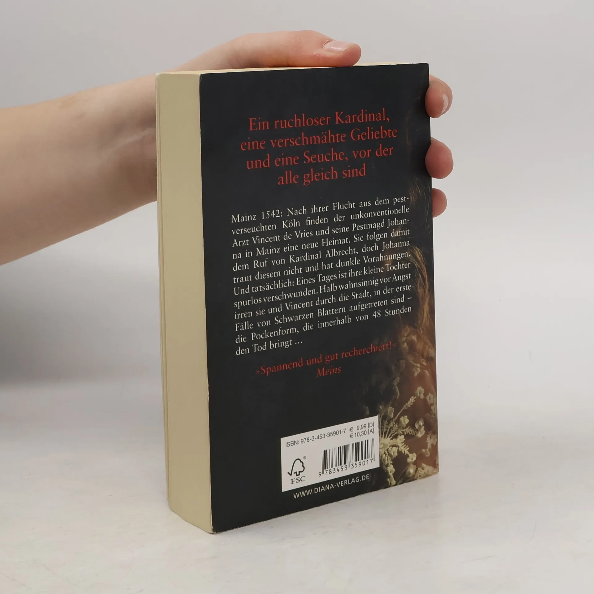 Ein ruchloser Kardinal, eine verschmähte Geliebte und eine Seuche, vor der alle gleich sind Mainz 1542: Nach der Flucht aus dem pestverseuchten Köln finden der unkonventionelle Arzt Vincent de Vries und seine Pestmagd Johanna in Mainz eine neue Heimat. Doch Johanna hat dunkle Vorahnungen. Und tatsächlich: Eines Tages ist ihre kleine Tochter spurlos verschwunden. Halb wahnsinnig vor Angst irren sie und Vincent durch die Stadt, in der erste Fälle von Schwarzen Blattern aufgetreten sind – die Pockenform, die innerhalb von 48 Stunden den Tod bringt …