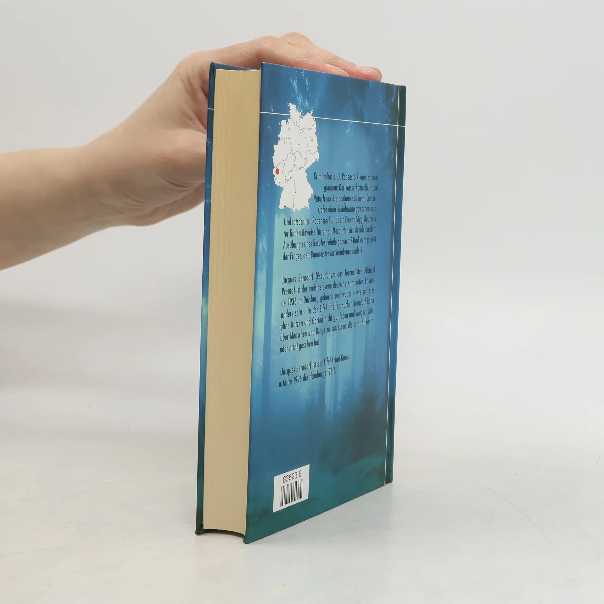 Kriminalrat a. D. Rodenstock kann es nicht glauben: Der Wasserkontrolleur und Naturfreak Breidenbach soll beim Campen Opfer einer Steinlawine geworden sein. Und tatsächlich: Rodenstock und sein Freund Siggi Baumeister finden Beweise für einen Mord. Hat sich Breidenbach in Ausübung seines Berufes Feinde gemacht? Und wem gehört der Finger, den Baumeister im Steinbruch findet? Der zehnte Band der Eifel-Serie. 'Unfall oder Mord? Auch im zehnten Fall ermittelt Siggi Baumeister wieder gegen die Ungerechtigkeiten der Provinz. Umgeben von Hund, Katern und Koi stößt er auf üble Machenschaften – diesmal im Sprudelwassermilieu. … In ›Eifel-Wasser‹ erzählt Jacques Berndorf wieder einmal routiniert, aber immer noch spannend, von diebischer Freud und verbrecherischem Leid in seiner Wahlheimat Eifel.' (WAZ)
