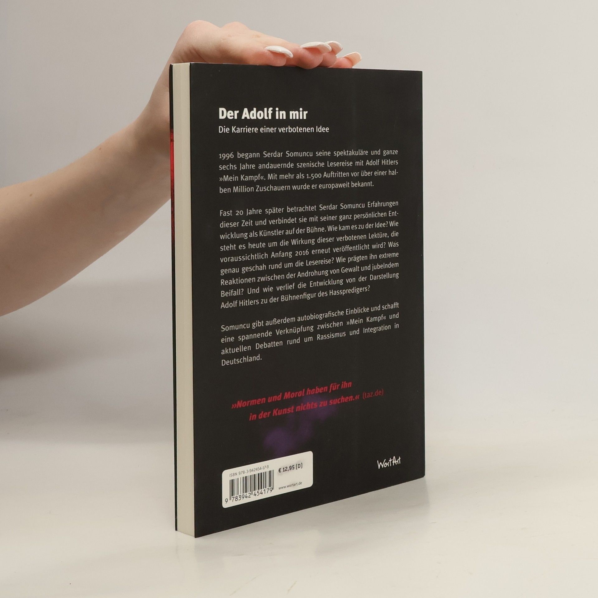 1996 begann Serdar Somuncu seine spektakuläre und ganze sechs Jahre andauernde szenische Lesereise mit Adolf Hitlers Mein Kampf. Mit mehr als 1.500 Auftritten vor über einer halben Million Zuschauern wurde er europaweit bekannt. Fast zwanzig Jahre später betrachtet er in Der Adolf in mir sehr persönliche Erfahrungen dieser Zeit. Wie kam es zu der Idee? Was genau geschah rund um die Lesereise? Und wie prägten ihn Reaktionen zwischen der Androhung von Gewalt und jubelndem Beifall? Er gibt außerdem biografische Einblicke und schafft eine spannende Verknüpfung zwischen Mein Kampf und aktuellen Debatten rund um Rassismus und Integration in Deutschland. Wie steht es heute um die Wirkung dieser verbotenen Lektüre, die voraussichtlich Anfang 2016 vor einer neuen Veröffentlichung steht?