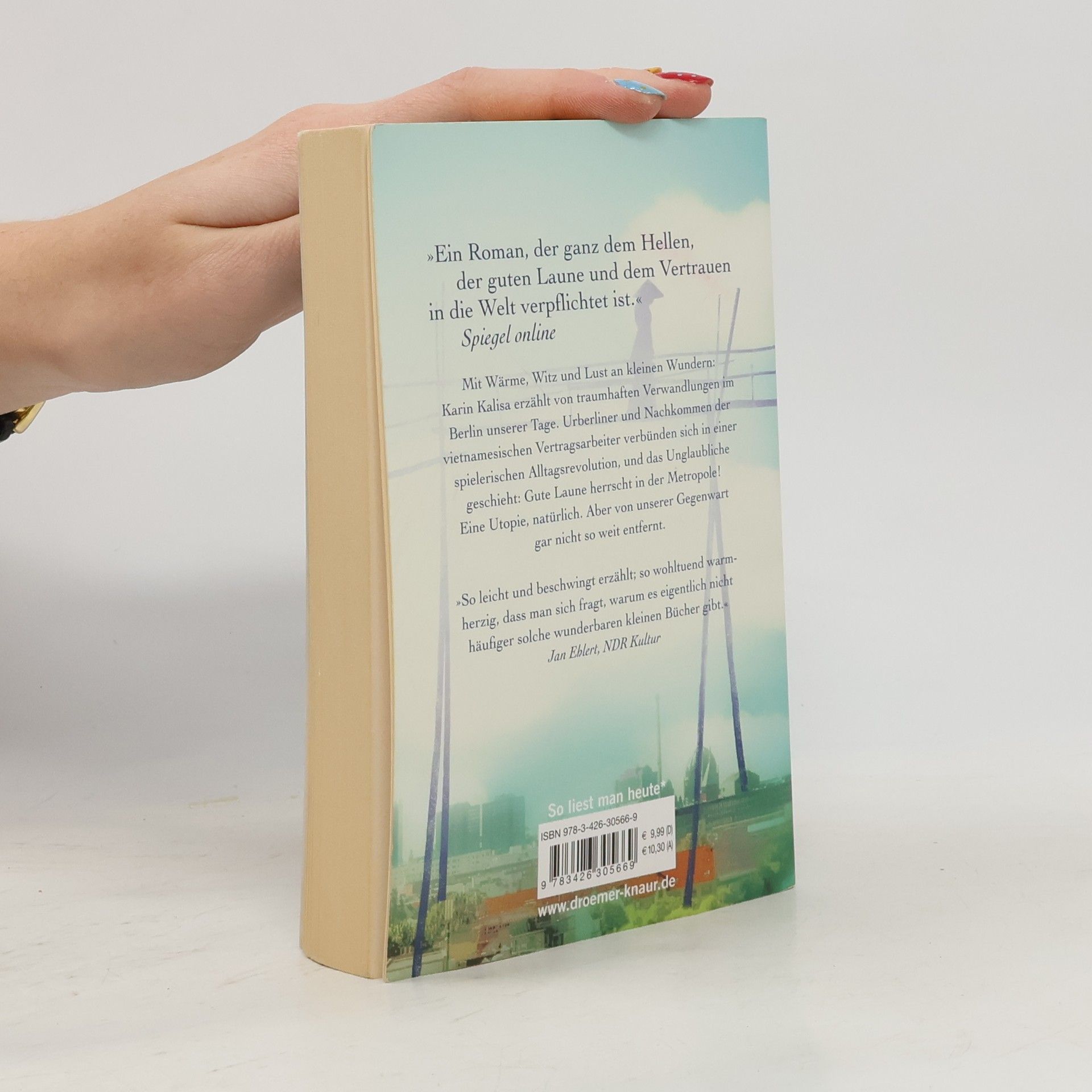 Der Bestseller von Karin Kalisa ist ein Sommer-Roman mit Tiefgang für jede Lebenslage. Mit Wärme, Witz und Lust an kleinen Wundern erzählt Karin Kalisa von traumhaften Verwandlungen im Berlin unserer Tage. Ausgehend vom kleinen vietnamesischen Laden des studierten Archäologen Sung nimmt eine Völkerverständigung der ganz eigenen Art ihren Lauf. Urberliner und Nachkommen der vietnamesischen Vertragsarbeiter verbünden sich in einer spielerischen Alltagsrevolution: Brücken aus Bambus spannen zwischen den Häusern, Parkwächter tragen Kegelhüte, auf Brachflächen grünt exotisches Gemüse, und ein Zahnarzt macht Sonntagsdienst für Patienten aus Fernost. Das Unglaubliche geschieht: Gute Laune herrscht in der Metropole! Eine Utopie, natürlich. Aber von unserer Gegenwart gar nicht so weit entfernt. „So leicht und beschwingt erzählt, so wohltuend warmherzig, dass man sich fragt, warum es eigentlich nicht häufiger solche wunderbaren kleinen Bücher gibt.“ Jan Ehlert, NRD Kultur