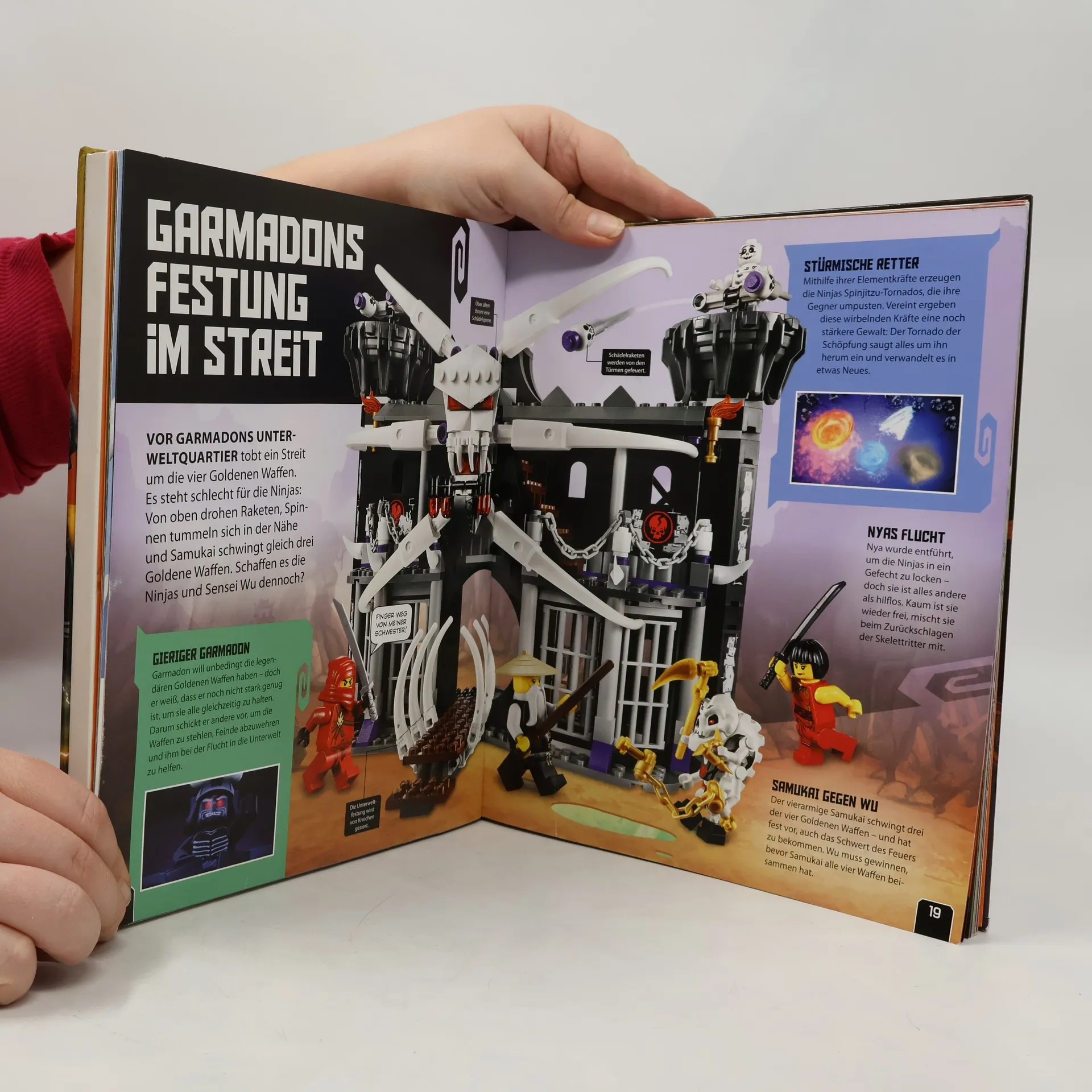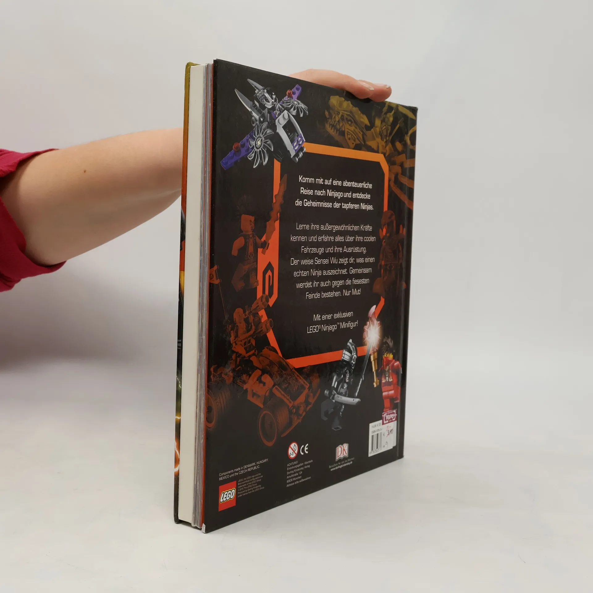 Ninjago ist ein friedlicher Ort, bis er von Lord Garmadon und seiner Skelett-Armee überfallen wird. Nur der Weise Sensei Wu und seine Ninja-Lehrlinge können Ninjago retten, indem sie sich für das Gute einsetzen. Dafür werden die Lehrlinge von Sensei Wu in der Kampfkunst Spinjitzu ausgebildet. - Die Gut-Böse-Geschichte basiert auf der gleichnamigen LEGO-Spielzeug-Produktlinie, die auch als Action-Fernsehserie bekannt ist. Sie ist mit 54 Episoden in 5 Staffeln die am längsten laufende LEGO-Serie. In diesem Jahr lief die 4. und 5. Staffel. Wie beim Anfang des Jahres erschienenen "LEGO Ninjago - Das große Ninja-Lexikon" (ID-A 12/15) werden die LEGO-Ninja-Figuren, ihre beeindruckende Kampfausrüstung und Fahrzeuge in Übergröße auf der TV-Serie entnommenen Fotos gezeigt. Auf Doppelseiten präsentieren sich die Ninjas sowie deren Gegner mit ihren Eigenheiten und Fähigkeiten. Kleine Textanmerkungen und Bildbeschriftungen geben zusätzliche Informationen. Der Sachbildband ist farbig und für die Zielgruppe ansprechend gestaltet. Beigefügt ist die exklusive LEGO-Minifigur Sensei Wu