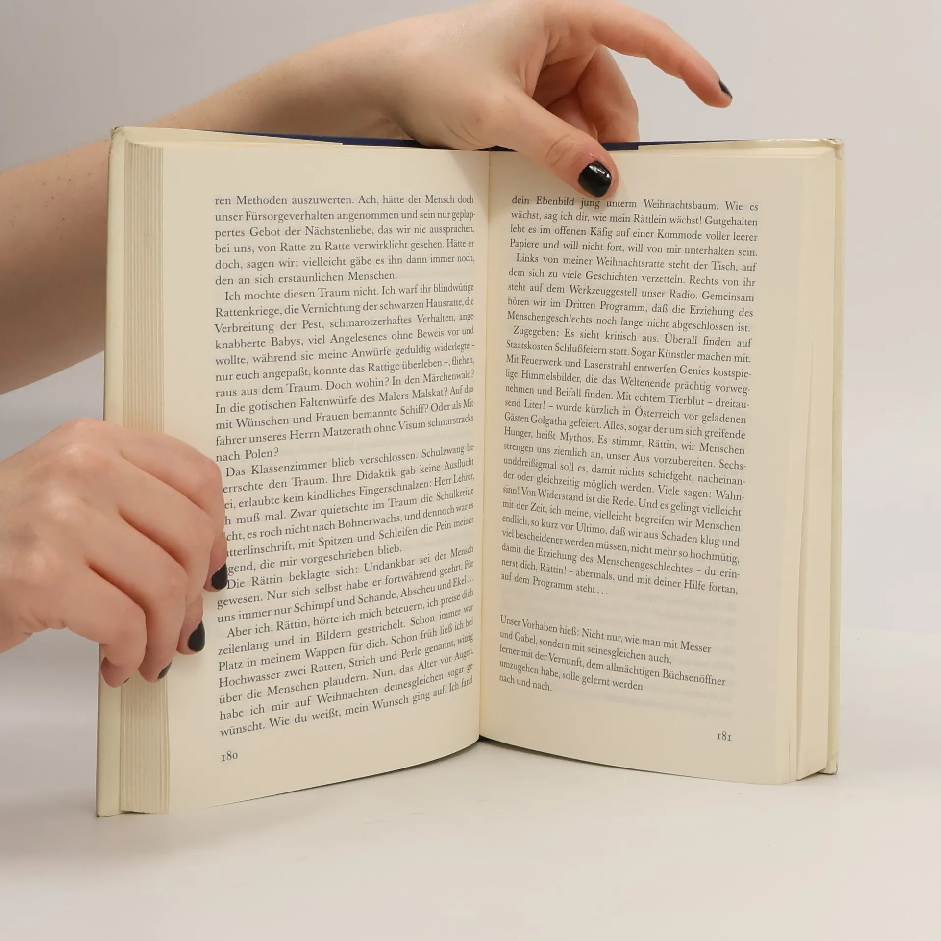 ”Auf Weihnachten wünschte ich eine Ratte mir.“ In den Träumen des Erzählers kann das Tier sprechen und zwingt ihm die Vision vom Untergang der Menschheit und der Übernahme der Herrschaft auf Erden durch Ratten auf. Sie allein haben in der von Neutronenbomben getroffenen Stadt Gdansk-Danzig überlebt und bauen dort auf eine Solidarität gegründete neue Zivilisation auf. Gegen diese apokalyptischen Visionen entwickelt der Erzähler seine eigenen Geschichten, teils als Filmskripte für den zum Medienzar avancierten Oskar Matzerath: vom Maler Malskat und der falschen Restauration der 50er Jahre, von den toten Wäldern und der sterbenden Kraft der Märchen und von fünf geliebten Frauen, die sich in der quallenverseuchten Ostsee auf die vergebliche Suche nach Vineta als Ort weiblicher Utopie machen.