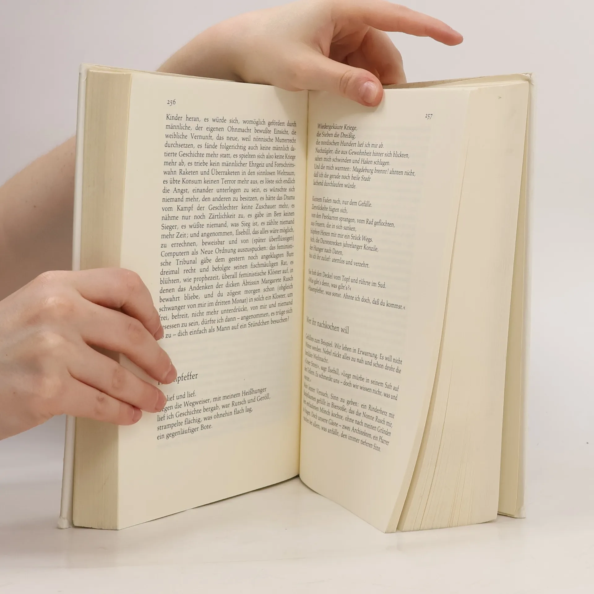 Im Gegensatz zum Märchen vom Fischer und seiner Frau ist es im > Butt Die Geschichte reicht von den blutigen Köpfen, die sich die Männer der steinzeitlichen Horden gegenseitig schlagen, bis zu den Interkontinentalraketen unseres Jahrhunderts. 400 Jahre Männergeschichte als sinnloser Reigen der Gewalt werden in der Danziger Bucht vom Autor, Erzähler und unsterblichen Märchenhelden selbst erlebt, während Ilsebill, seine jetzige Geliebte und Partnerin zu allen Zeiten, in Gestalt von neun und mehr Köchinnen für den wirklichen Fortschritt sorgt: die Beseitigung des Hungers. Den abgewirtschafteten Männern und dem Butt eröffnet ein Frauentribunal 1974 in Berlin den Prozeß, denn jetzt wollen die Frauen Geschichte machen. Hoffnung verspricht aber nur die gemeinsame Emanzipation zu etwas Drittem. Und dieses Dritte konkretisiert sich zugleich in einem Kind, das am Anfang des Buches gezeugt und nach neun Kapiteln, der gescheiterten Beziehung der Eltern zum Trotz, unbekümmert geboren wird. Anthony Burgess pries diese ”Phantasie“ als ”eine Feier des Lebens in seiner ganzen krassen Eigenart..., mit der Grass die Deutschen vor den Abstraktionen warnen will, die sie allzu oft im nordischen Nebel umhertappen ließen.“