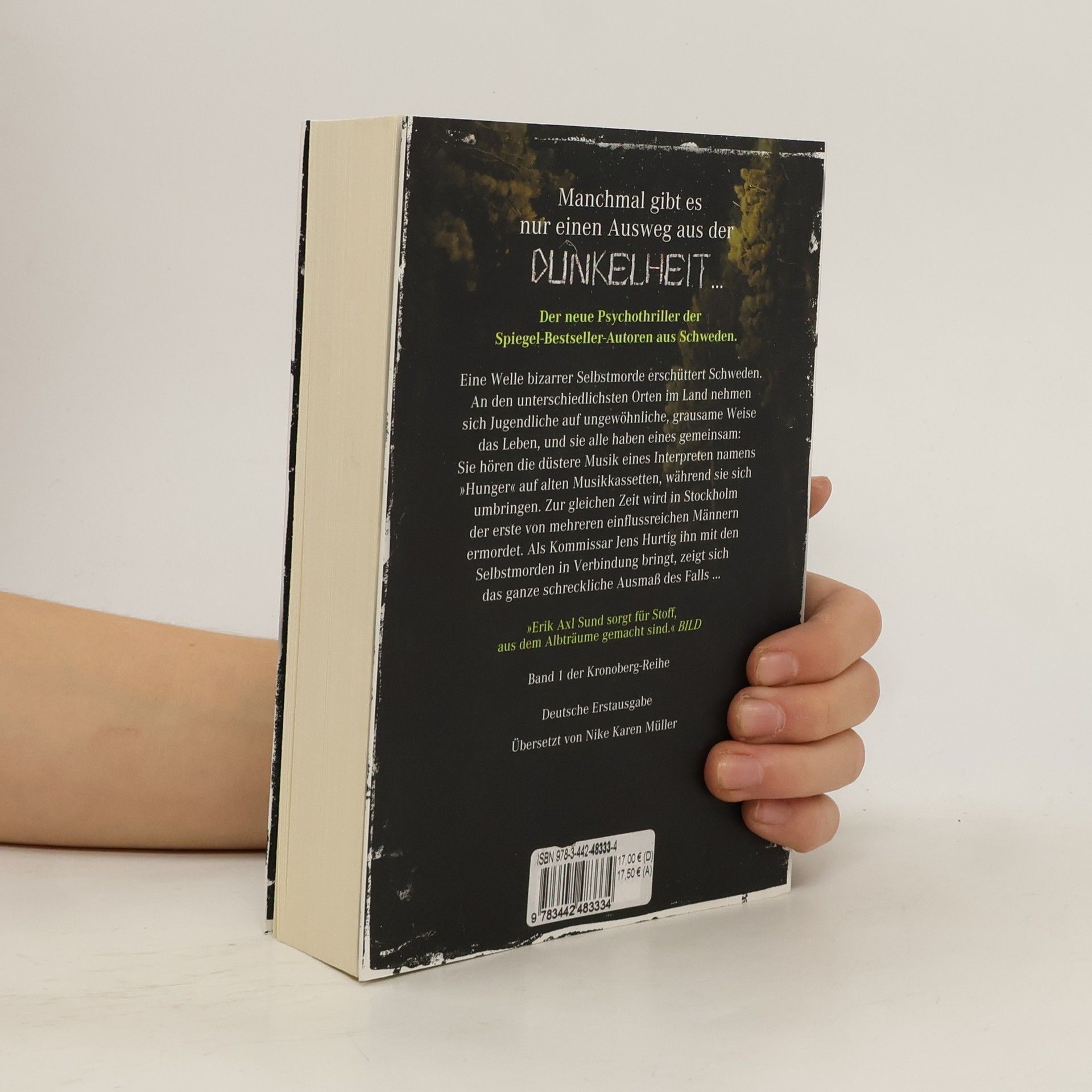 Der erste, in sich abgeschlossene Band der neuen Kronoberg-Reihe. Eine Welle bizarrer Selbstmorde erschüttert Schweden. An den unterschiedlichsten Orten im Land nehmen sich Jugendliche auf ungewöhnliche, grausame Weise das Leben, und sie alle haben eines gemeinsam: Sie hören die düstere Musik eines Interpreten namens „Hunger“ auf alten Musikkassetten, während sie sich umbringen. Zur gleichen Zeit wird in Stockholm der erste von mehreren einflussreichen Männern ermordet. Als Kommissar Jens Hurtig ihn mit den Selbstmorden in Verbindung bringt, zeigt sich das ganze schreckliche Ausmaß des Falls ... Ausstattung: eingelegtes Lesezeichen