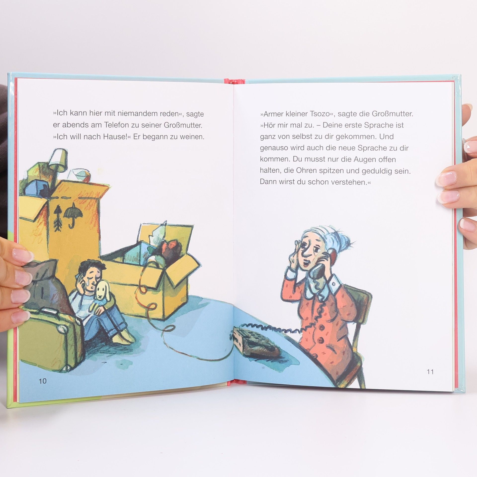Die neue Sprache ist wie ein wilder Mustang, sagt Tsozos Oma. Dank ihr gibt Tsozo nicht auf. Mit viel Geduld und Aufmerksamkeit gelingt es ihm schließlich, die neuen Wörter zu zähmen. Tsozo zieht mit seinen Eltern weg aus seinem Dorf in ein anderes Land, in dem alles neu ist, vor allem aber die Sprache. Er versteht die fremde Sprache nicht, ist traurig und sehnt sich nach der alten Heimat. Seine Oma rät ihm am Telefon: Mach die Augen auf, spitze die Ohren und hab Geduld, dann wird die neue Sprache zu dir kommen. Auf dem Spielplatz lernt Tsozo drei Kinder kennen, von denen er die ersten Wörter lernt. Als seine neuen Freunde wenig später in Gefahr geraten, zeigt sich, dass seine Oma recht hatte. Tsozo kann sich in der neuen Sprache verständigen und Hilfe holen.
