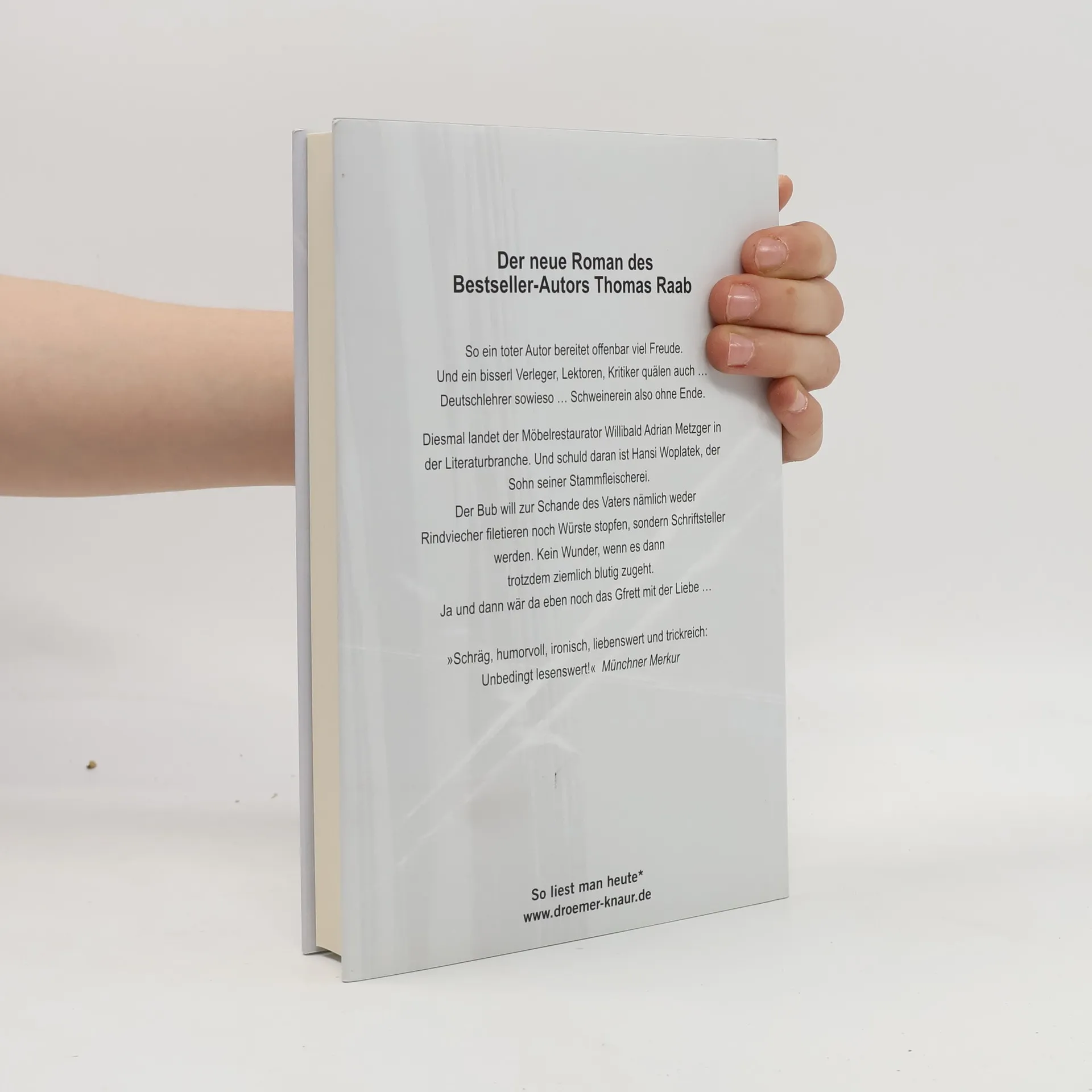 Der neue Kriminalroman des Bestsellerautors Thomas Raab! So ein toter Autor bereitet offenbar viel Freude. Und ein bisserl Verleger, Lektoren, Kritiker quälen auch … Deutsch-Lehrer sowieso. Schweinereien also ohne Ende. Diesmal landet der Möbelrestaurator Willibald Adrian Metzger in der Literaturbranche. Und Schuld daran ist Hansi Woplatek, der Sohn seiner Stammfleischerei. Der Bub will zur Schande des Vaters nämlich weder Rindviecher filetieren, noch Würste stopfen, sondern Schriftsteller werden. Kein Wunder, wenn es dann trotzdem ziemlich blutig zugeht. Ja und dann wär da eben noch das Gfrett mit der Liebe …