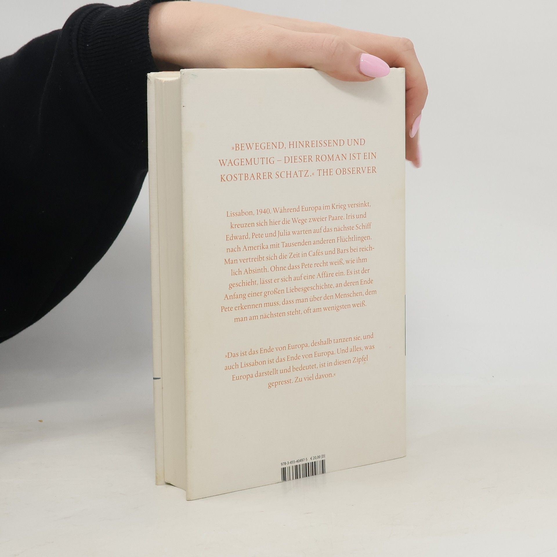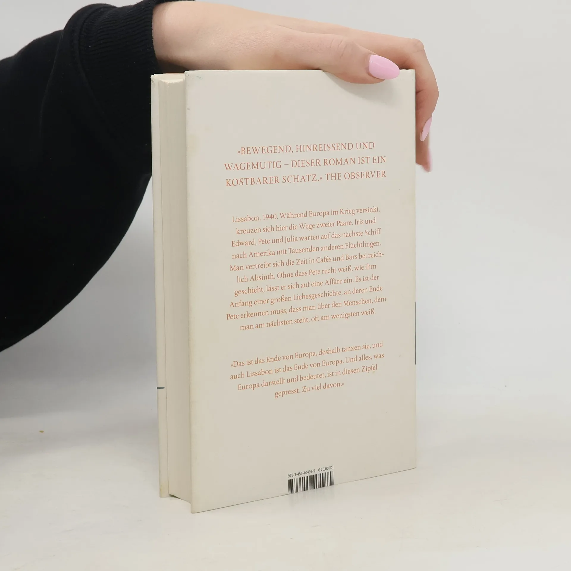 Lissabon, 1940: Während Europa im Krieg versinkt, kreuzen sich hier die Wege zweier Paare mit fatalen Konsequenzen. Man wartet auf das nächste Schiff nach Amerika mit Tausenden anderer Flüchtlinge und vertreibt sich die Zeit in Cafés und Bars bei reichlich Absinth: „Das ist das Ende von Europa, deshalb tanzen sie, und auch Lissabon ist das Ende von Europa. Und alles, was Europa darstellt und bedeutet, ist in diesen Zipfel gepresst. Zu viel davon.“Anders als seine skeptische Frau Julia ist Pete Winters sofort fasziniert von Iris und Edward Freleng und ihrer glamourösen, freien Lebensart. Aus Faszination wird bald Liebe. Ohne dass er recht weiß, wie ihm geschieht, lässt sich Pete auf eine unmögliche Affäre ein. Es ist der Anfang einer großen Liebesgeschichte Während Europa dem Abgrund entgegentaumelt, wandeln sich die Beziehungen dieser vier Menschen auf dramatische Weise. Und zuletzt begreift Pete, dass man über den Menschen, dem man am nächsten steht, oft am wenigsten weiß.