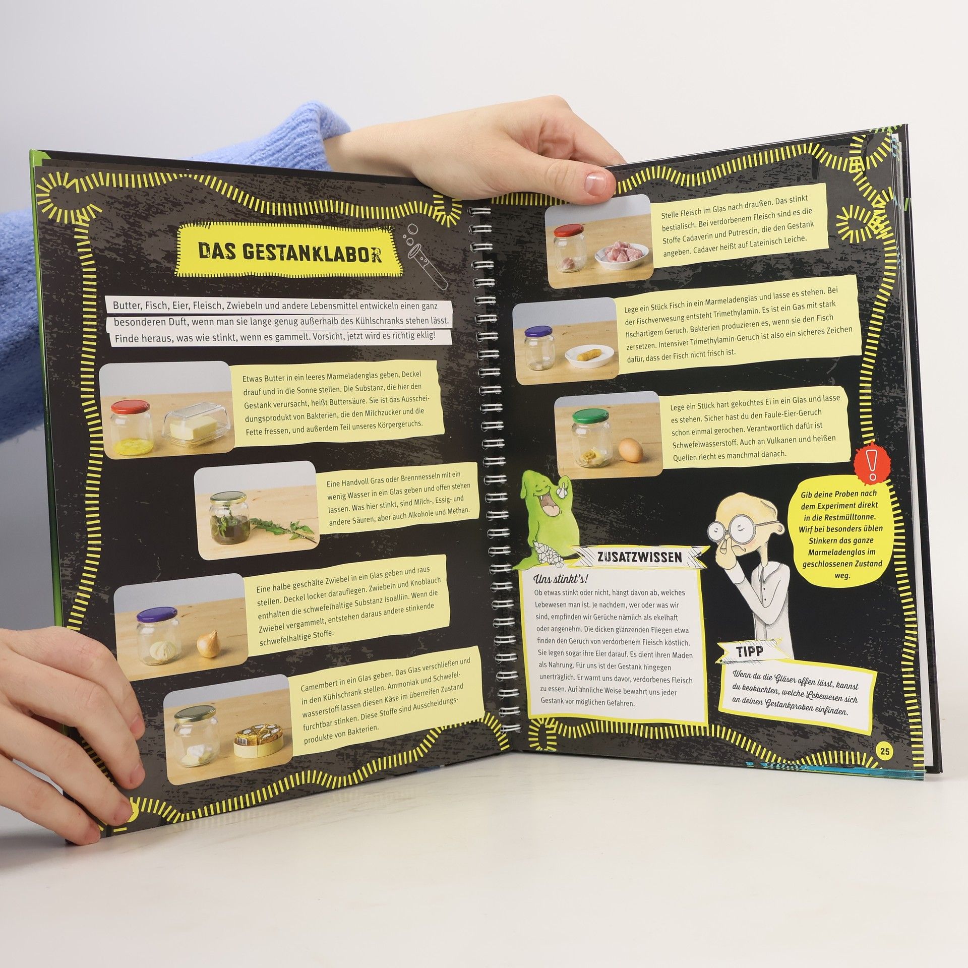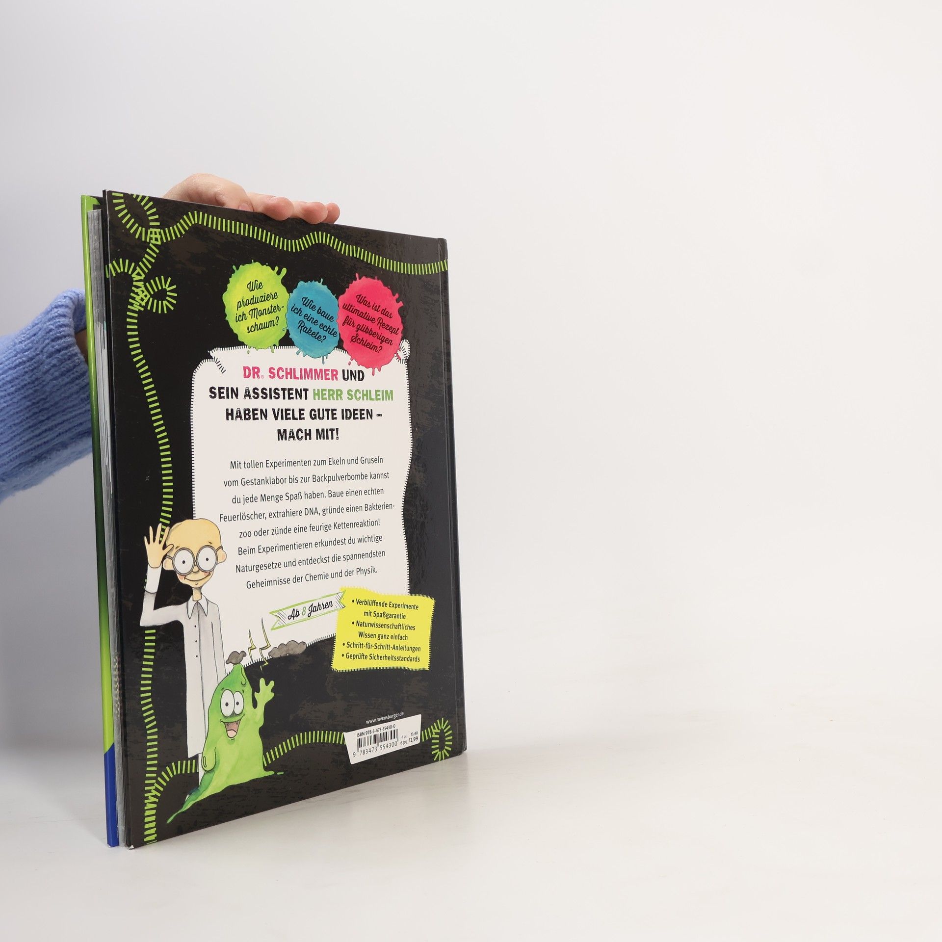 Es stinkt, blubbert und kracht, wenn Dr. Schlimmer und sein Assistent Herr Schleim mit ihren verrückten und spektakulären Experimenten loslegen. Sie erklären, wie man Monsterschaum produziert, verraten das ultimative Rezept für glibberigen Schleim und bauen eine Backpulverbombe sowie eine echte Rakete. Bei den 30 anschaulich erklärten Versuchen kommen Materialien aus dem Haushalt zum Einsatz, sodass kleine Forscher sofort loslegen können. Wissenschaftliche Experimente für zu Hause und für die Schule. Dieses Buch bietet Experimente mit Gelinggarantie. Nachwuchsforscher basteln eine Brausepulverrakete, erkunden die Geheimnisse des Hefeteigs oder bringen eine Energiesparlampe ohne Strom zum Leuchten. Dabei lernen Sie jede Menge über naturwissenschaftliche Zusammenhänge und Phänomene (Stichwort MINT-Bildung) kennen, etwa wenn sie eine nicht-newtonsche Flüssigkeit anrühren, die DNS einer Banane extrahieren oder einen Wirbelgleiter basteln. Dr. Schleim, das durchgeknallte Universalgenie, und sein kleiner grüner Assistent Schleim sorgen dafür, dass die Leser dabei jede Menge Spaß haben.