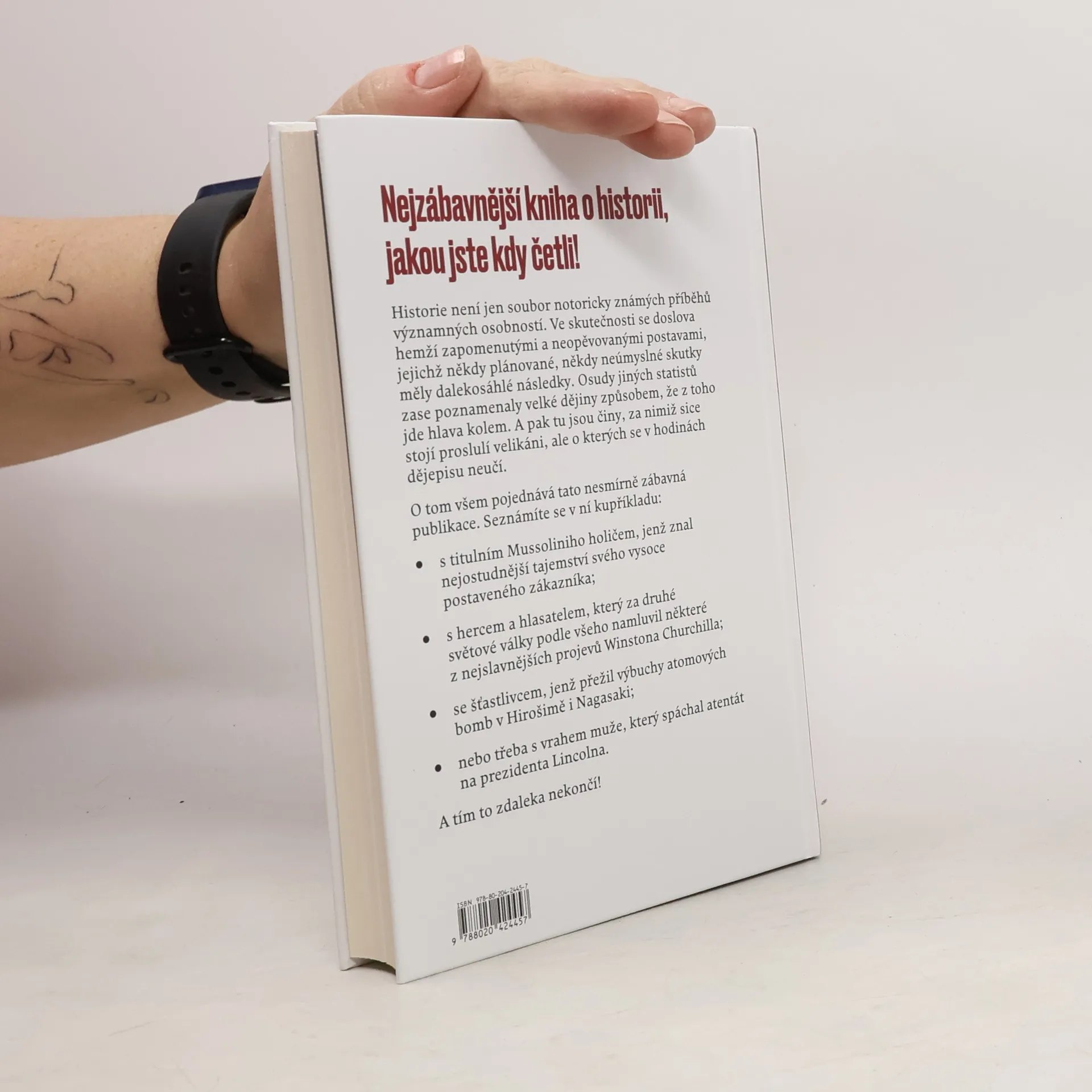 Historie není jen soubor notoricky známých příběhů významných osobností. Ve skutečnosti se doslova hemží zapomenutými a neopěvovanými postavami, jejichž někdy plánované, někdy neúmyslné skutky měly dalekosáhlé následky. Osudy jiných statistů zase poznamenaly velké dějiny způsobem, že z toho jde hlava kolem. A pak tu jsou činy, za nimiž sice stojí proslulí velikáni, ale o kterých se v hodinách dějepisu z nejrůznějších důvodů neučí. O tom všem pojednává tato nesmírně zábavná publikace. Seznámíte se v ní kupříkladu s titulním Mussoliniho holičem, jenž znal nejostudnější tajemství svého vysoce postaveného zákazníka; s hercem a hlasatelem, který za druhé světové války podle všeho namluvil některé z nejslavnějších projevů Winstona Churchilla; se šťastlivcem, jenž přežil výbuchy atomových bomb v Hirošimě i Nagasaki; nebo třeba s vrahem muže, který spáchal atentát na prezidenta Lincolna. A tím to zdaleka nekončí! Vydejte se s námi do zákulisí novodobé historie a odhalte zcela nové stránky zdánlivě dobře známých událostí.