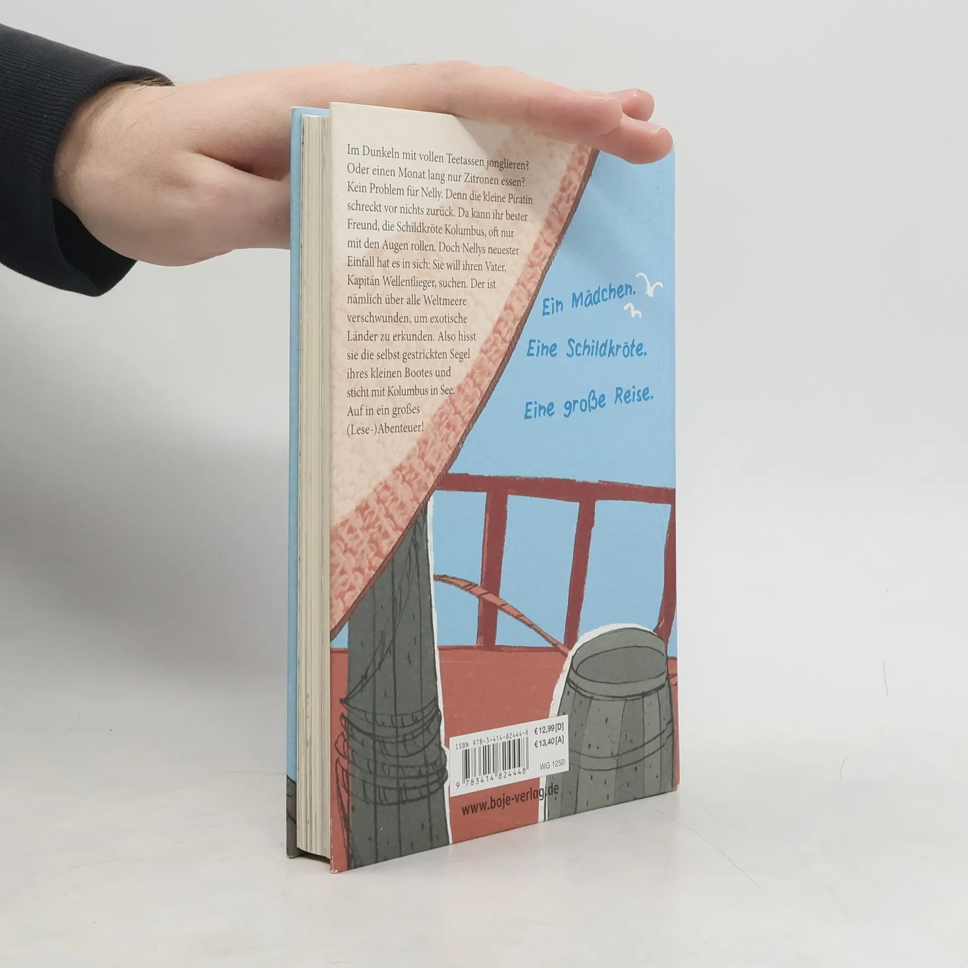 Im Dunkeln mit vollen Teetassen jonglieren? Oder einen Monat lang nur Zitronen essen? Kein Problem für Nelly. Denn die kleine Piratin schreckt vor nichts zurück. Da kann ihr bester Freund, die Schildkröte Kolumbus, oft nur mit den Augen rollen. Doch Nellys neuster Einfall hat es in sich: Sie will ihren Vater, Kapitän Wellenflieger, suchen. Der ist nämlich über alle Weltmeere verschwunden, um exotische Länder zu erkunden. Also hisst sie die selbstgestrickten Segel ihres kleinen Bootes und sticht mit Kolumbus in See. Ein turbulentes Abenteuer mit vielen zweifarbigen Bildern